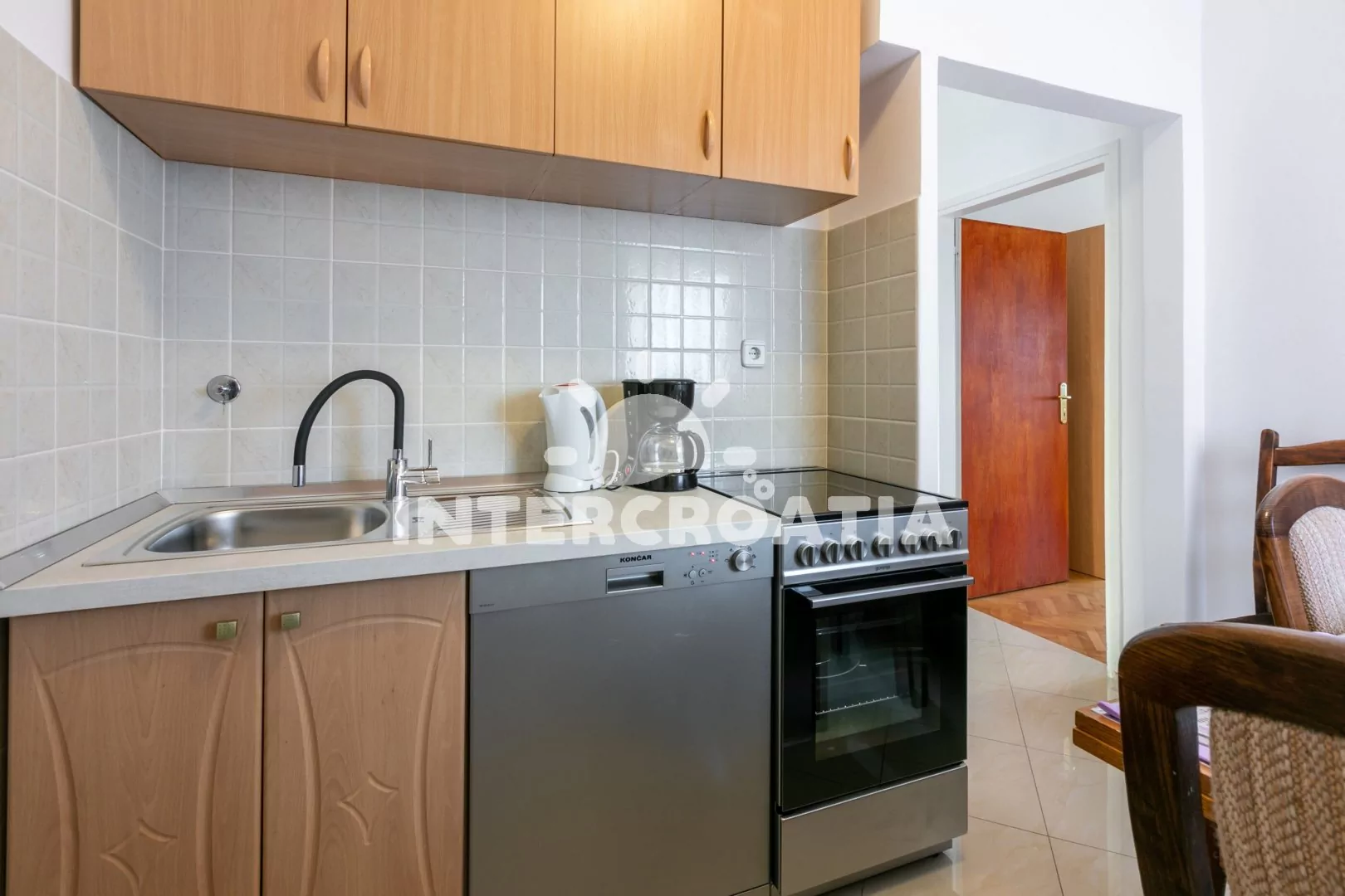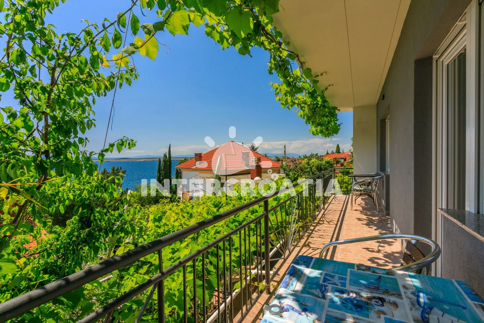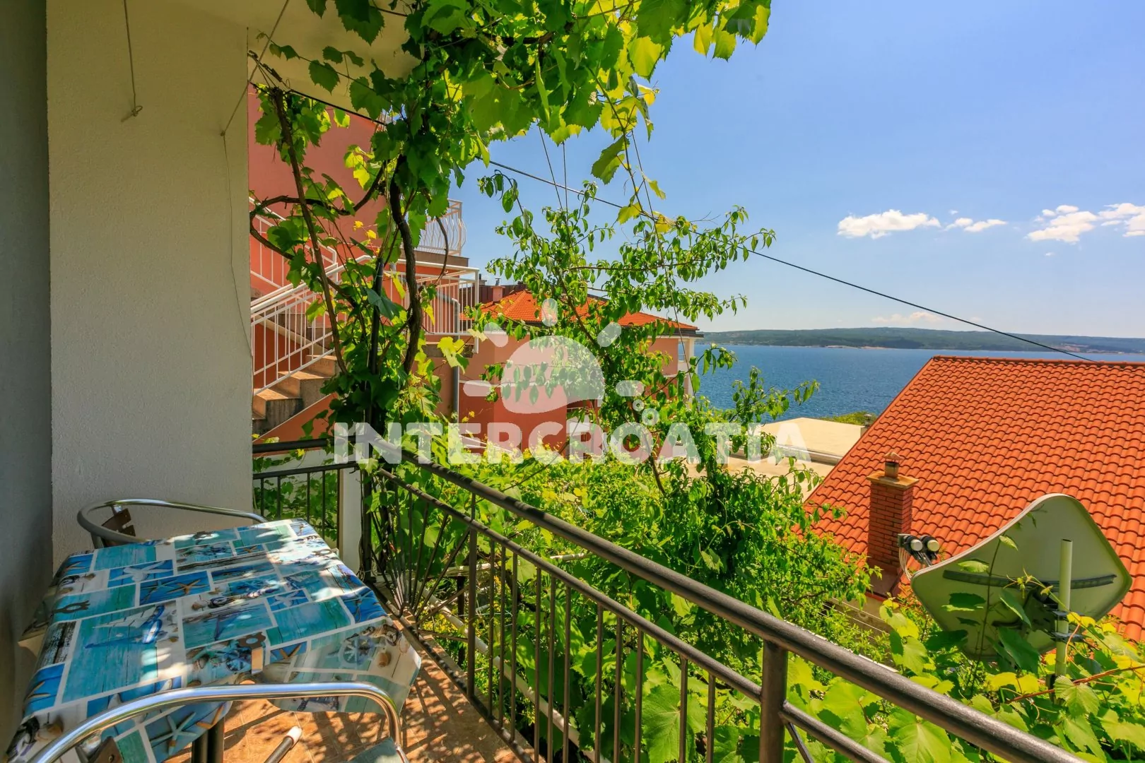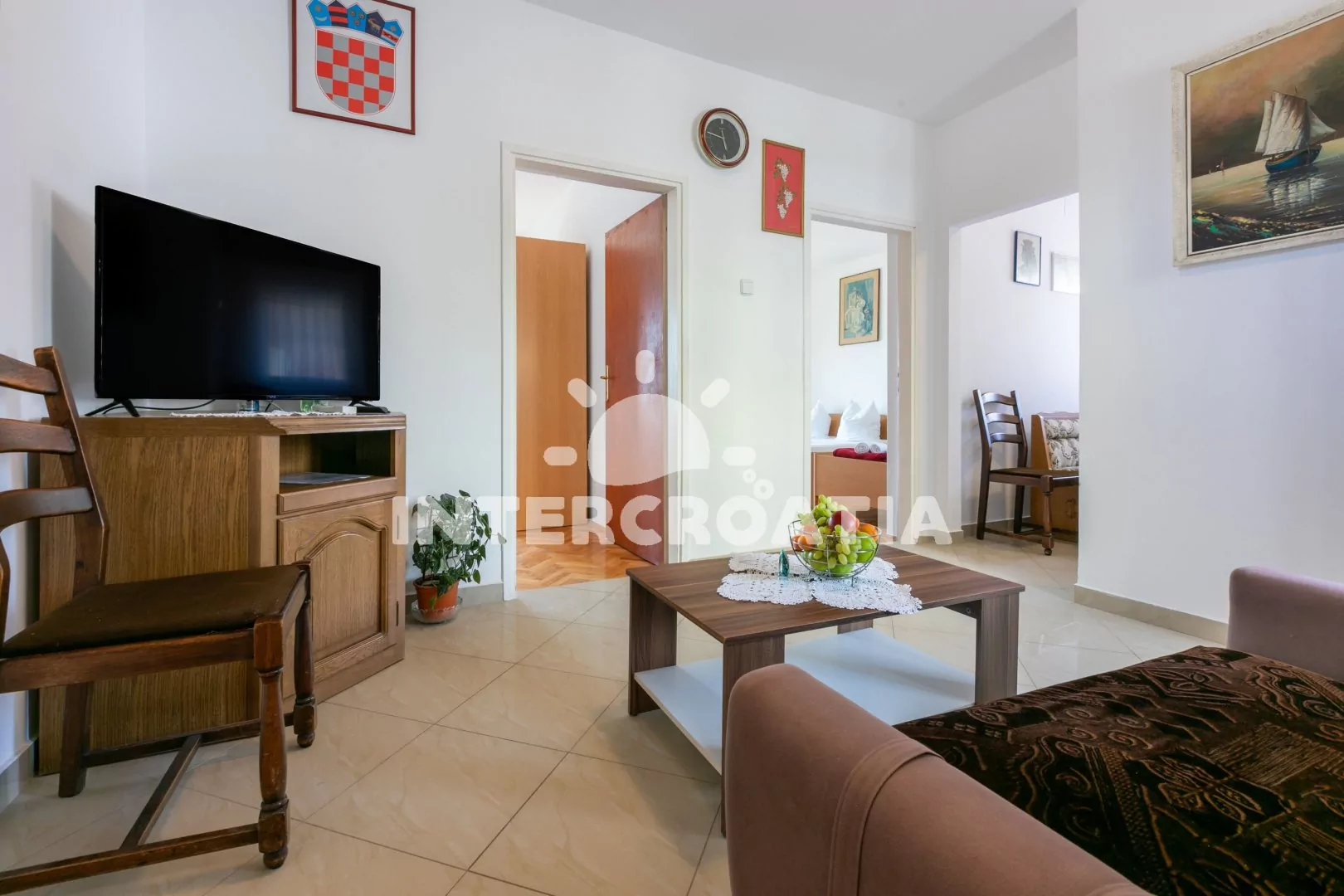 Apartmán (70 m2) s balkonem a výhledem na moře se nachází v 1. patře domu. Apartmán má 2 ložnice a je vhodný pro až 6 osob. Obývací pokoj je spojený s kuchyní. Kuchyňská linka je vybavena sporákem s troubou, myčkou na nádobí, rychlovarnou konvicí, mikrovlnnou troubou, kávovarem, nádobím a lednicí s mrazákem. Obývací pokoj s jídelním stolem, pohovkou, televizí se satelitním programem a klimatizací. První i druhá ložnice je vybavena vždy s dvoulůžkem, jednolůžkem a vstupem na balkon. Koupelna se sprchovým koutem, umyvadlem, fénem a wc. Hostům je k dispozici parkování u objektu zdarma.