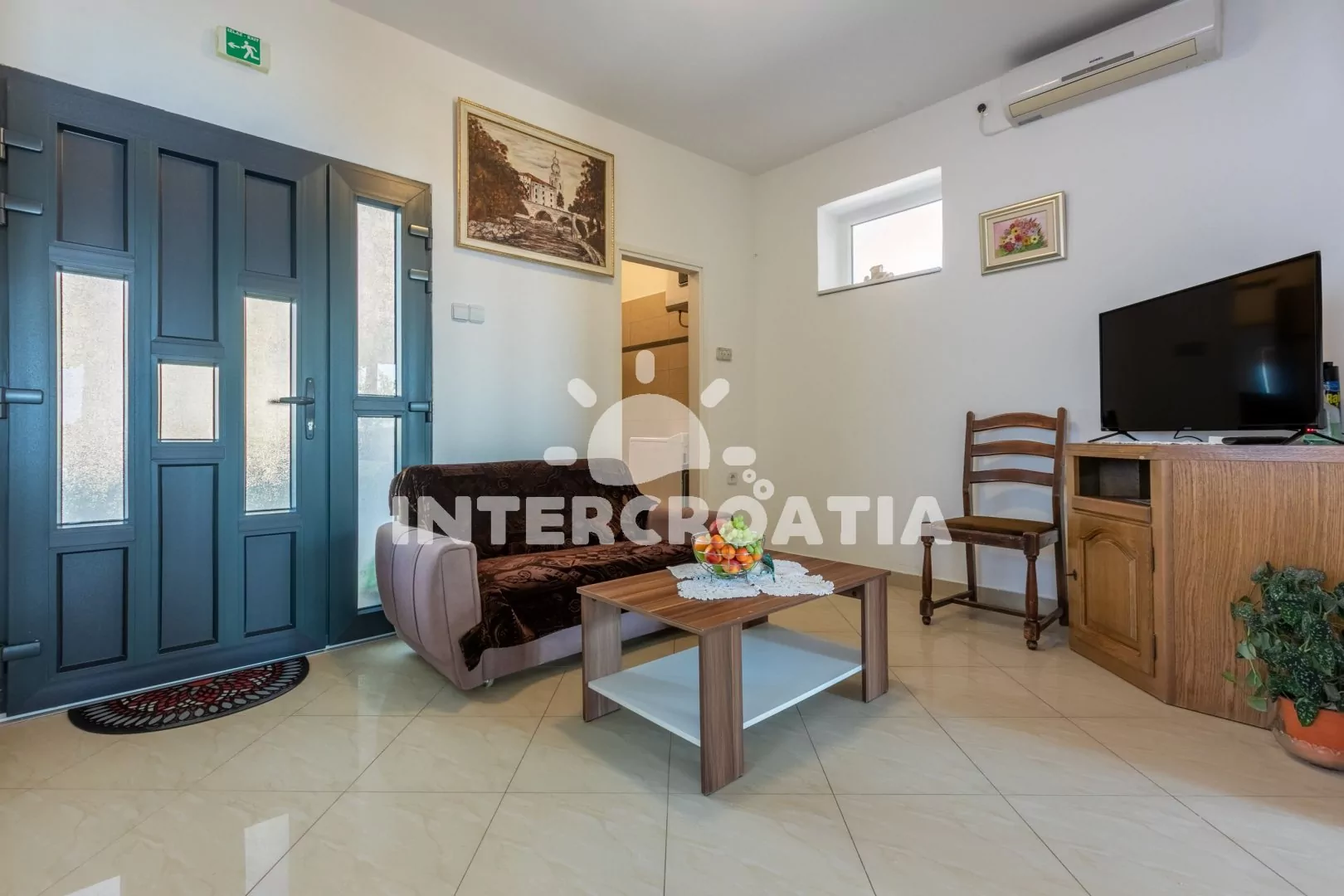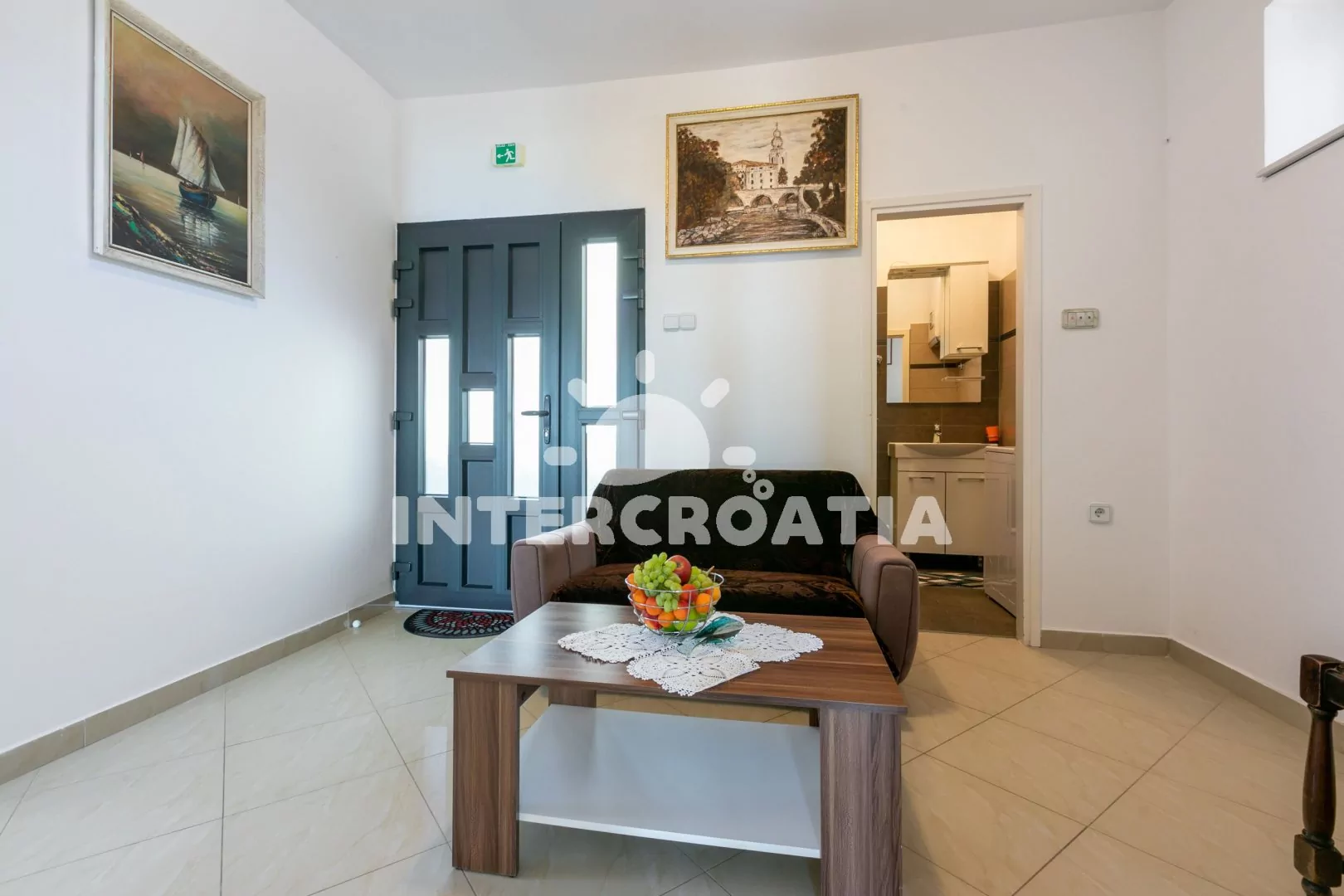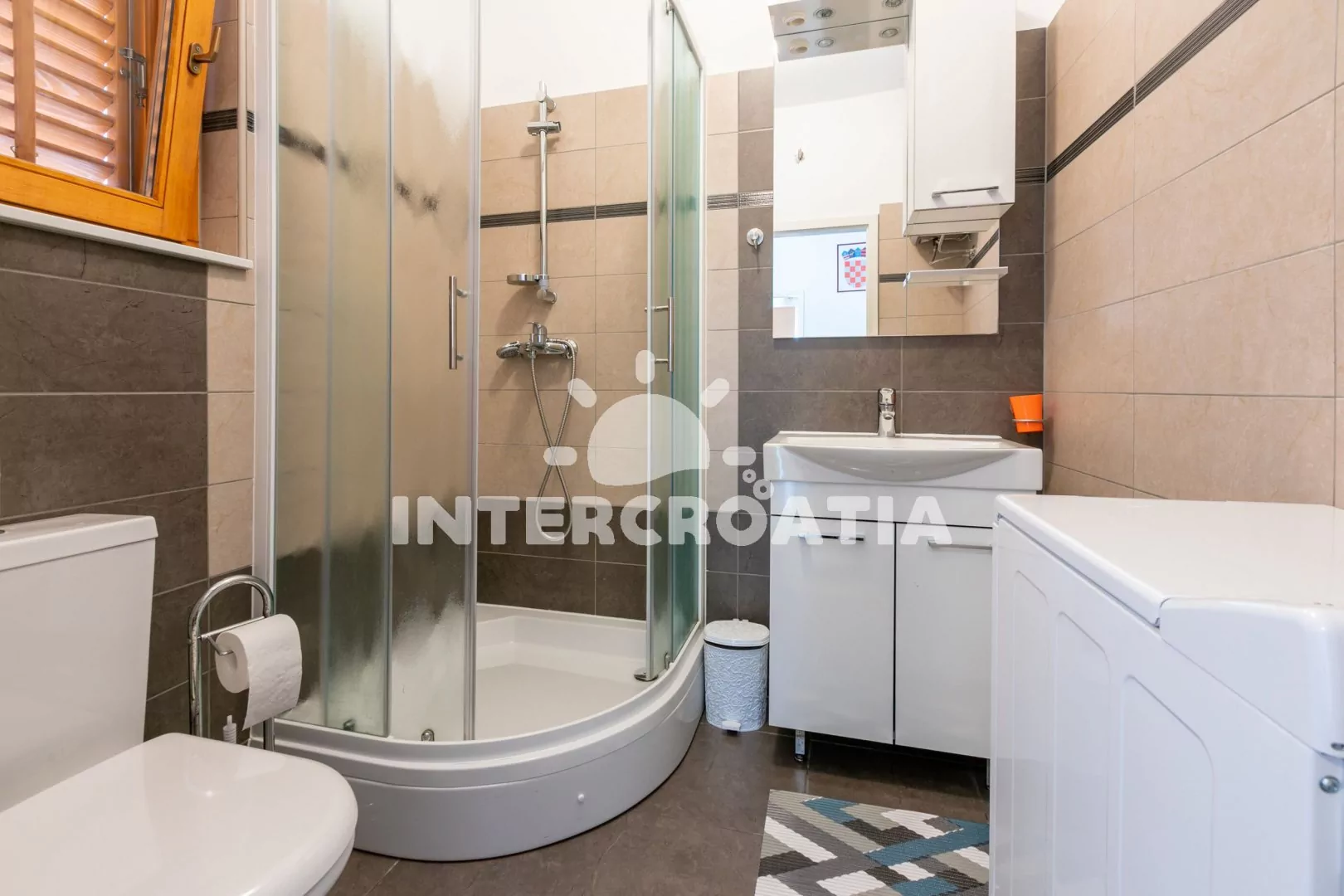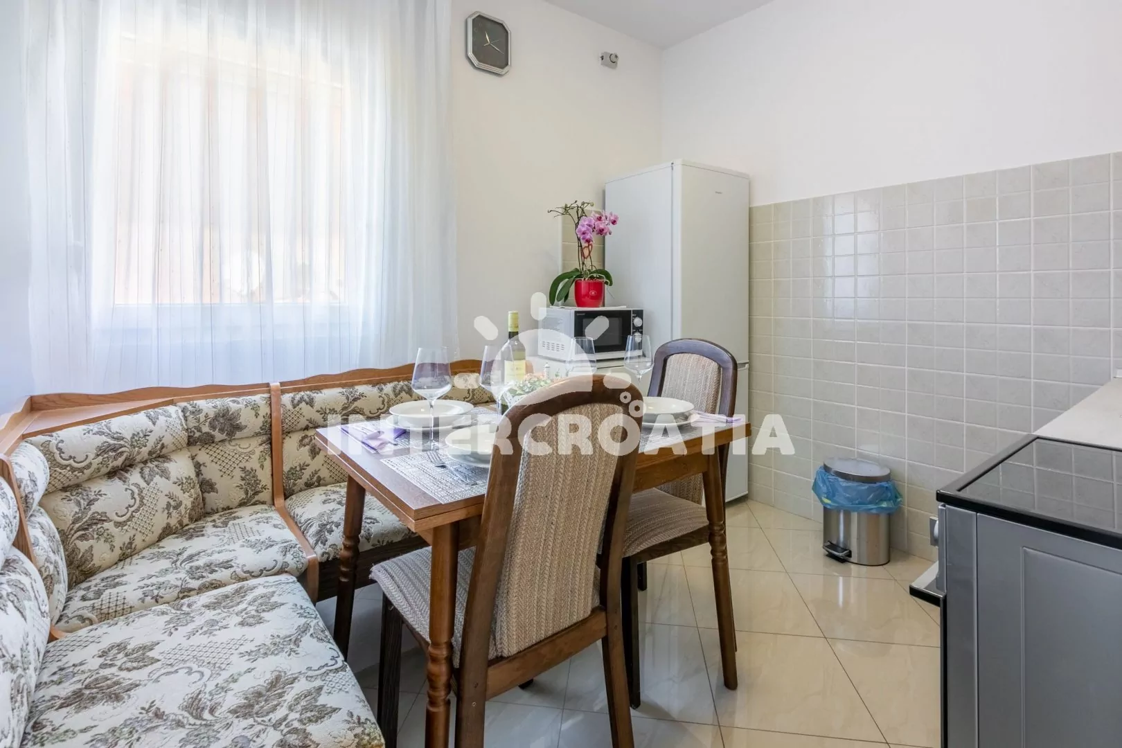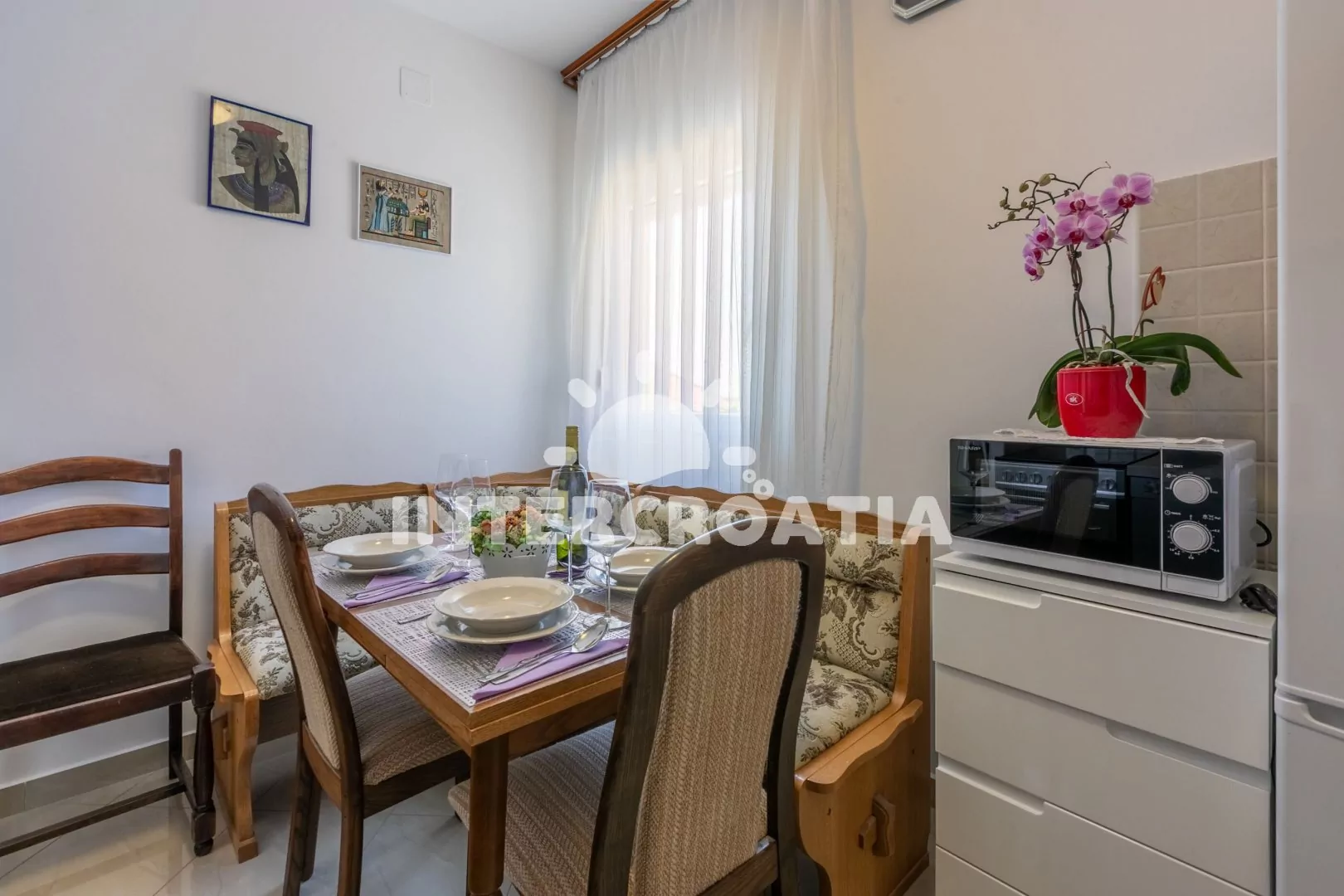 Apartmán (70 m2) s balkonem a výhledem na moře se nachází v 1. patře domu. Apartmán má 2 ložnice a je vhodný pro až 6 osob. Obývací pokoj je spojený s kuchyní. Kuchyňská linka je vybavena sporákem s troubou, myčkou na nádobí, rychlovarnou konvicí, mikrovlnnou troubou, kávovarem, nádobím a lednicí s mrazákem. Obývací pokoj s jídelním stolem, pohovkou, televizí se satelitním programem a klimatizací. První i druhá ložnice je vybavena vždy s dvoulůžkem, jednolůžkem a vstupem na balkon. Koupelna se sprchovým koutem, umyvadlem, fénem a wc. Hostům je k dispozici parkování u objektu zdarma.