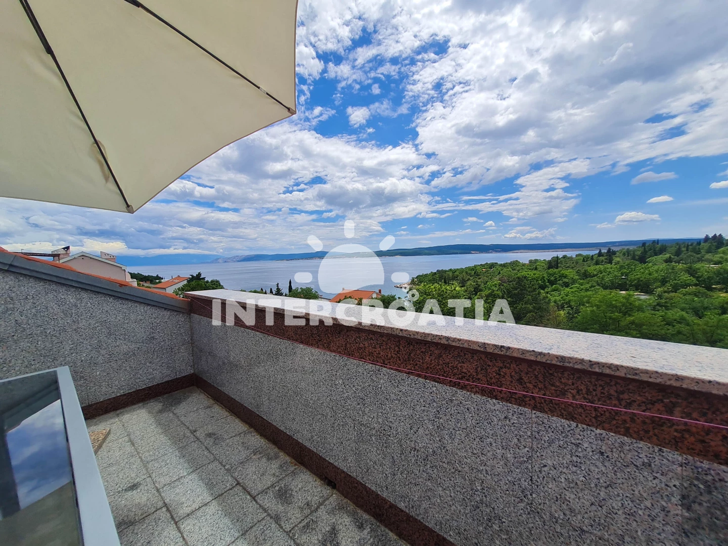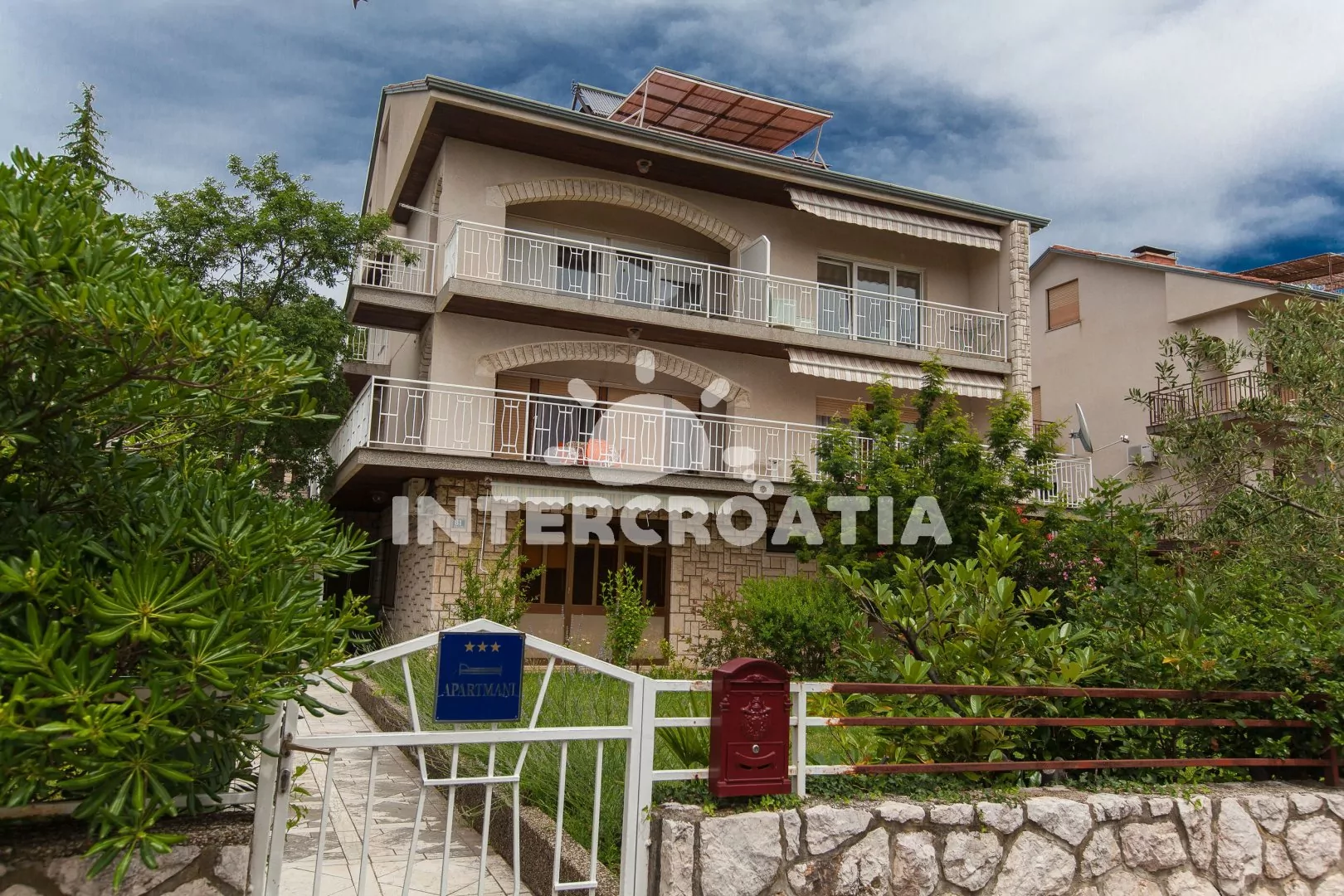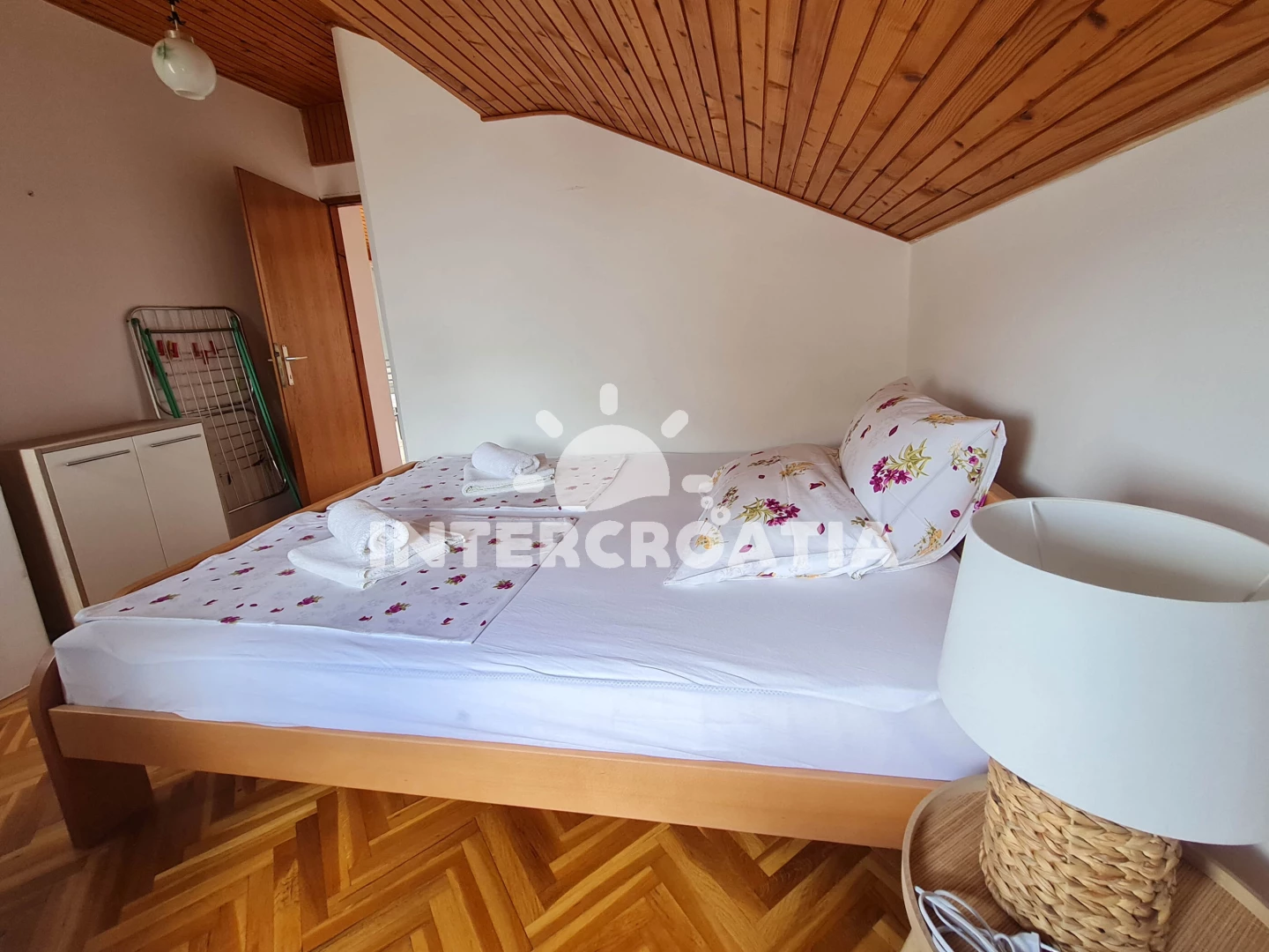 Podkrovní apartmán (75 m2) s terasou, venkovním posezením a výhledem na moře. Apartmán má 3 ložnice a je vhodný pro 6 až 7 osob. Obývací pokoj je spojený s kuchyní. Kuchyňská linka je vybavena varnou deskou, myčkou na nádobí, nádobím a lednicí s mrazákem. Obývací pokoj s jídelním stolem pro 6 osob, pohovkou, televizí se satelitním programem, klimatizací a vstupem na terasu. První ložnice s dvoulůžkem. Druhá ložnice s dvěma jednolůžky. Třetí ložnice s dvoulůžkem a přistýlkou. Koupelna se sprchovým koutem, umyvadlem a wc. Druhá koupelna s vanou, umyvadlem, bidetem a wc. Hostům je k dispozici parkování u objektu zdarma.