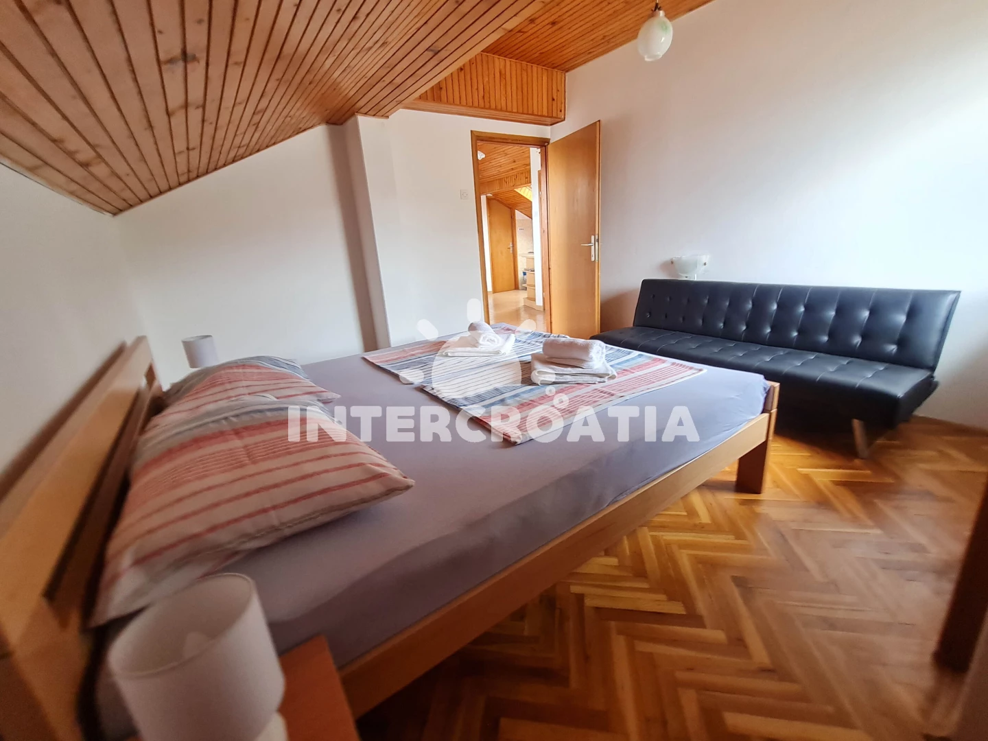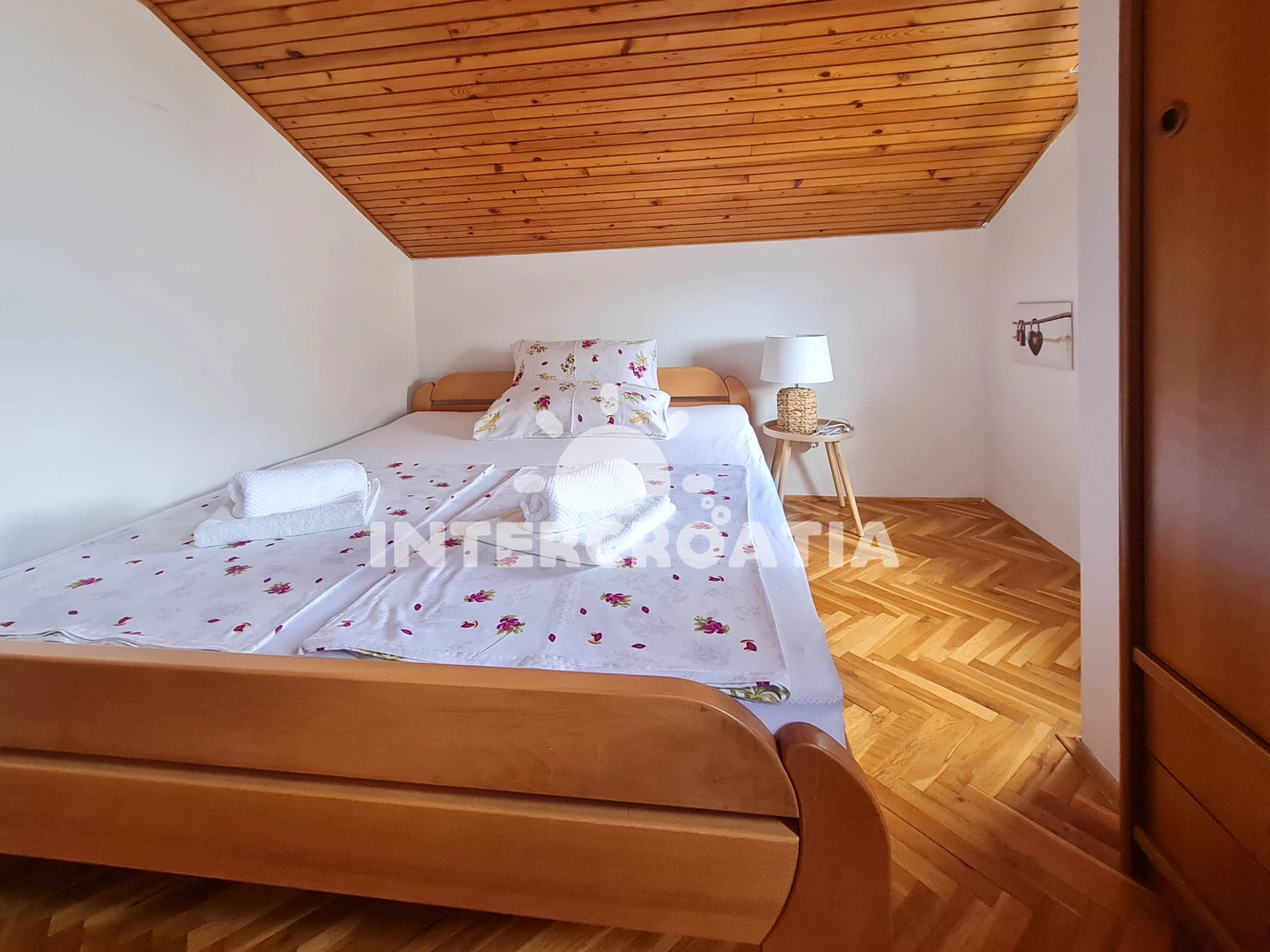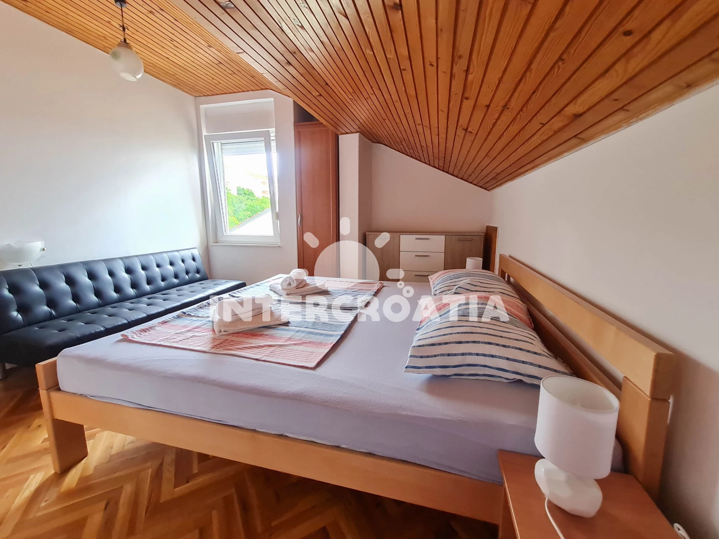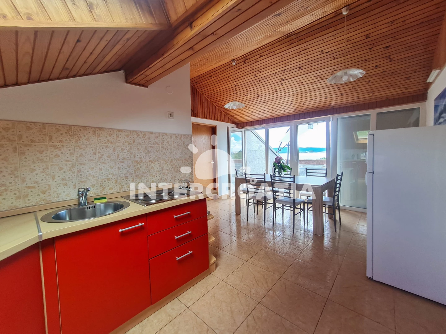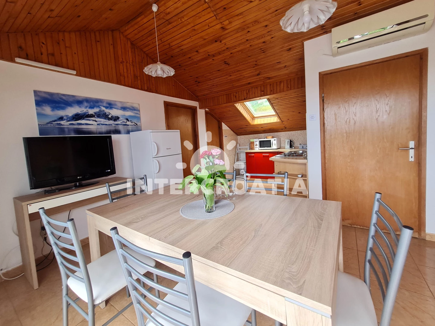 Podkrovní apartmán (75 m2) s terasou, venkovním posezením a výhledem na moře. Apartmán má 3 ložnice a je vhodný pro 6 až 7 osob. Obývací pokoj je spojený s kuchyní. Kuchyňská linka je vybavena varnou…