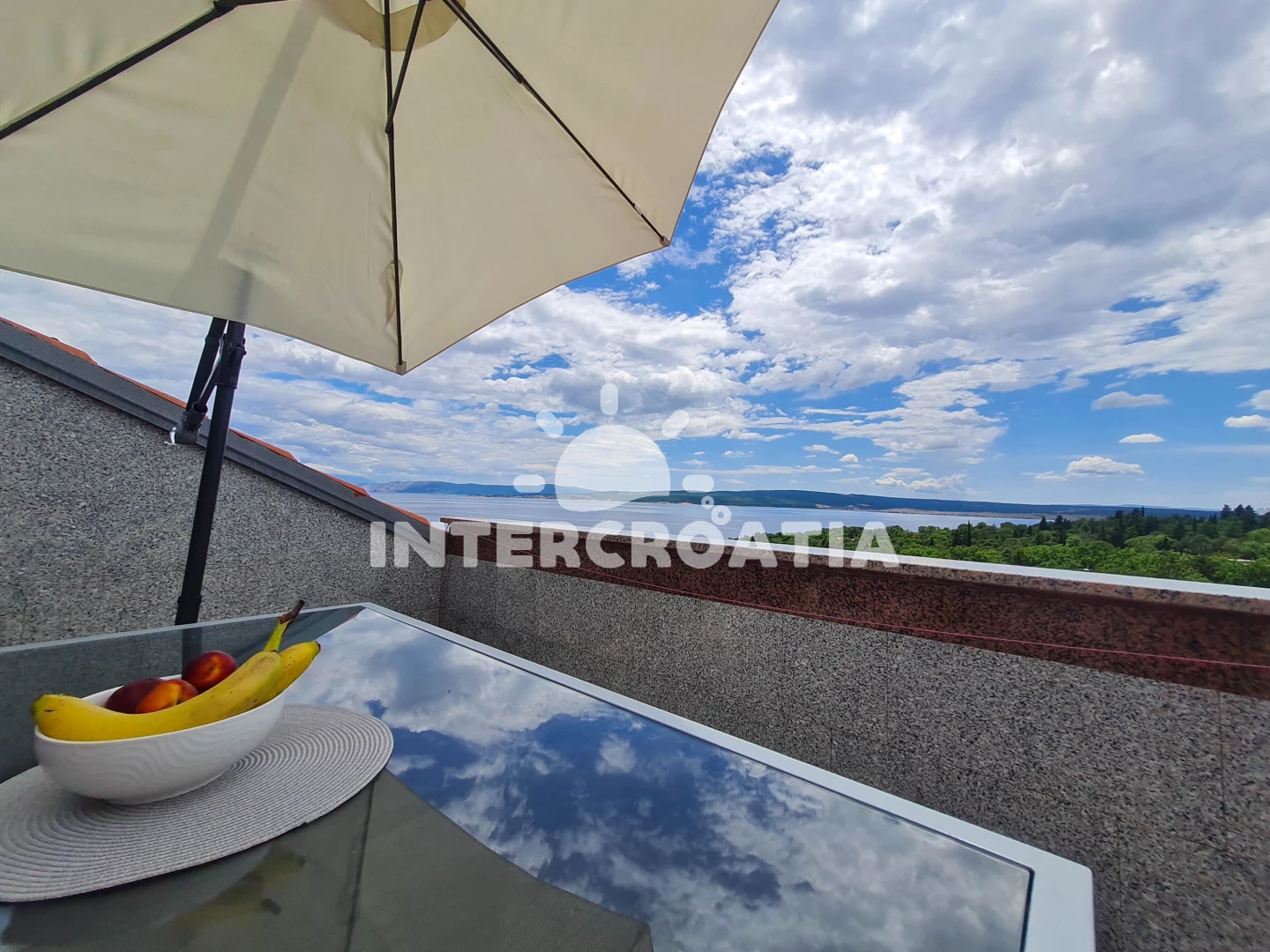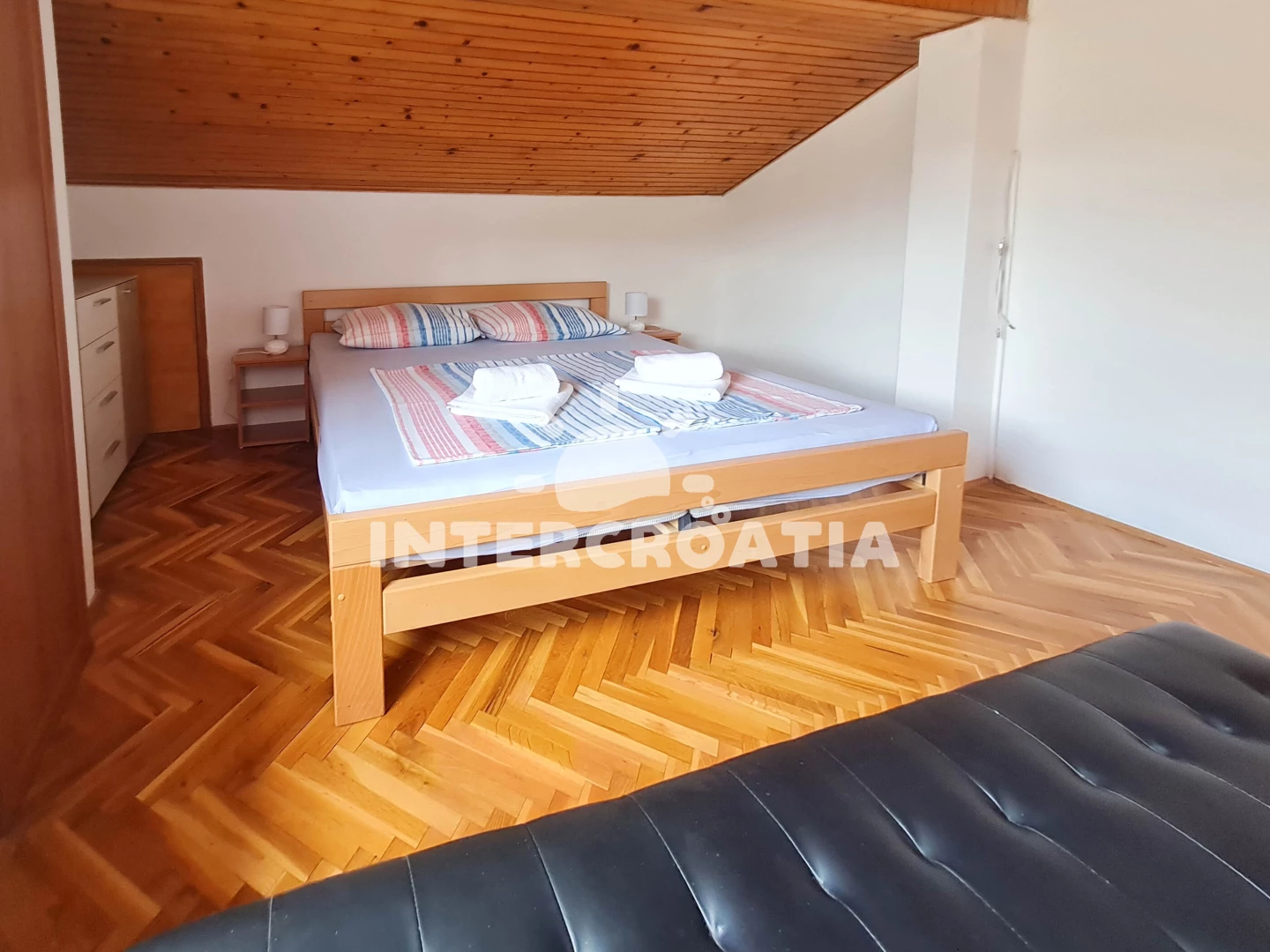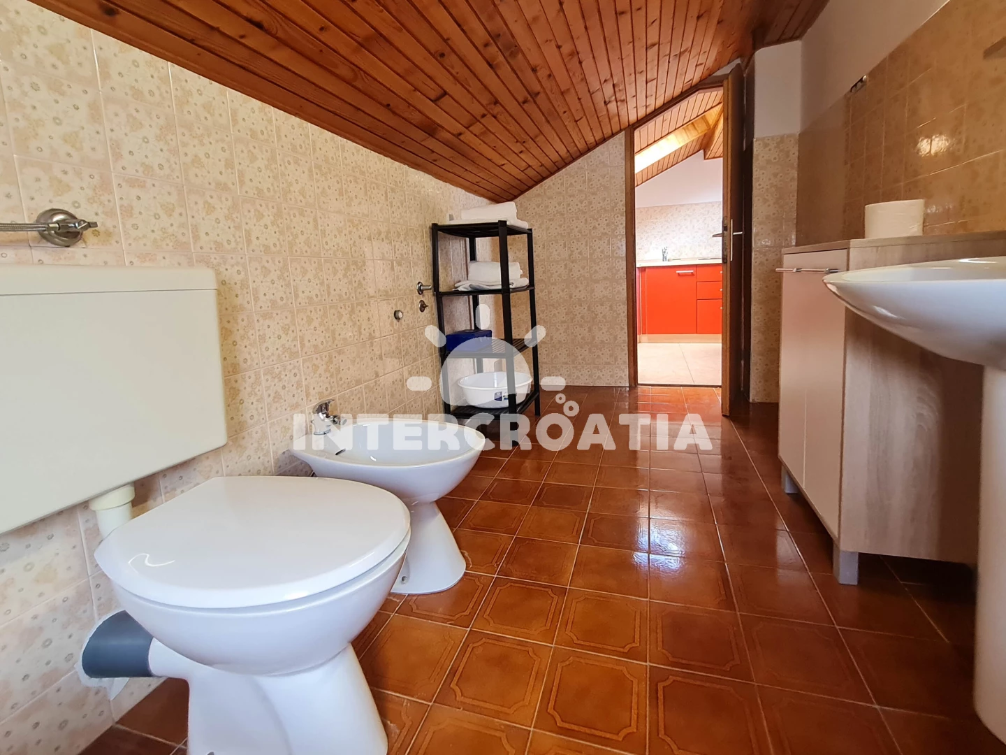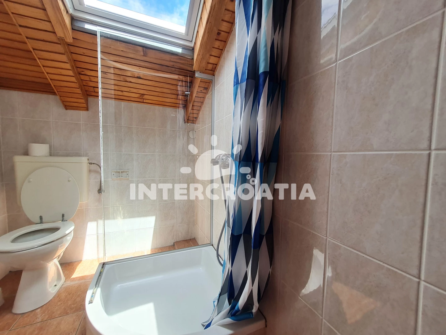Podkrovní apartmán (75 m2) s terasou, venkovním posezením a výhledem na moře. Apartmán má 3 ložnice a je vhodný pro 6 až 7 osob. Obývací pokoj je spojený s kuchyní. Kuchyňská linka je vybavena varnou…