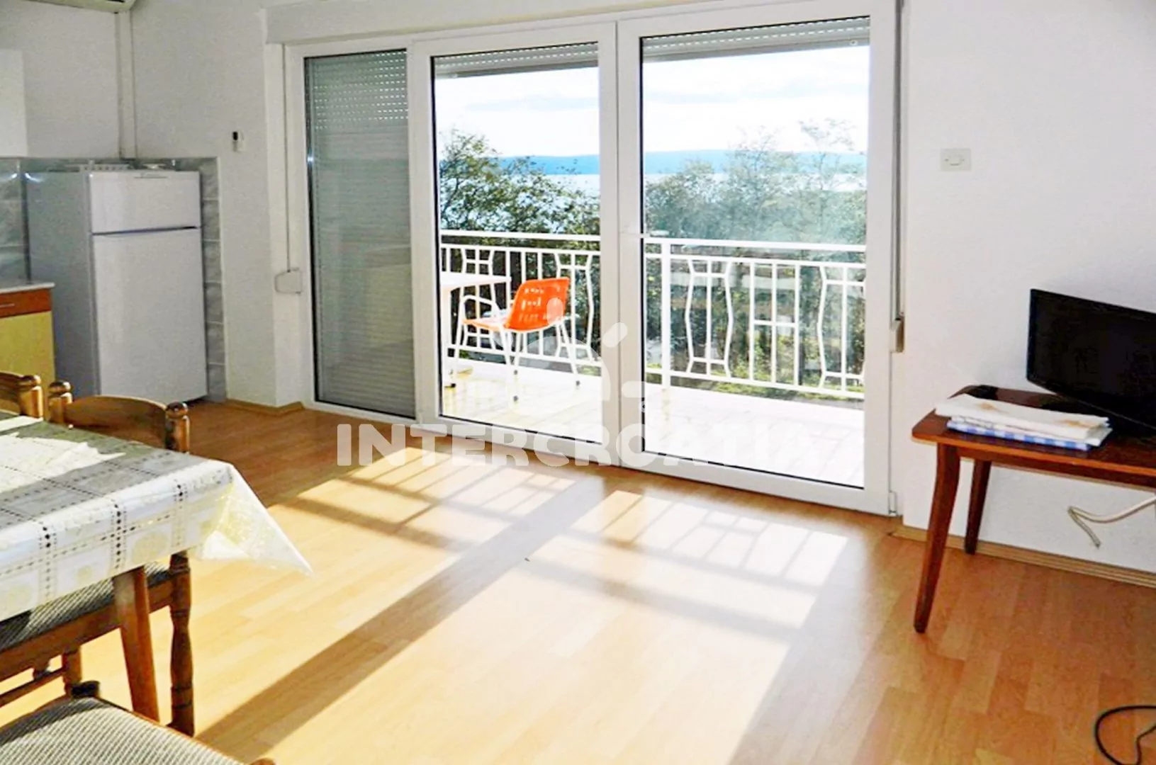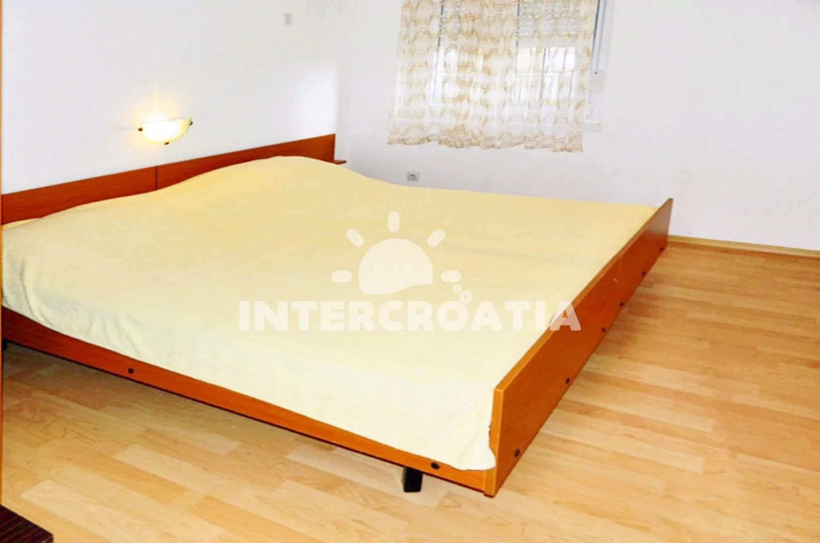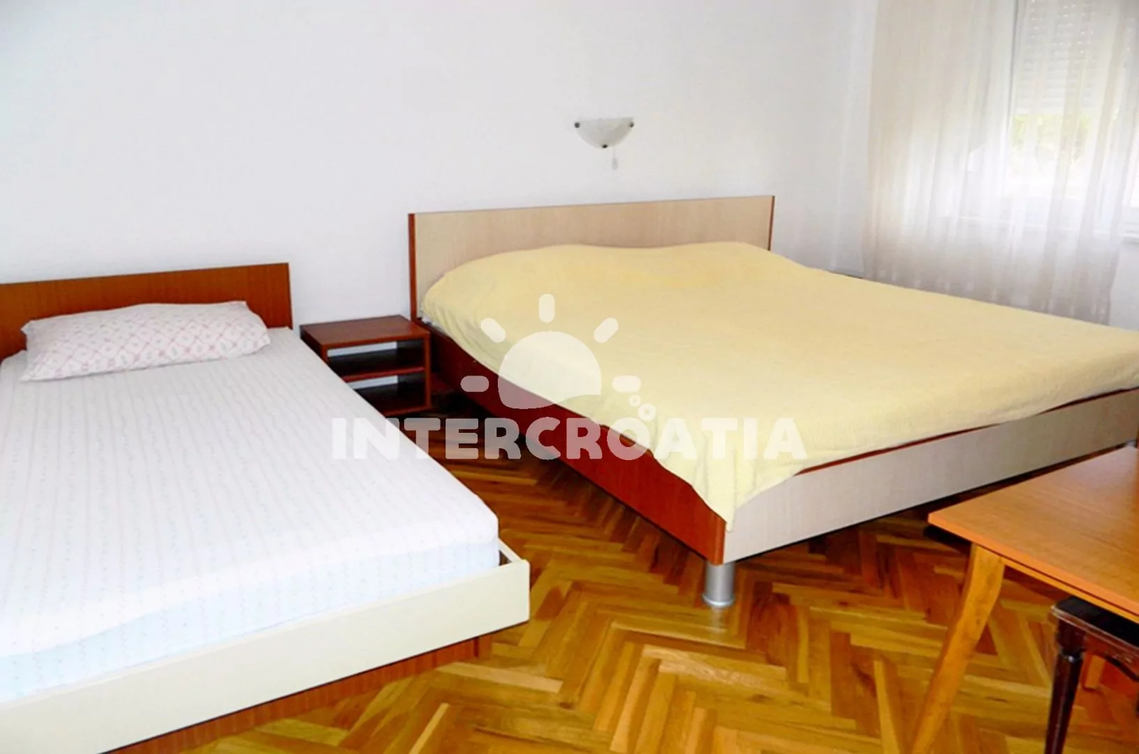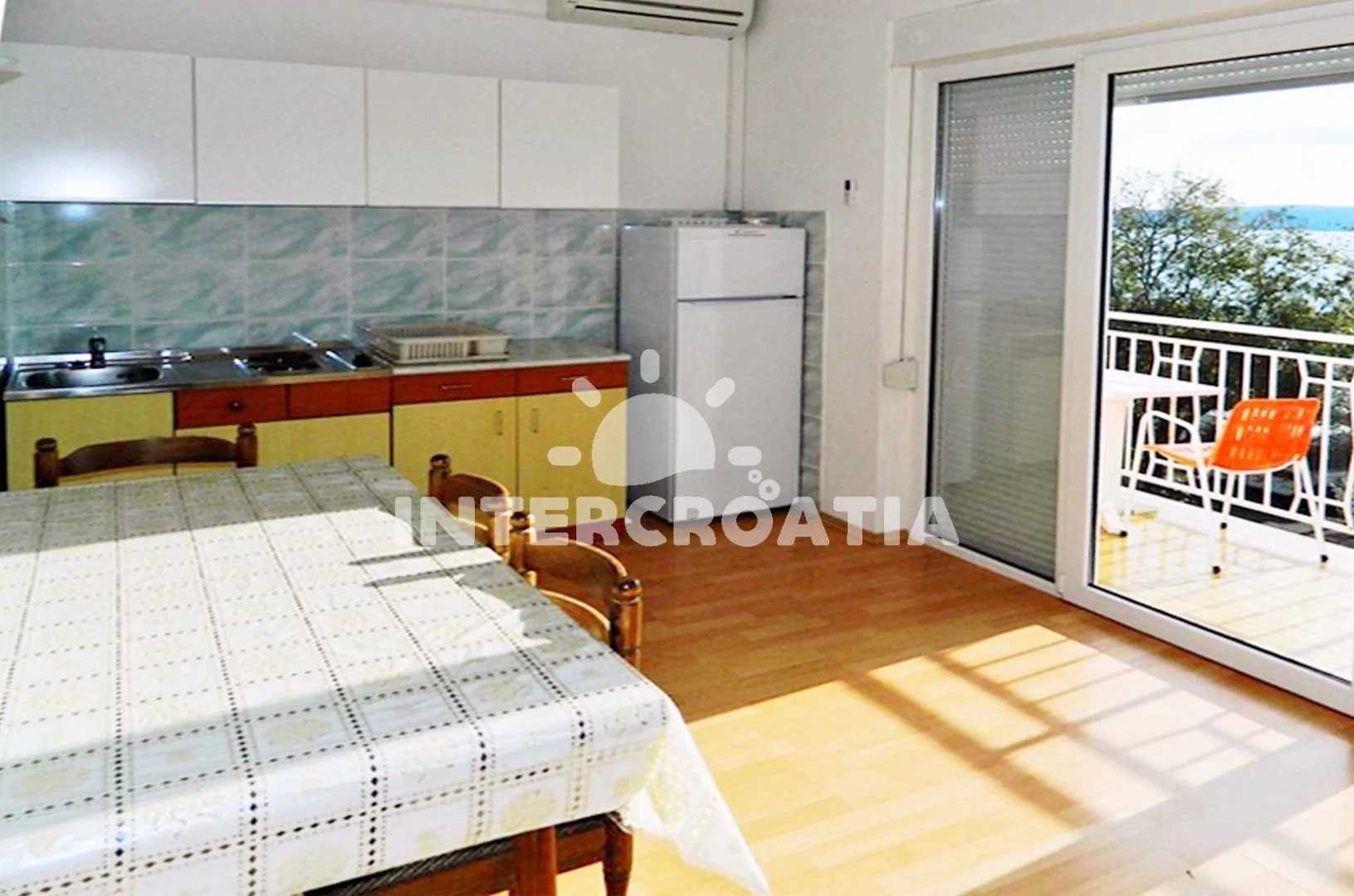 Apartmán (55 m2) s balkonem, venkovním posezením a výhledem na moře se nachází ve 2. patře domu. Apartmán má 2 ložnice a je vhodný pro 4 až 5 osob. Obývací pokoj je spojený s kuchyní. Kuchyňská linka je vybavena dvouplotýnkovým vařičem, nádobím a lednicí s mrazákem. Obývací pokoj s jídelním stolem, televizí se satelitním programem, klimatizací a vstupem na balkon. První ložnice s dvoulůžkem. Druhá ložnice s dvoulůžkem, přistýlkou a vstupem na balkon. Koupelna se sprchovým koutem, umyvadlem a wc. Hostům je k dispozici parkování u objektu zdarma.