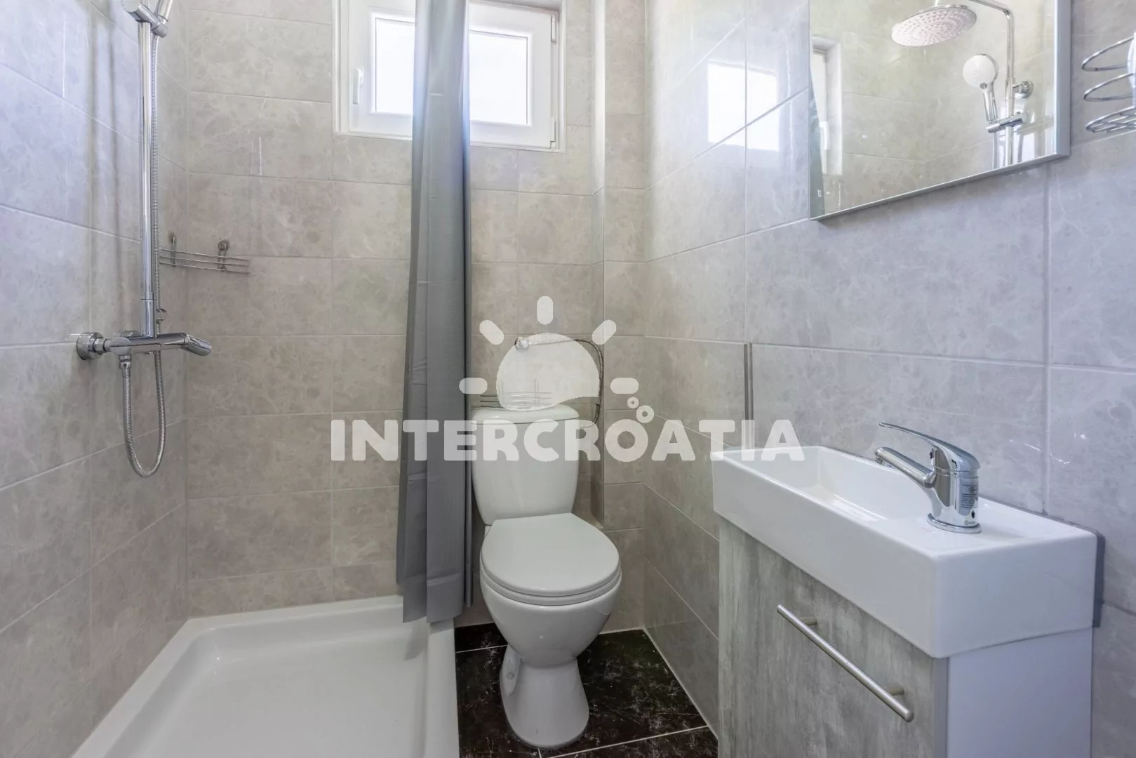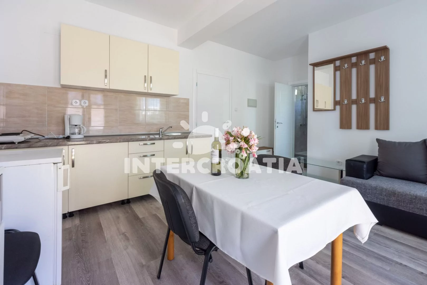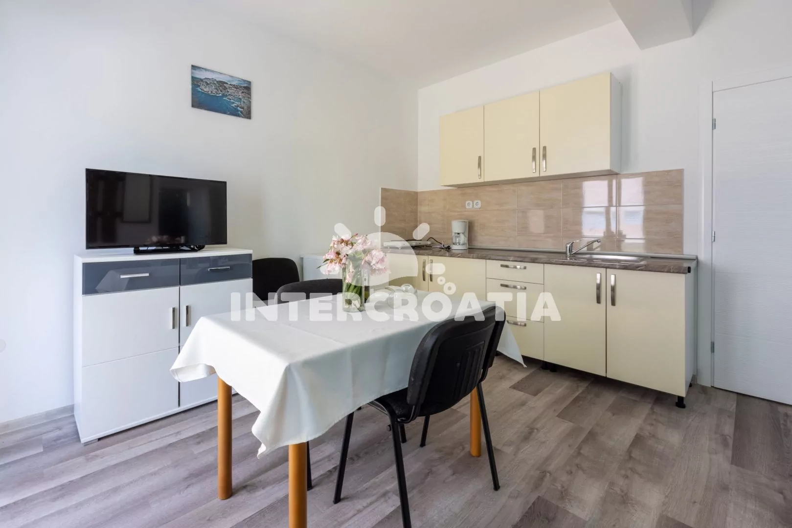 Apartmán (36 m2) s balkonem a bočním výhledem na moře se nachází v 1. patře domu. Apartmán má 1 ložnici a je vhodný pro 2 až 4 osoby. Obývací pokoj je spojený s kuchyní. Kuchyňská linka je vybavena dvouplotýnkovým vařičem, rychlovarnou konvicí, kávovarem, nádobím a lednicí s mrazákem. Obývací pokoj s jídelním stolem, rohovou pohovkou (rozložitelná na extra lůžko pro 2 osoby), televizí se satelitním programem, klimatizací a vstupem na balkon. Ložnice s jedním dvoulůžkem. Koupelna se sprchovým koutem, umyvadlem a wc. Hostům je k dispozici parkování u objektu zdarma.