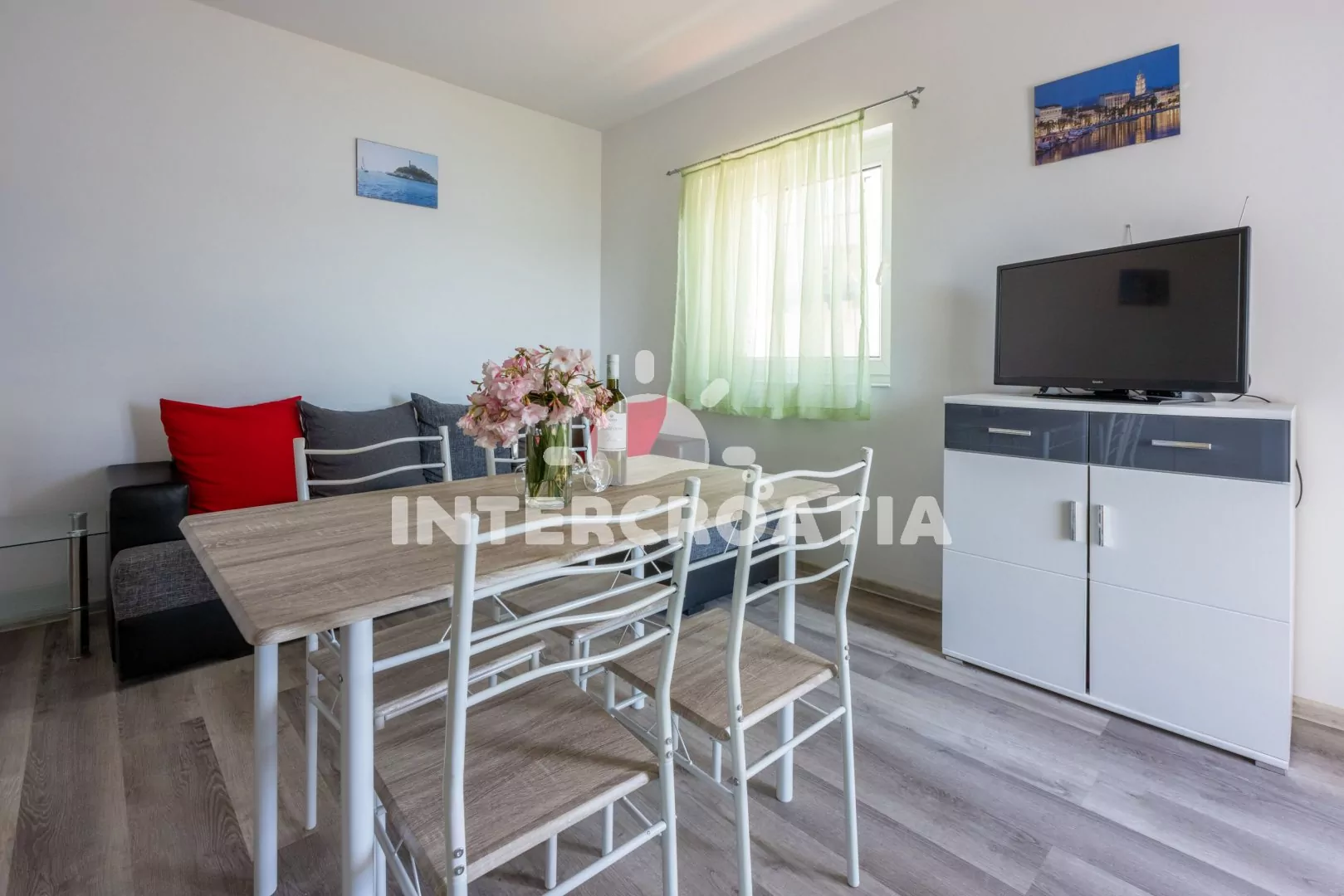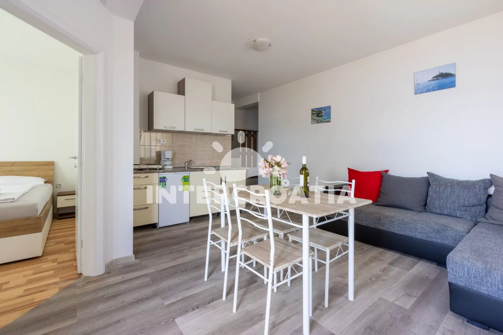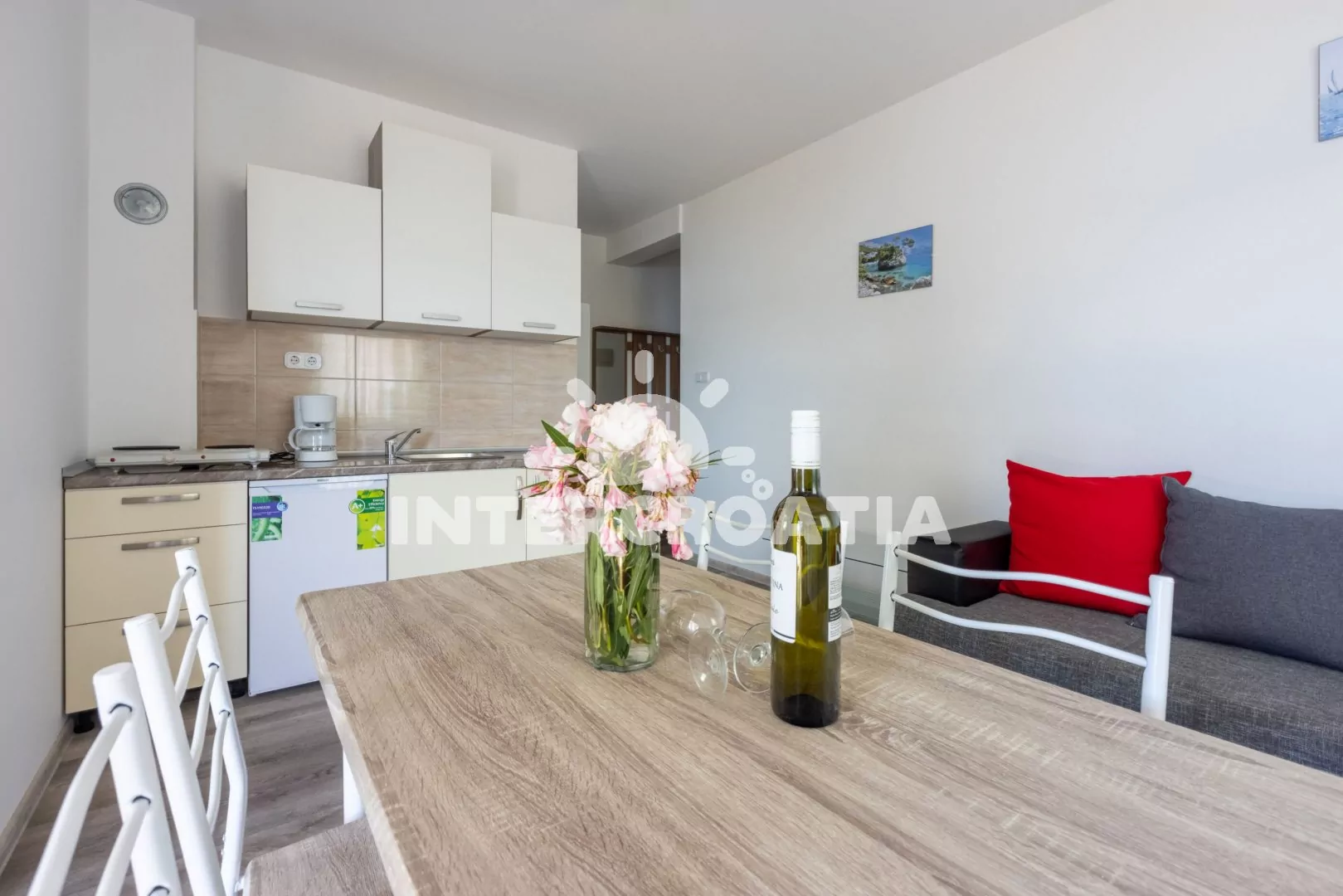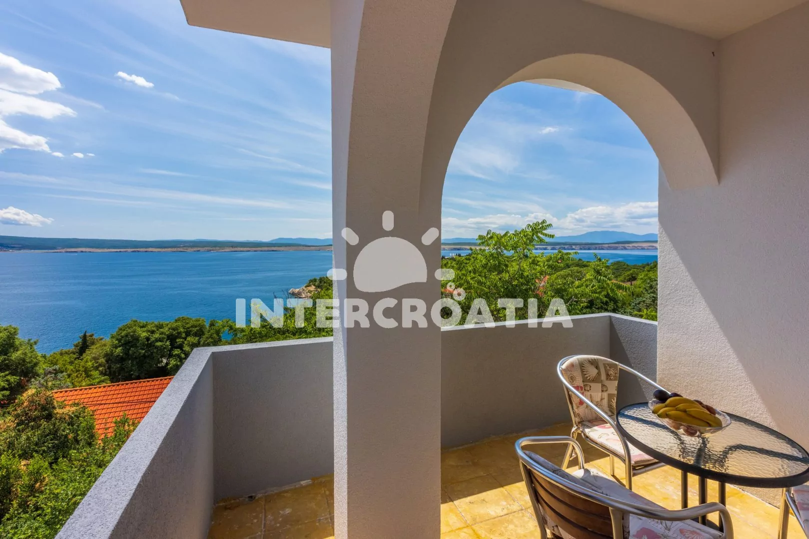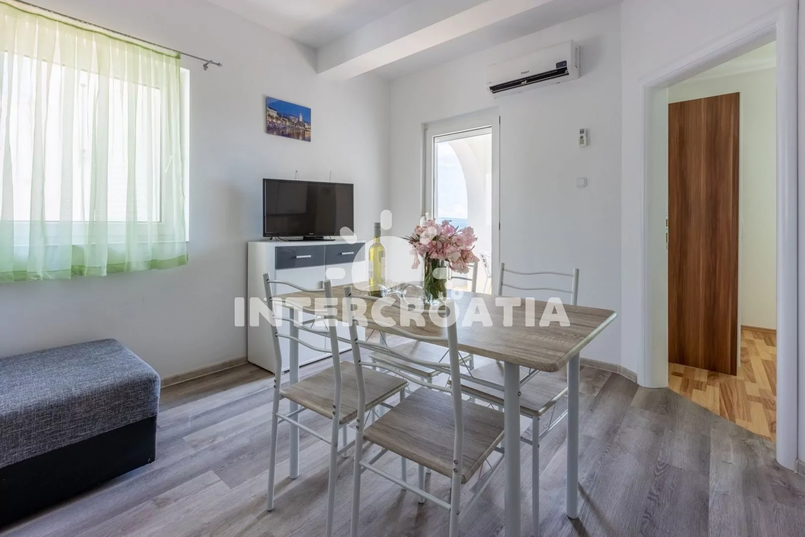 Apartmán (36 m2) s terasou a výhledem na moře se nachází v 1. patře domu. Apartmán má 1 ložnici a je vhodný pro 2 až 4 osoby. Obývací pokoj je spojený s kuchyní. Kuchyňská linka je vybavena dvouplotýnkovým vařičem, rychlovarnou konvicí, kávovarem, nádobím a lednicí s mrazákem. Obývací pokoj s jídelním stolem pro 4 osoby, rohovou pohovkou (rozložitelná na extra lůžko pro 2 osoby), televizí se satelitním programem, klimatizací a vstupem na terasu. Ložnice s jedním dvoulůžkem. Koupelna se sprchovým koutem, umyvadlem a wc. Hostům je k dispozici parkování u objektu zdarma.