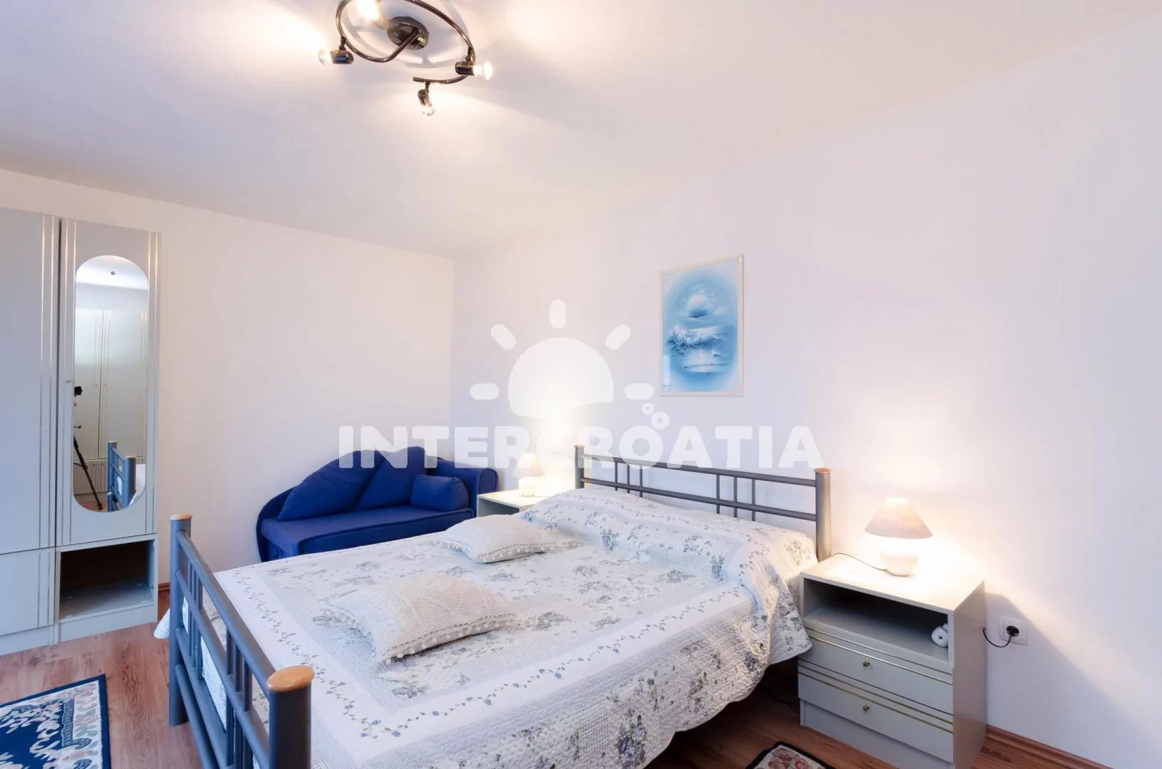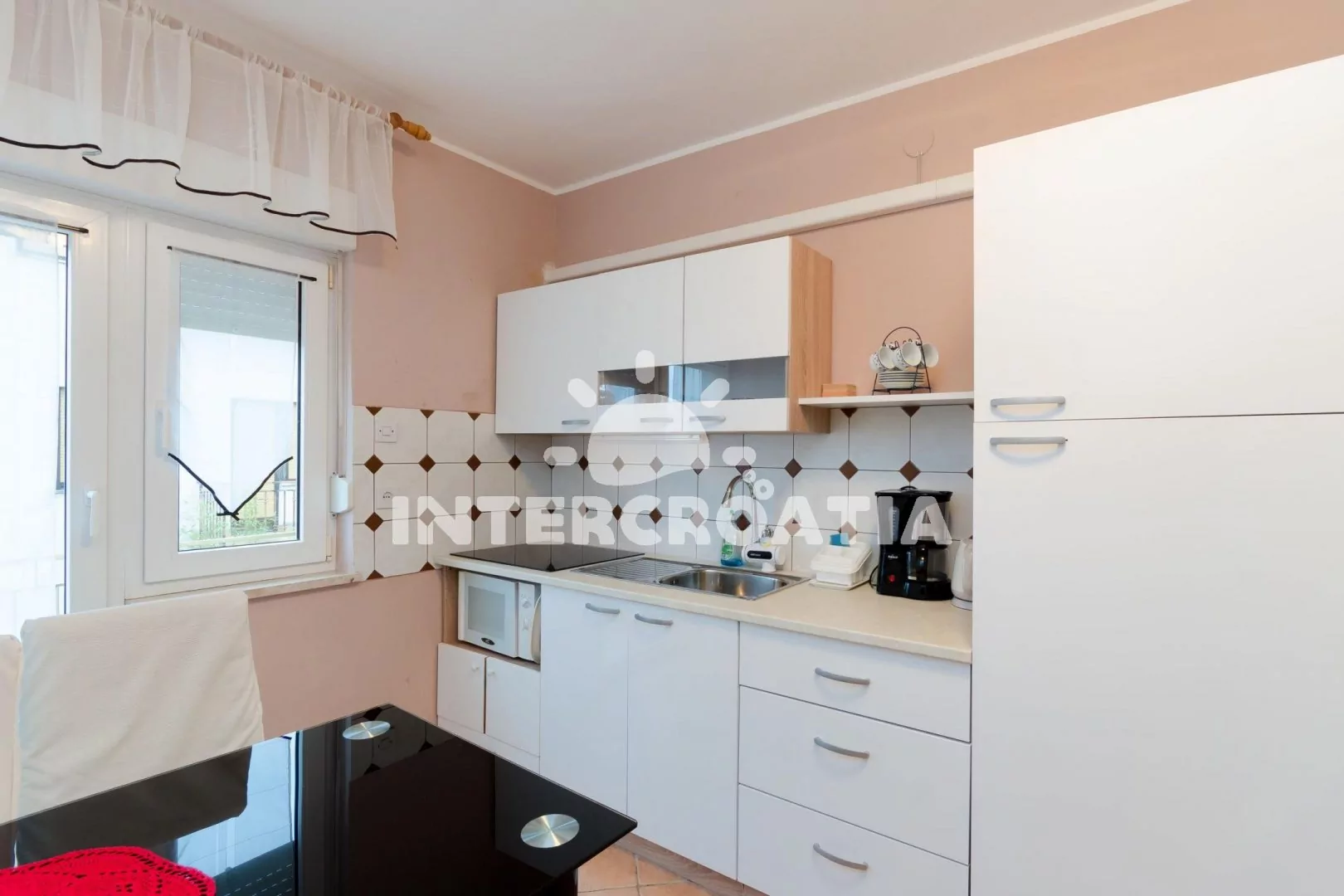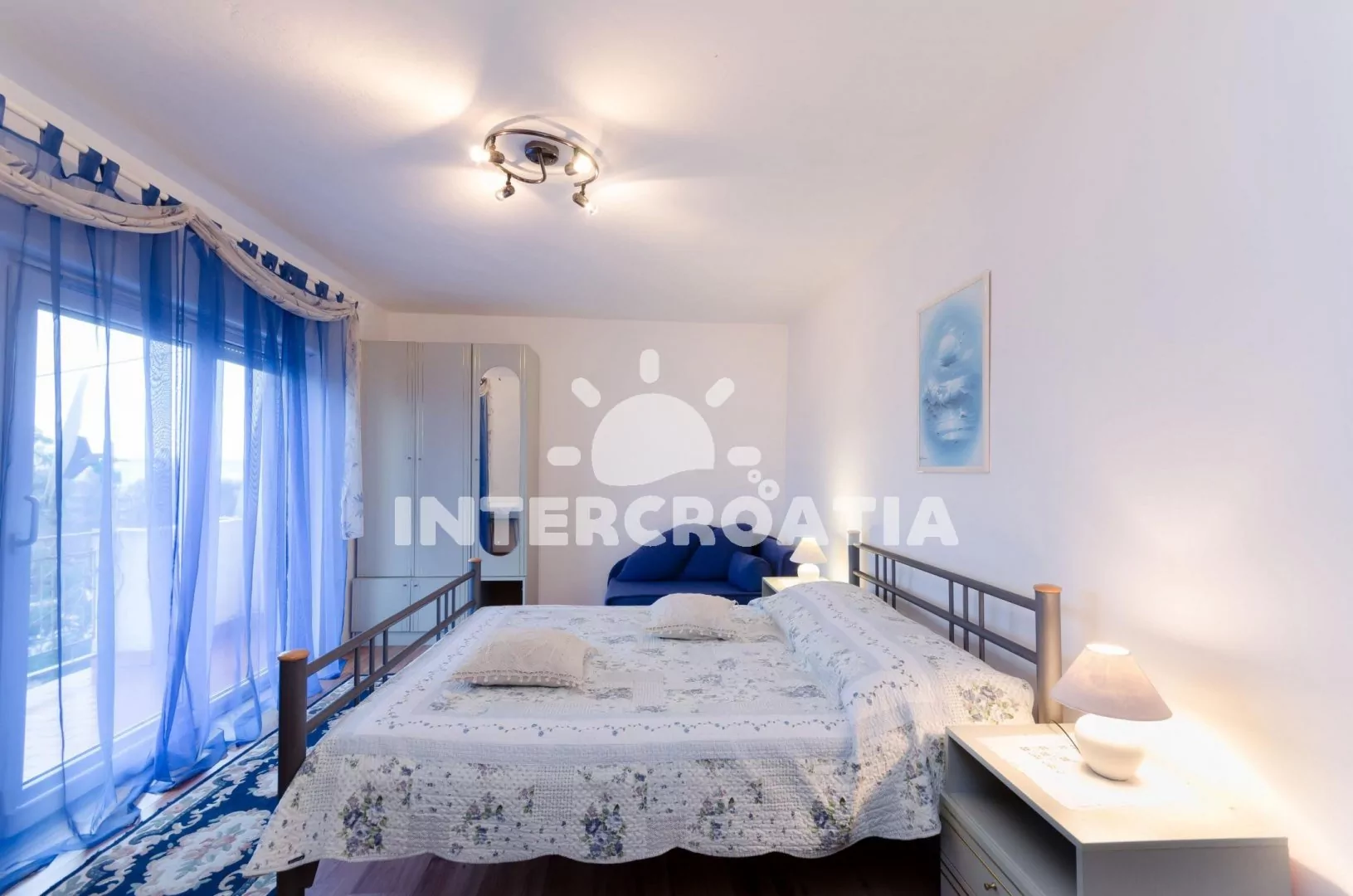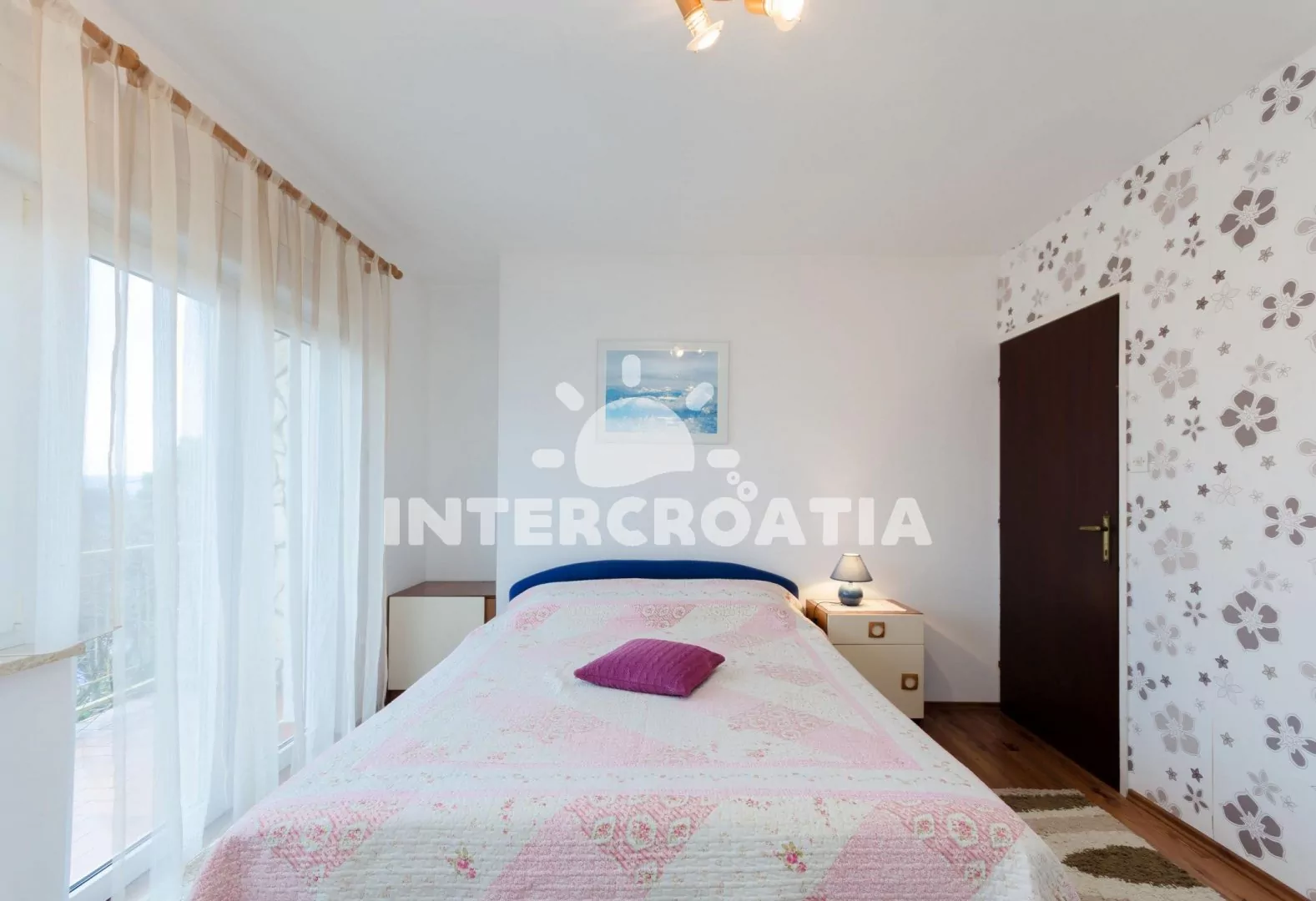 Apartmán (65 m2) s balkonem a výhledem na moře se nachází v 1. patře domu. Apartmán má 2 ložnice a je vhodný pro 4 osoby. Obývací pokoj je spojený s kuchyní. Kuchyňská linka je vybavena sklokeramickou varnou deskou, mikrovlnnou troubou, rychlovarnou konvicí, toustovačem, kávovarem, nádobím a lednicí s mrazákem. Obývací pokoj s jídelním stolem pro 4 osoby, rohovou pohovkou, televizí se satelitním programem a klimatizací. První ložnice s dvoulůžkem a vstupem na balkon. Druhá ložnice s dvoulůžkem a vstupem na balkon. Koupelna s vanou, sprchovou zástěnou, umyvadlem, fénem a wc. Hostům je k dispozici parkování u objektu zdarma.
