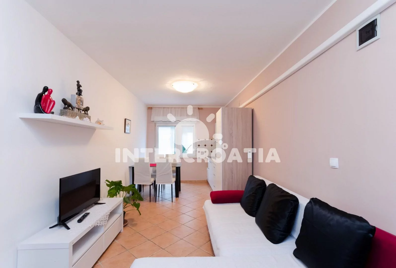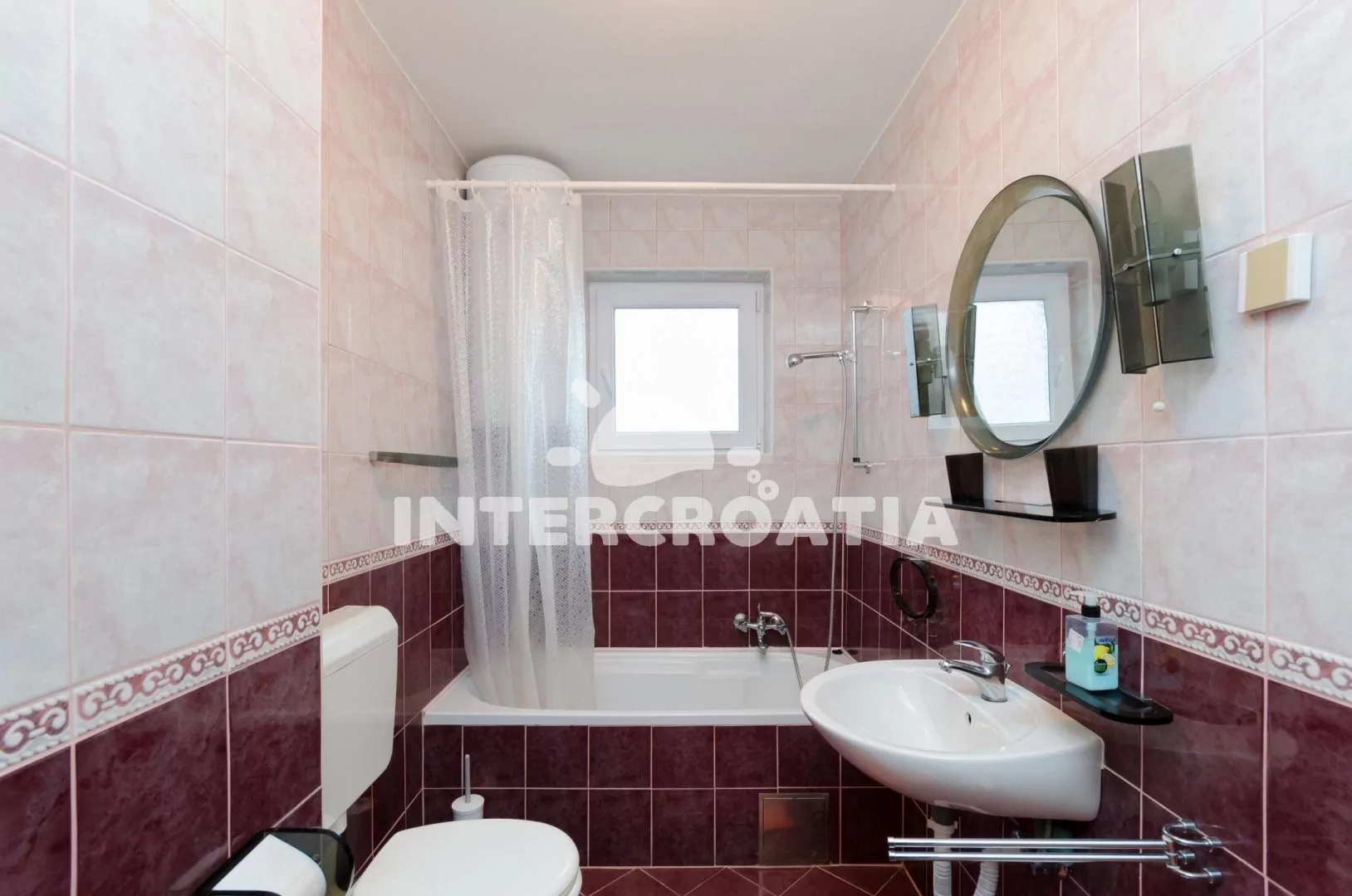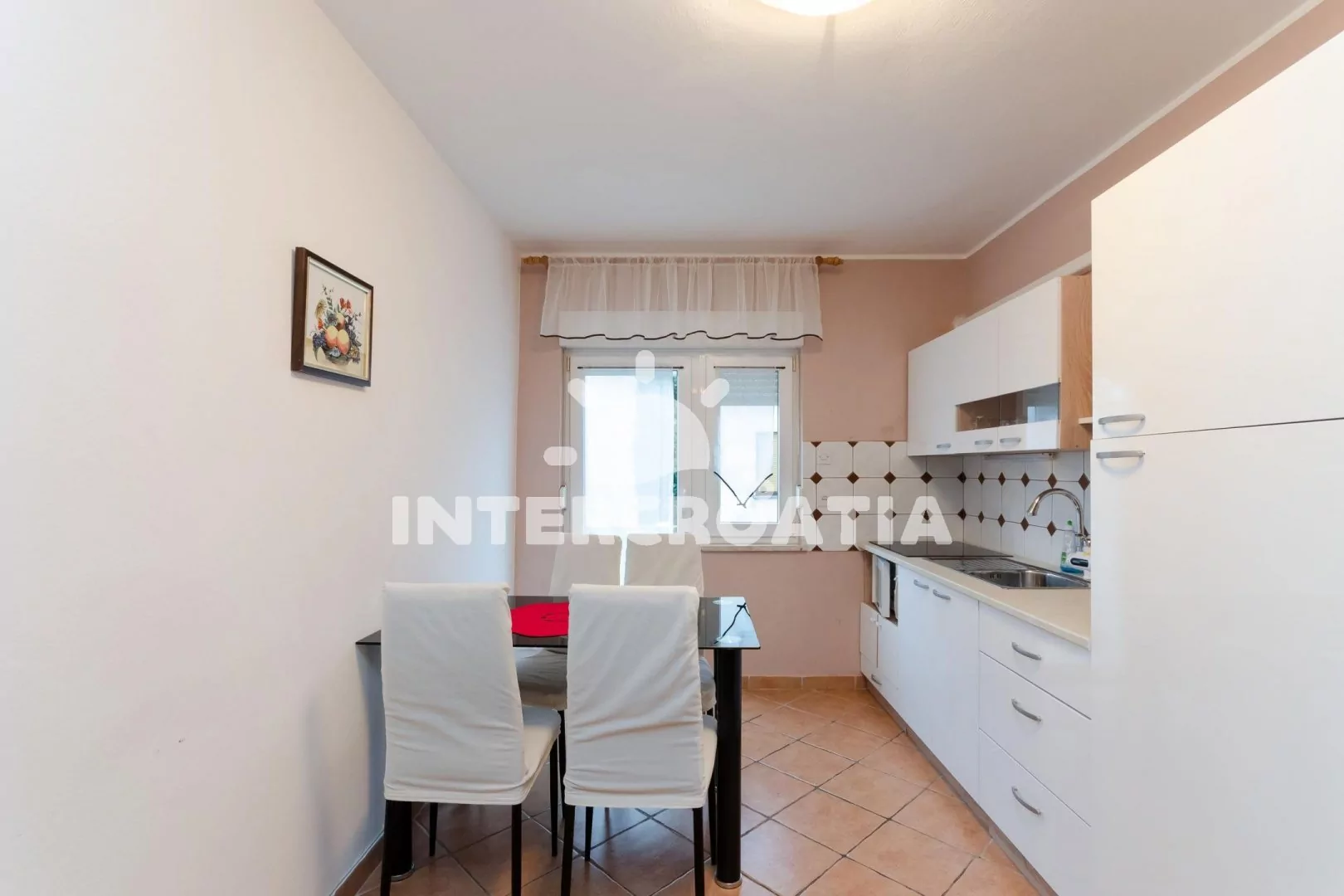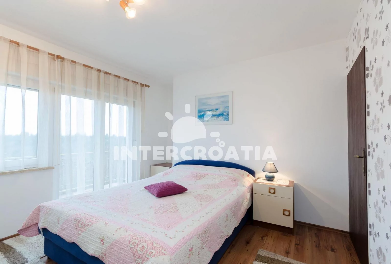 Apartmán (65 m2) s balkonem a výhledem na moře se nachází v 1. patře domu. Apartmán má 2 ložnice a je vhodný pro 4 osoby. Obývací pokoj je spojený s kuchyní. Kuchyňská linka je vybavena sklokeramickou varnou deskou, mikrovlnnou troubou, rychlovarnou konvicí, toustovačem, kávovarem, nádobím a lednicí s mrazákem. Obývací pokoj s jídelním stolem pro 4 osoby, rohovou pohovkou, televizí se satelitním programem a klimatizací. První ložnice s dvoulůžkem a vstupem na balkon. Druhá ložnice s dvoulůžkem a vstupem na balkon. Koupelna s vanou, sprchovou zástěnou, umyvadlem, fénem a wc. Hostům je k dispozici parkování u objektu zdarma.