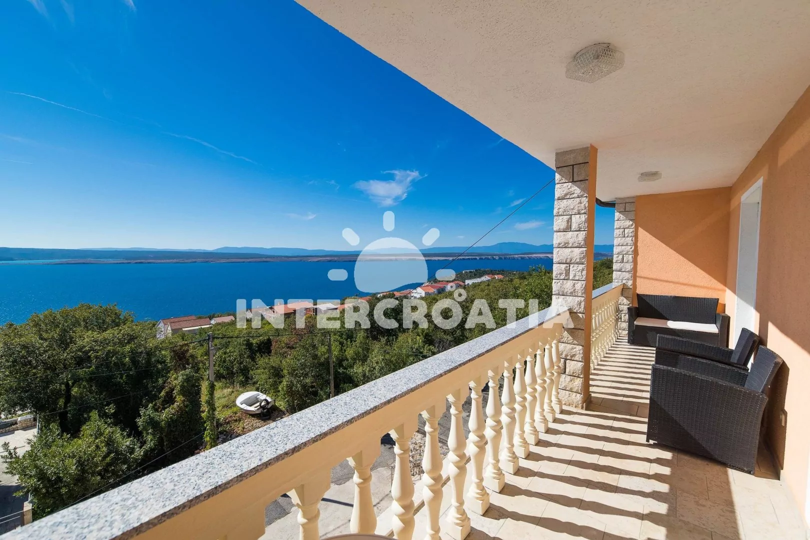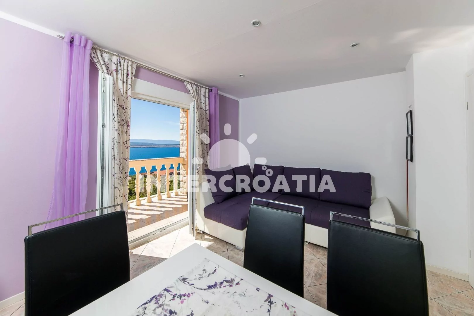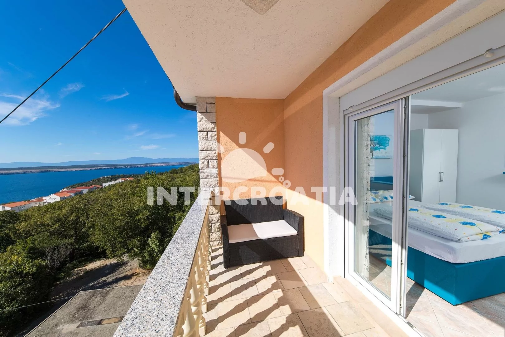 Apartmán (90 m2) s balkonem, venkovním posezením a výhledem na moře se nachází ve 2. patře vily. Apartmán má 3 ložnice, 2 koupelny a je vhodný pro až 6 osob. Obývací pokoj je spojený s kuchyní. Kuchyňská linka je vybavena sklokeramickou varnou deskou, digestoří, vestavěnou troubou, myčkou na nádobí, mikrovlnnou troubou, kávovarem, rychlovarnou konvicí, nádobím a lednicí s mrazákem. Obývací pokoj s jídelním stolem pro 6 osob, pohovkou, televizí se satelitním programem a vstupem na balkon. Dále chodba s klimatizací a vstupy do ložnic. První a druhá ložnice s dvoulůžkem a vstupem na balkon. Třetí ložnice s dvoulůžkem. Dvě koupelny se sprchovým koutem, umyvadlem, jednou pračkou a wc. Hostům je k dispozici parkování u objektu zdarma.