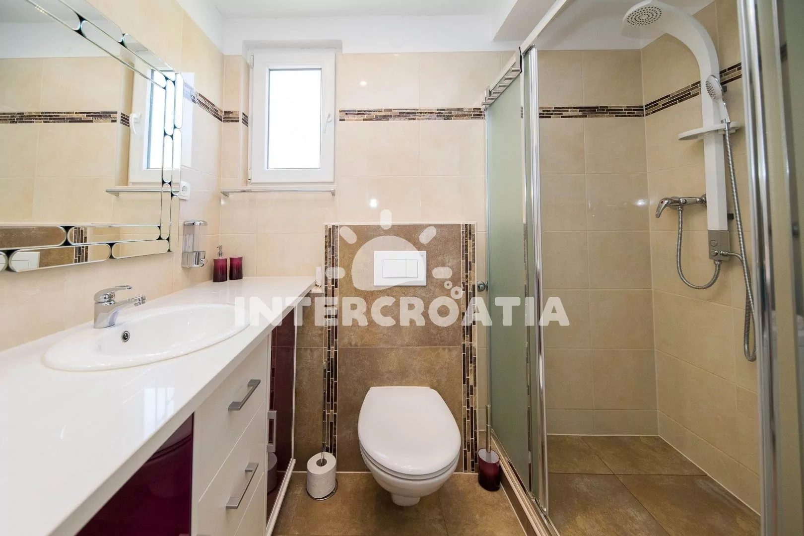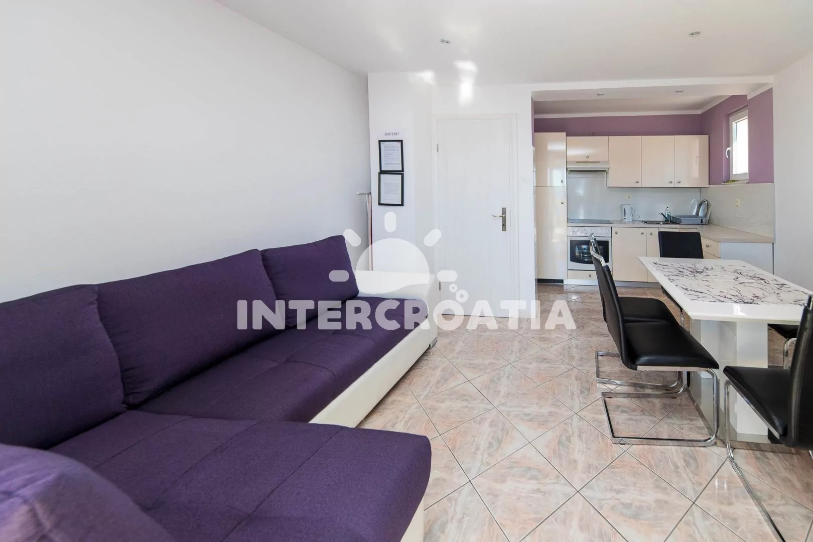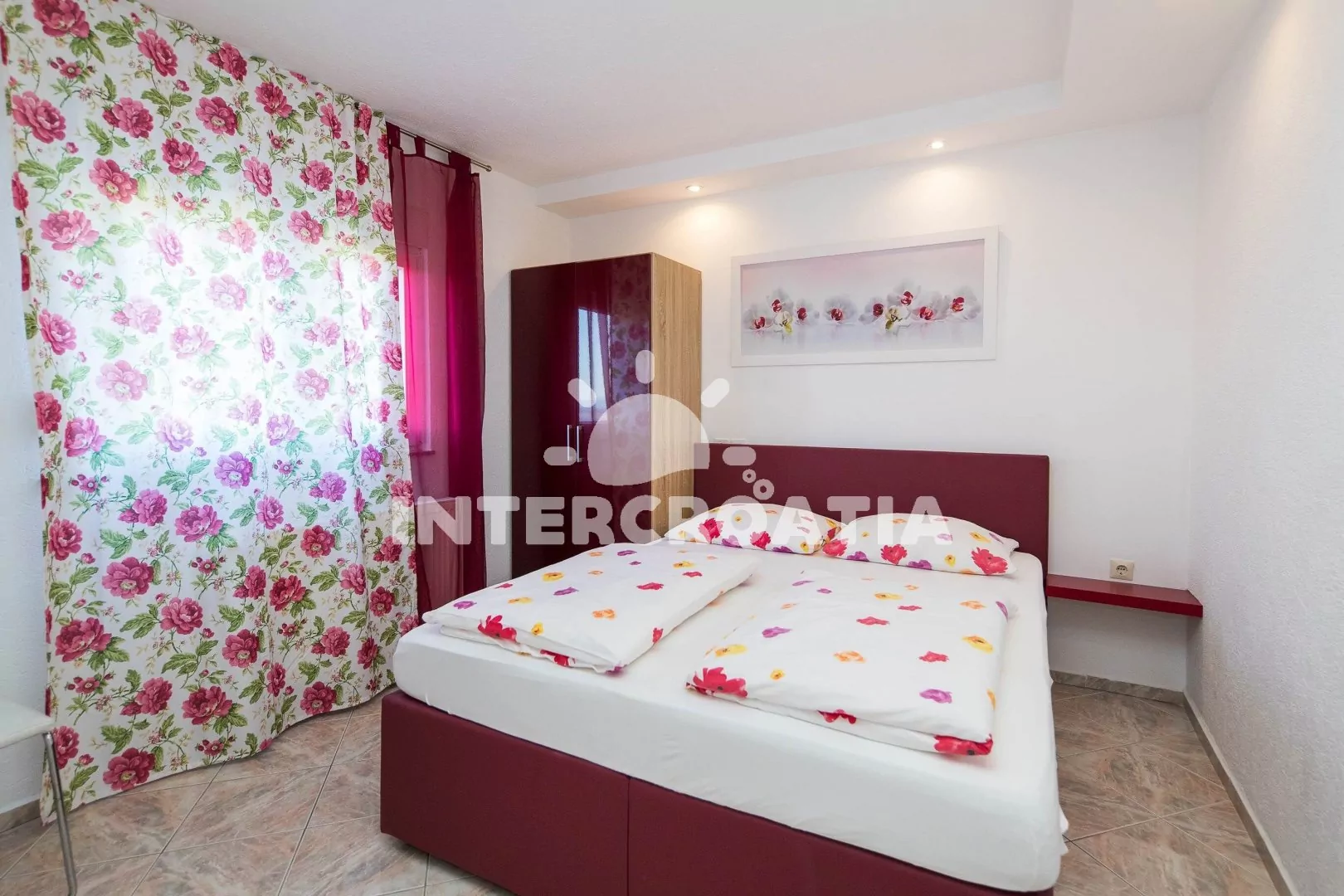 Apartmán (90 m2) s balkonem, venkovním posezením a výhledem na moře se nachází ve 2. patře vily. Apartmán má 3 ložnice, 2 koupelny a je vhodný pro až 6 osob. Obývací pokoj je spojený s kuchyní. Kuchyňská linka je vybavena sklokeramickou varnou deskou, digestoří, vestavěnou troubou, myčkou na nádobí, mikrovlnnou troubou, kávovarem, rychlovarnou konvicí, nádobím a lednicí s mrazákem. Obývací pokoj s jídelním stolem pro 6 osob, pohovkou, televizí se satelitním programem a vstupem na balkon. Dále chodba s klimatizací a vstupy do ložnic. První a druhá ložnice s dvoulůžkem a vstupem na balkon. Třetí ložnice s dvoulůžkem. Dvě koupelny se sprchovým koutem, umyvadlem, jednou pračkou a wc. Hostům je k dispozici parkování u objektu zdarma.
