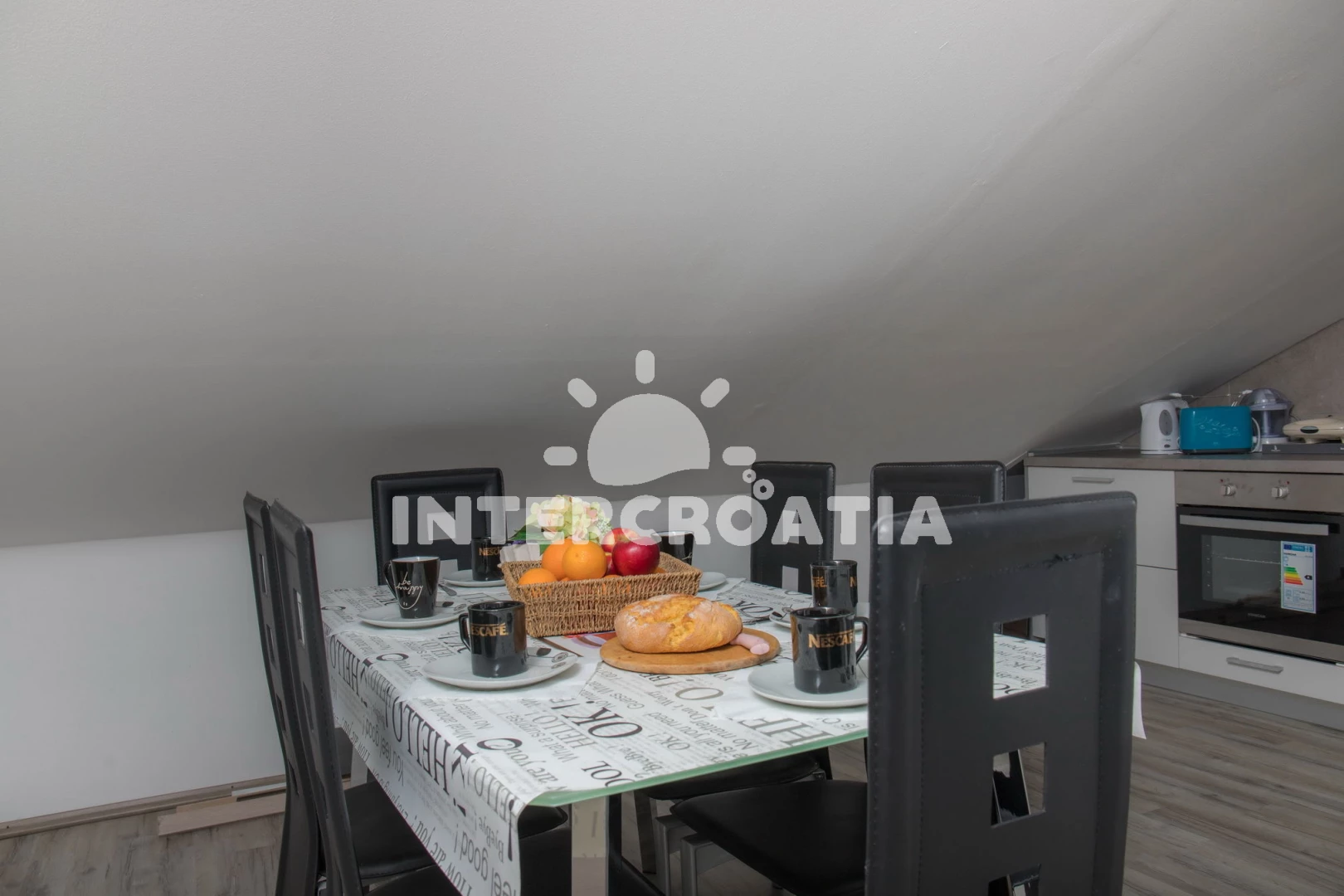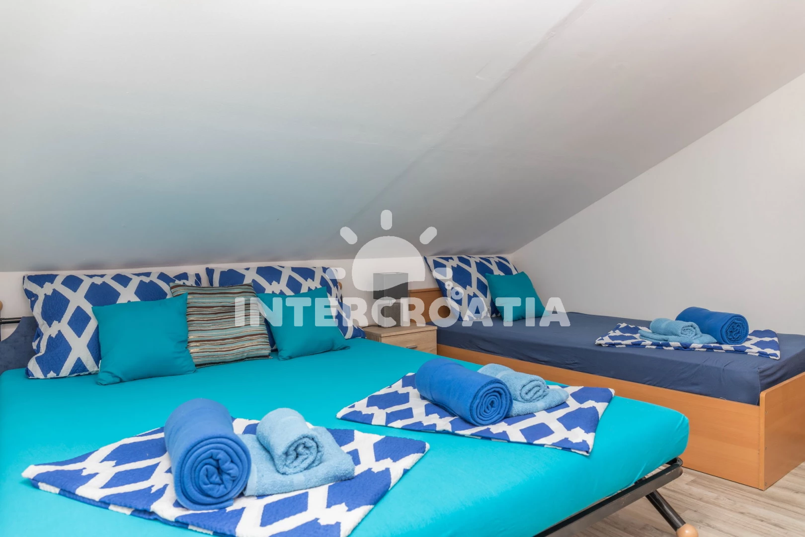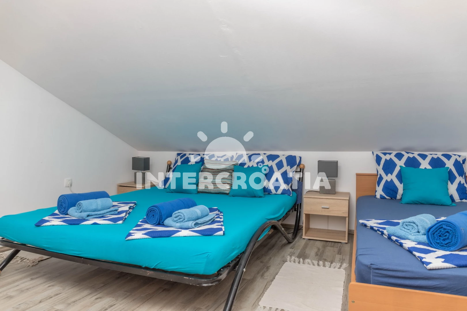 Apartmán (50 m2) s balkonem, a výhledem na moře. Nachází se v podkroví objektu. Apartmán má 1 ložnici a je vhodný pro až 7 osob. Kuchyňská linka je vybavena varnou deskou, troubou, toustovačem, kávovarem, myčkou na nádobí, mikrovlnnou troubou, rychlovarnou konvicí, nádobím, lednicí, mrazákem. V obývací místnosti je rozložitelná pohovka (extra lůžko pro 2 osoby). K dispozici televize se satelitním programem, žehlička. Koupelna se sprchovým koutem, umyvadlem, WC.