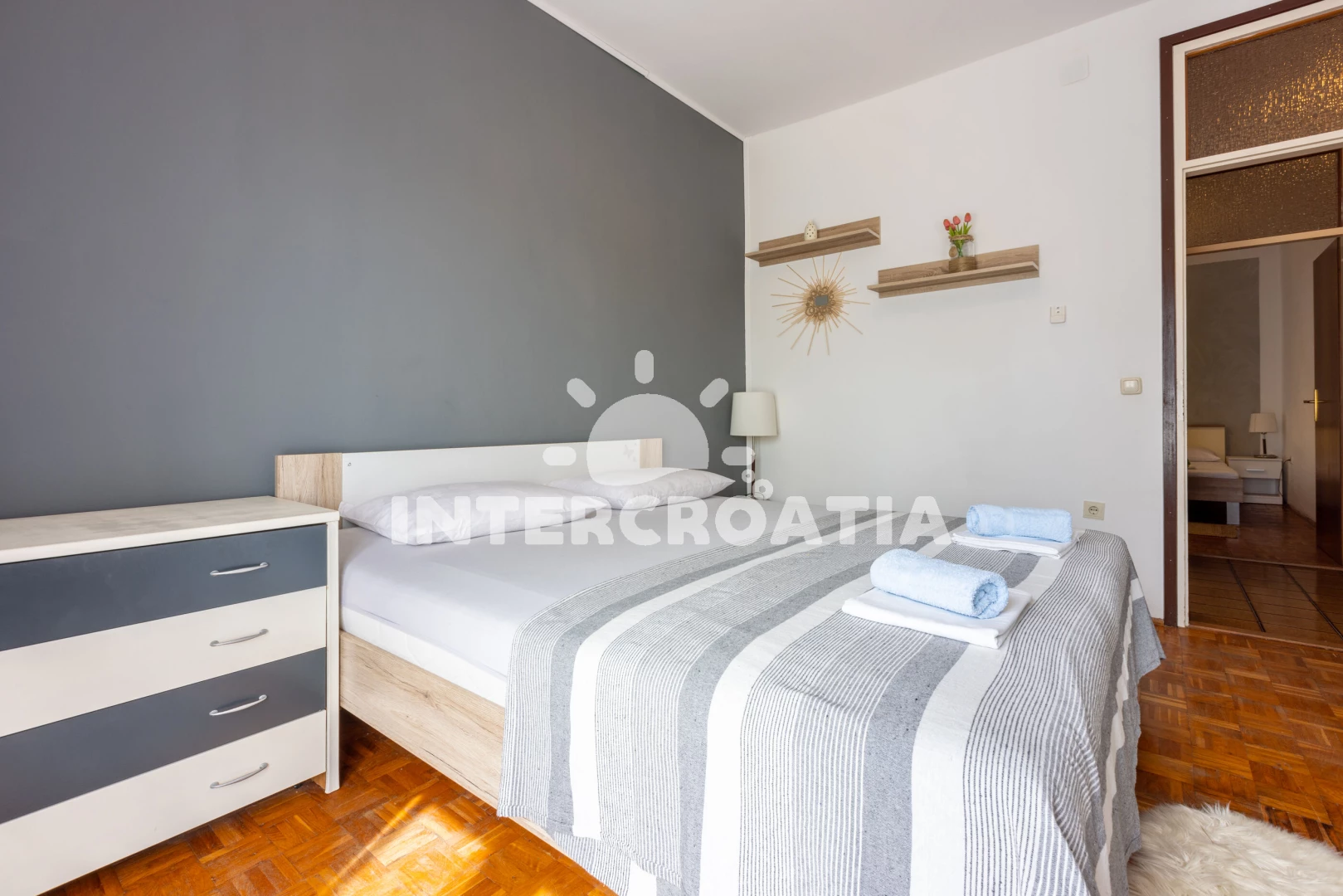 Apartmán se nachází 300 m od moře a pláže. Pláž je skalnatá, oblázková, větší kamení a betonové desky. Parkování je před domem.
