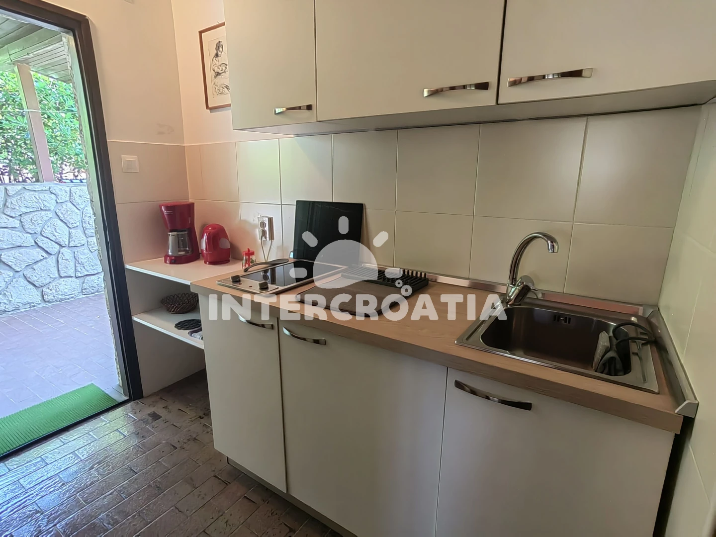 Apartmán se nachází 380 m od moře a pláže. Pláž je oblázková a betonové desky. U objektu je k dispozici společná zahrada s posezením a grilem. Parkování je před domem.