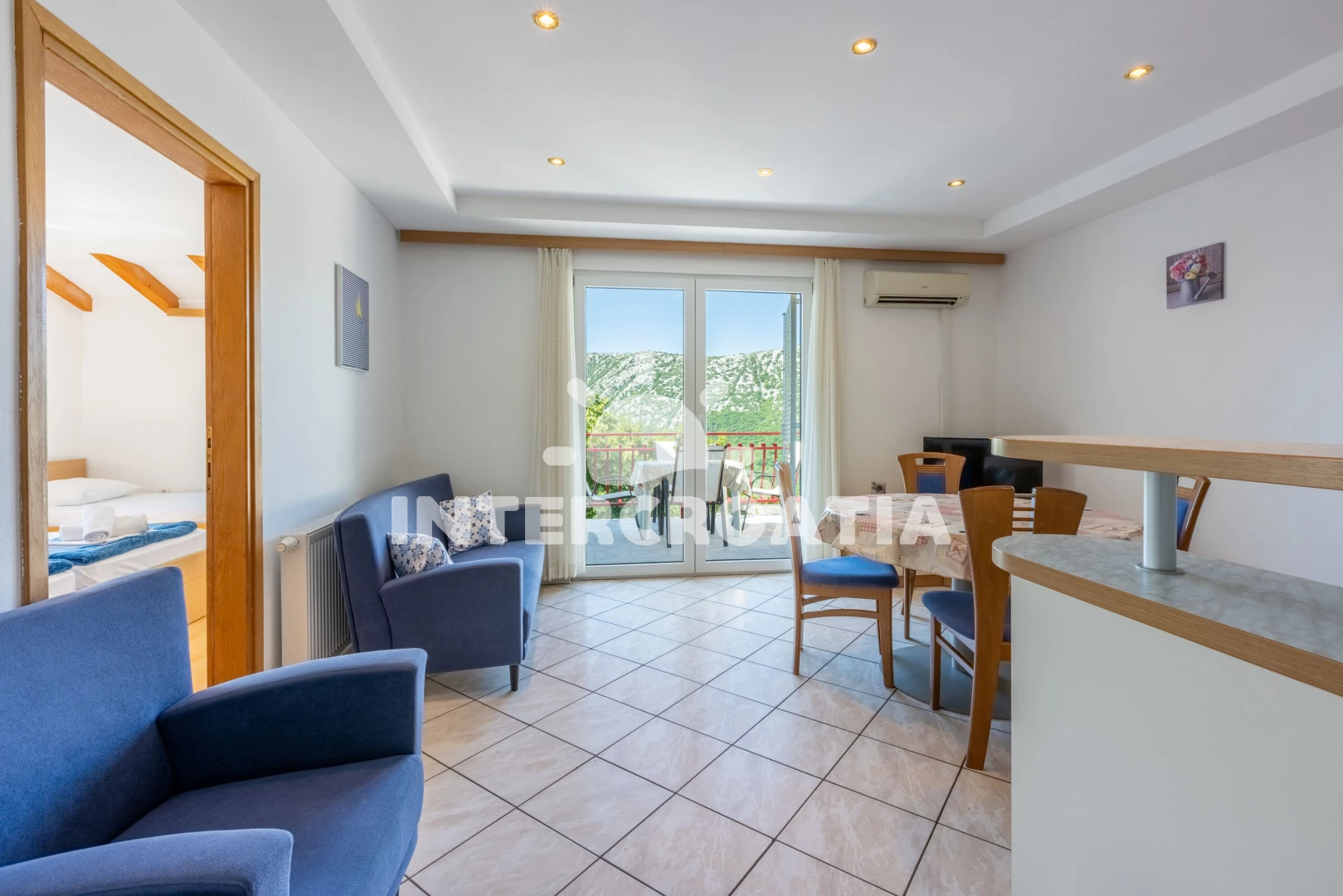 Apartmán se nachází 6000 m od moře a pláže. Pláž je skalnatá, oblázková, větší kamení a betonové desky. Apartmán disponuje bazénem s lehátky pro ubytované hosty. U objektu je k dispozici společná zahrada s posezením a grilem. Parkování je před domem.