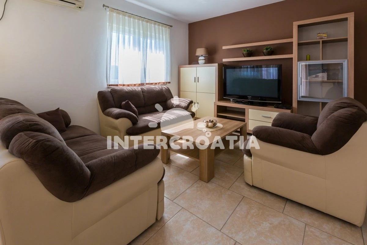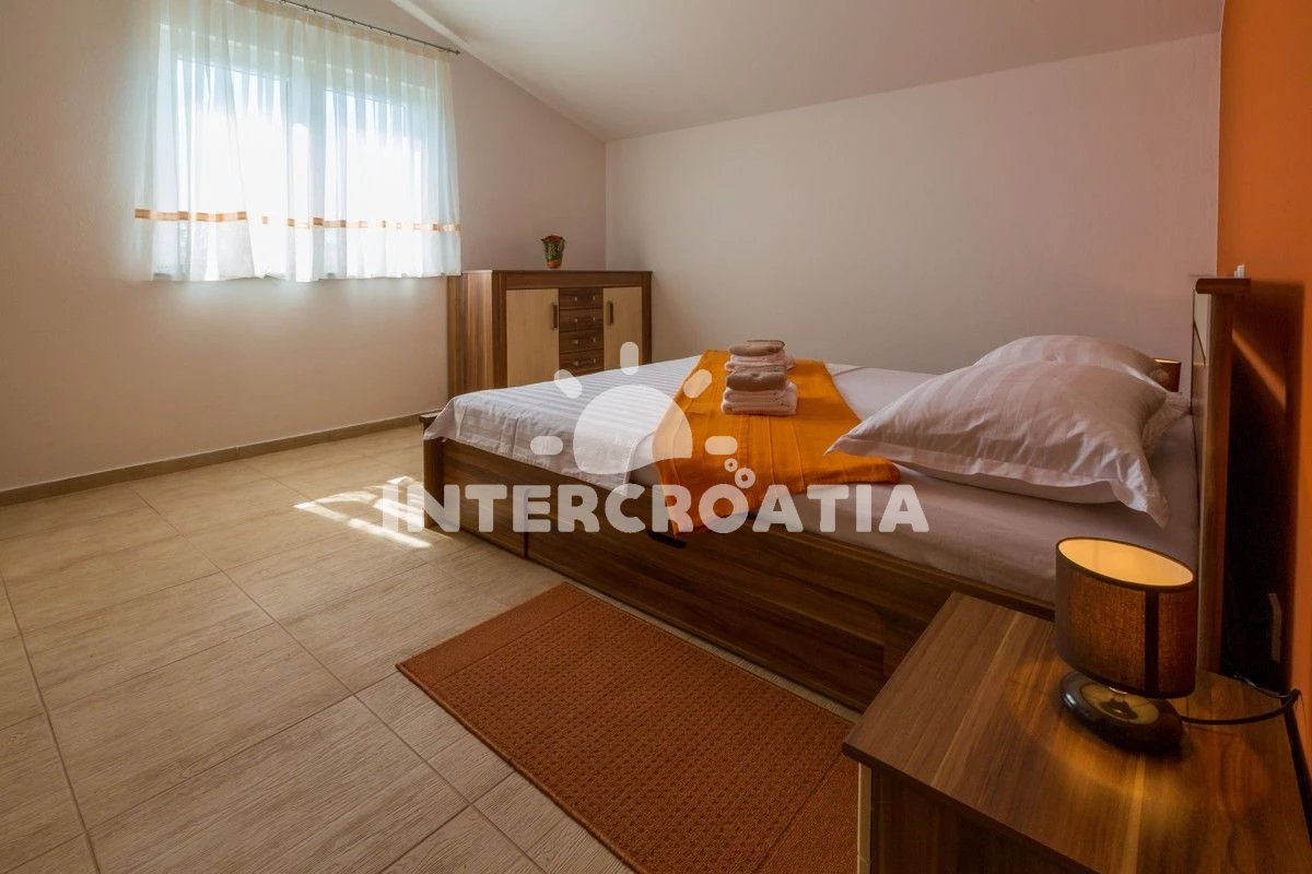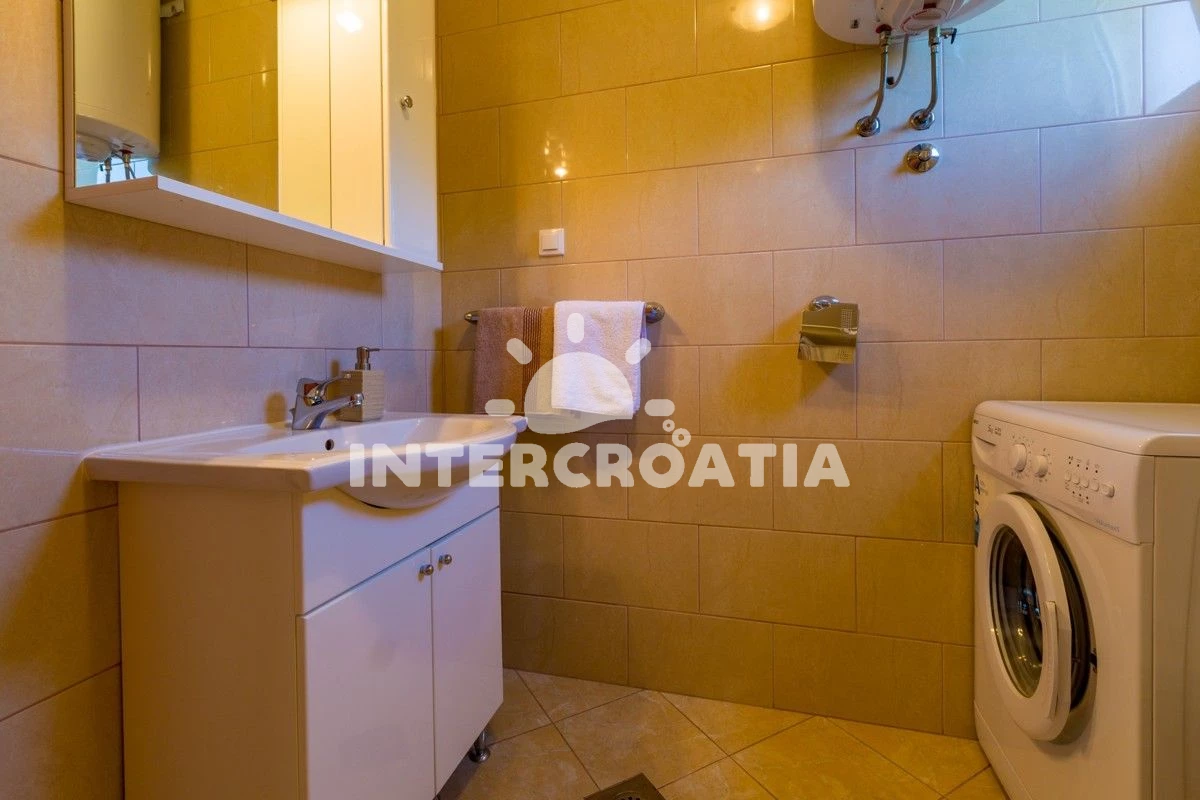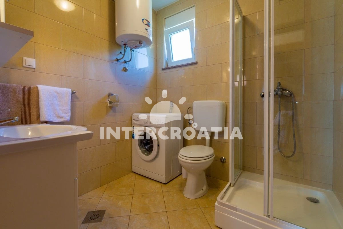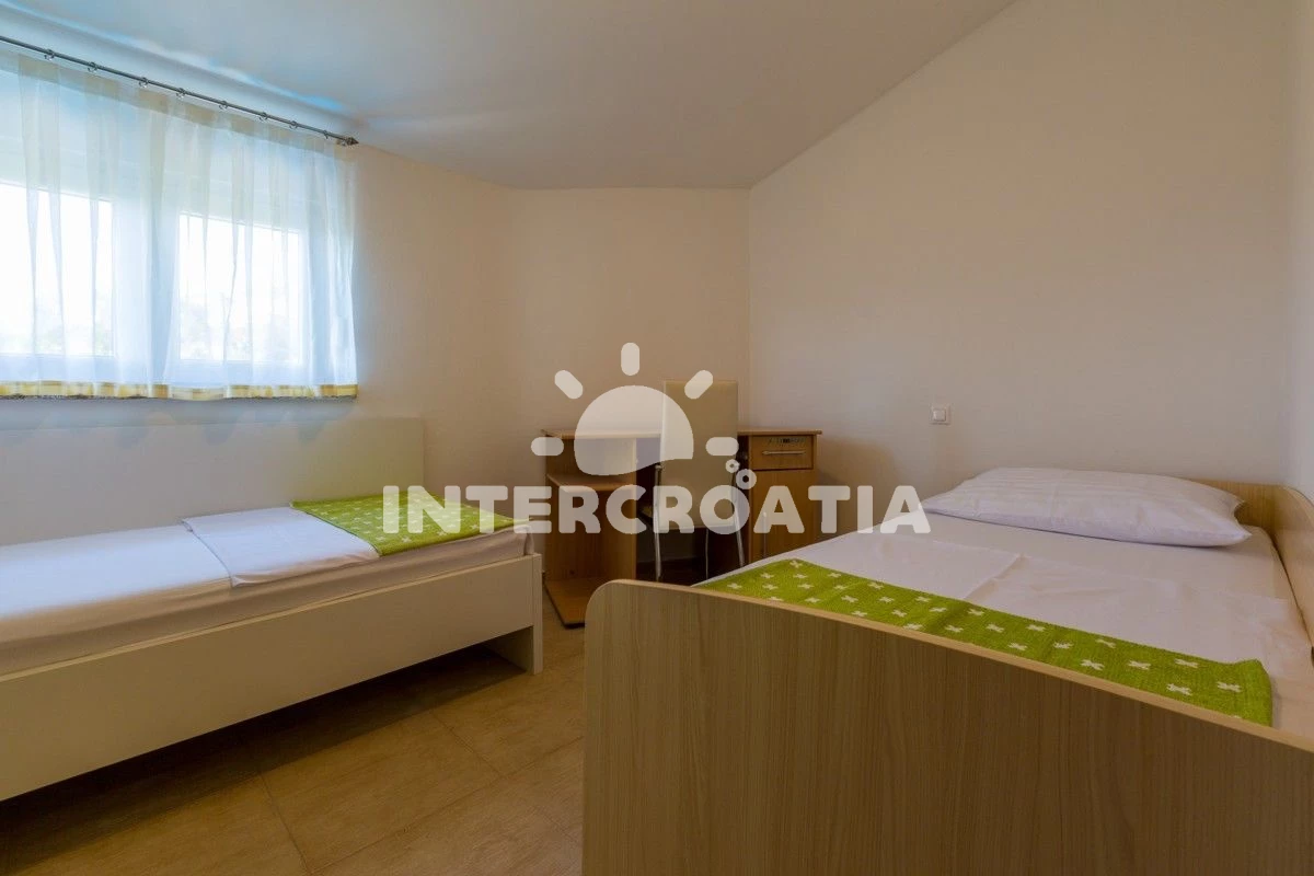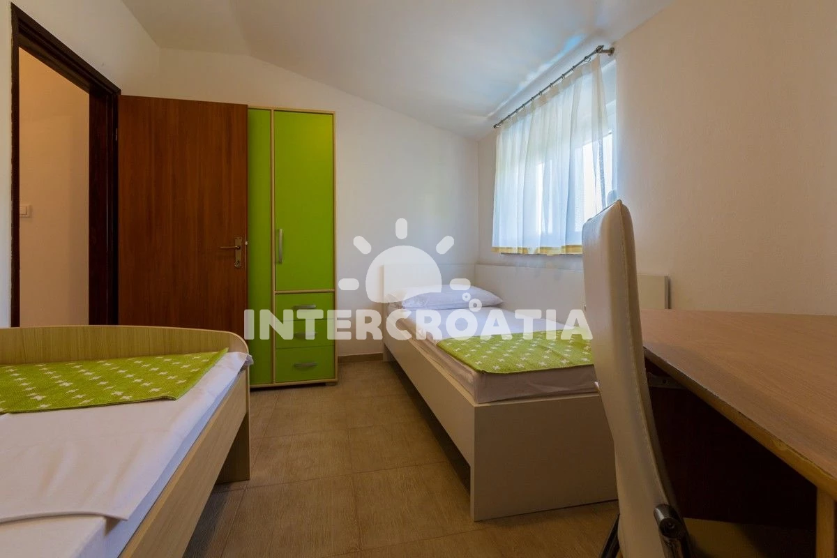 Apartmán se nachází 6000 m od moře a pláže. Pláž je skalnatá, oblázková, větší kamení a betonové desky. Apartmán disponuje bazénem s lehátky pro ubytované hosty. U objektu je k dispozici společná zahrada s posezením a grilem. Parkování je před domem.