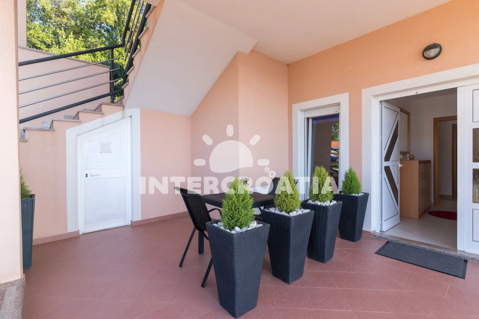 Apartmán se nachází 500 m od moře a pláže. Pláž je oblázková a betonové desky. Apartmán disponuje bazénem s lehátky pro ubytované hosty. U objektu je k dispozici společná zahrada s posezením a grilem. Parkování je před domem.