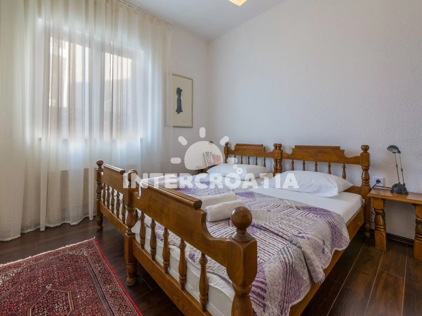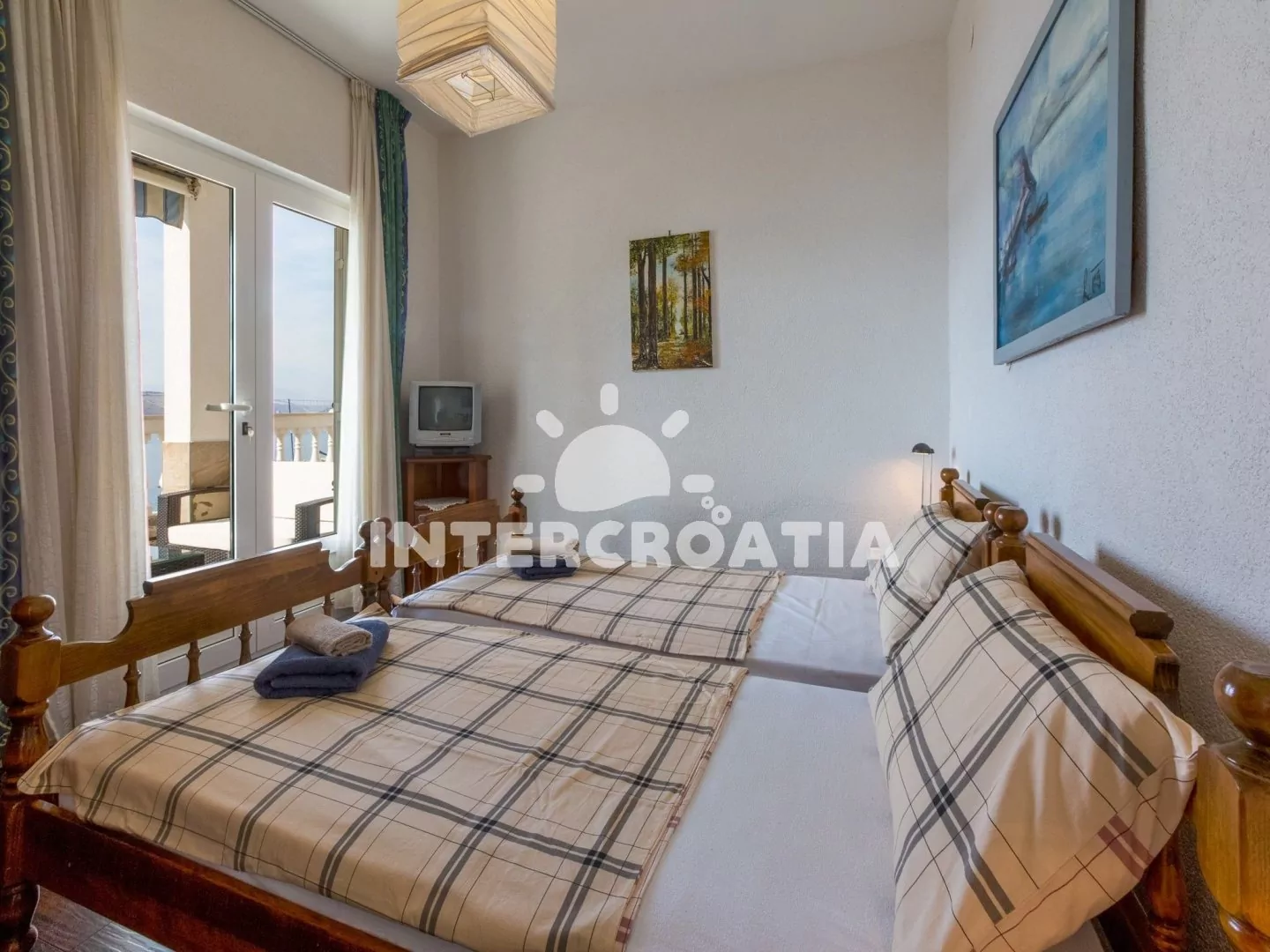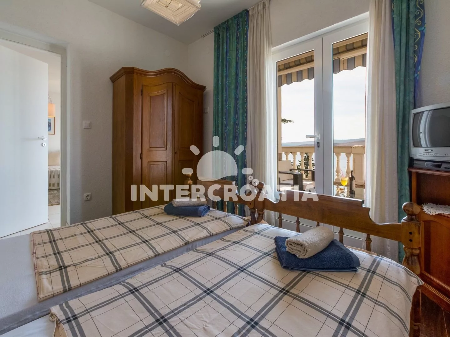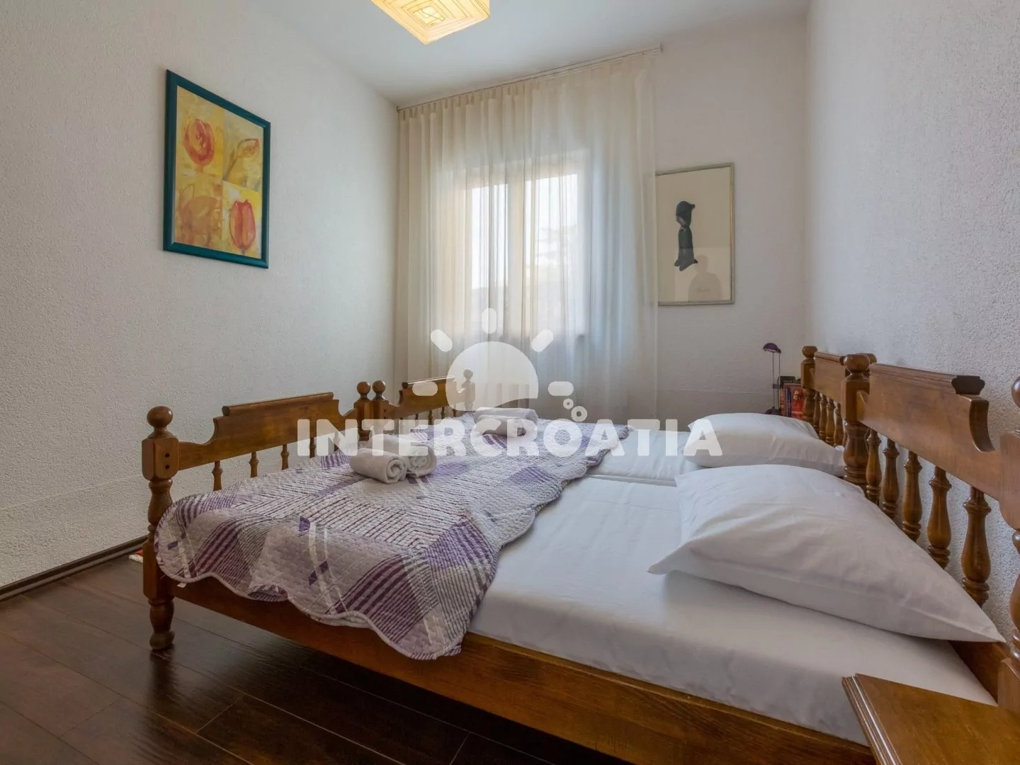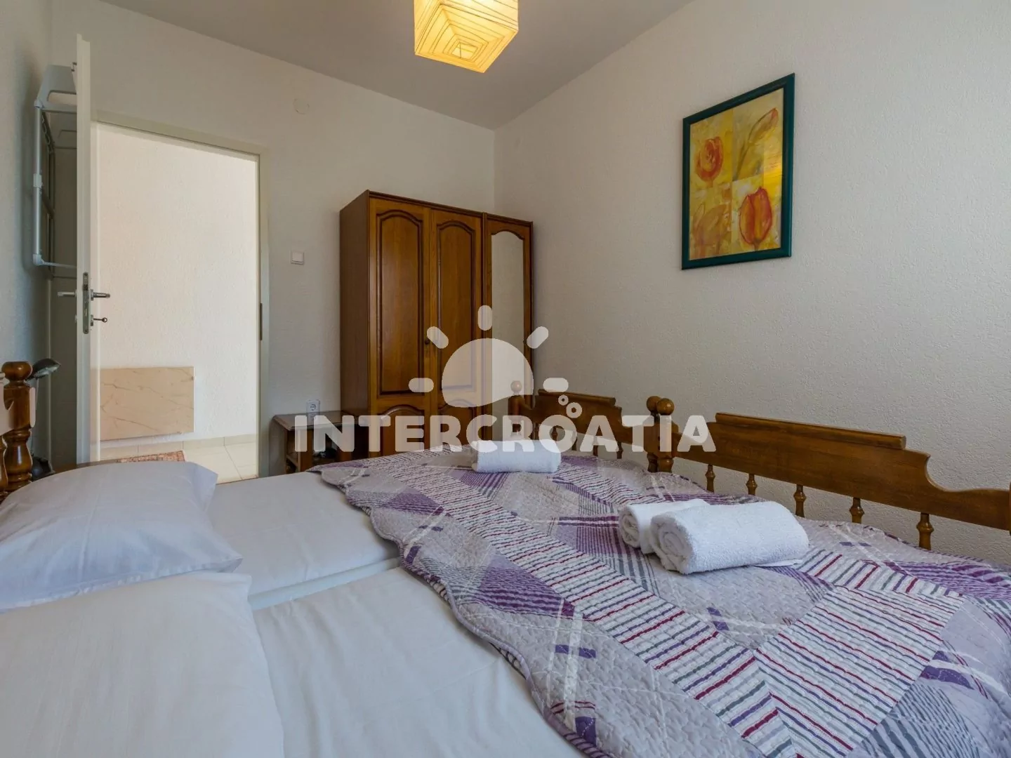 Hezký apartmán (80 m2) v druhém patře vily s vlastní terasou a výhledem na moře je vhodný až pro 6 osob. Obývací pokoj je spojený s kuchyní. Kuchyňská linka je vybavena sporákem, digestoří, troubou, myčkou na nádobí, toustovačem, rychlovarnou konvicí, kávovarem, nádobím a lednicí s mrazákem. Obývací pokoj s jídelním stolem pro 6 osob, sedací soupravou, televizí se satelitním programem, klimatizací a vstupem na terasu. První ložnice s jedním dvoulůžkem a vstupem na terasu. Druhá ložnice s dvoulůžkem. Třetí ložnice s patrovou postelí (lůžka pro 2 osoby) a vstupem na terasu. Dvě koupelny vybaveny vždy se sprchovým koutem, umyvadlem a wc. Hostům je k dispozici parkování u objektu zdarma.