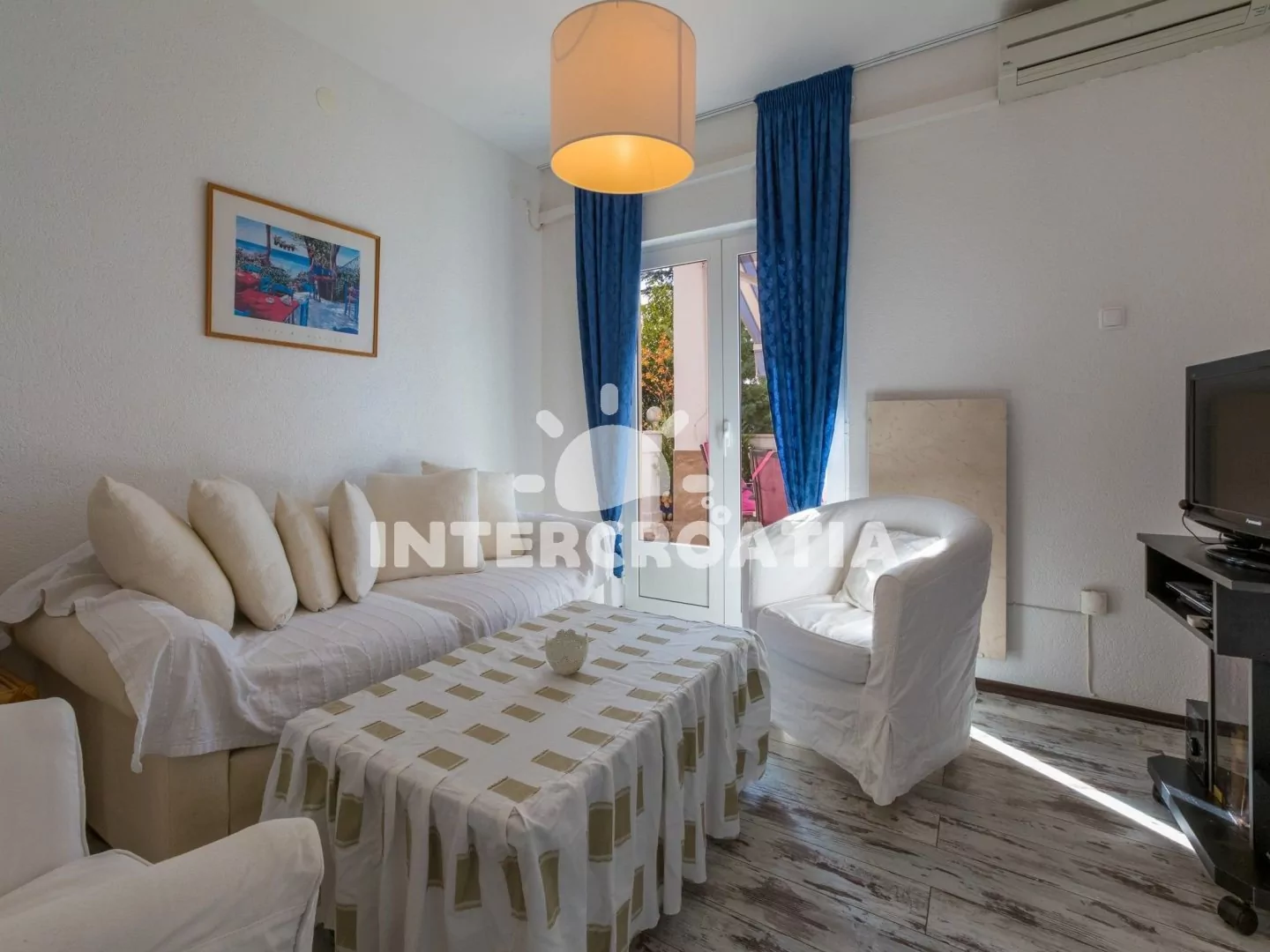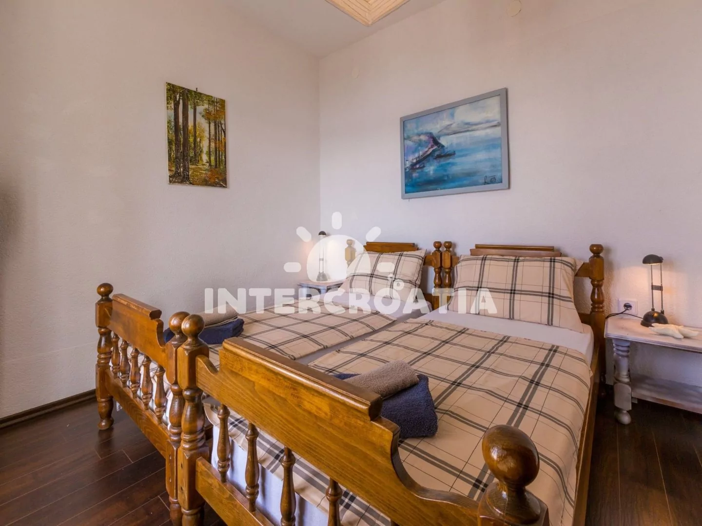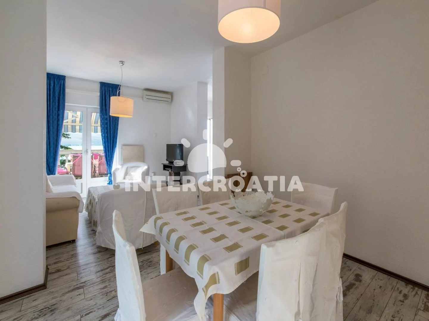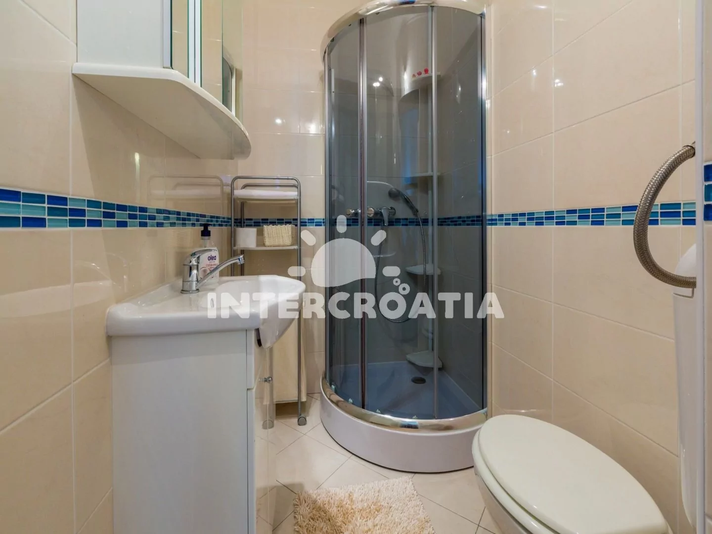 Hezký apartmán (80 m2) v druhém patře vily s vlastní terasou a výhledem na moře je vhodný až pro 6 osob. Obývací pokoj je spojený s kuchyní. Kuchyňská linka je vybavena sporákem, digestoří, troubou, myčkou na nádobí, toustovačem, rychlovarnou konvicí, kávovarem, nádobím a lednicí s mrazákem. Obývací pokoj s jídelním stolem pro 6 osob, sedací soupravou, televizí se satelitním programem, klimatizací a vstupem na terasu. První ložnice s jedním dvoulůžkem a vstupem na terasu. Druhá ložnice s dvoulůžkem. Třetí ložnice s patrovou postelí (lůžka pro 2 osoby) a vstupem na terasu. Dvě koupelny vybaveny vždy se sprchovým koutem, umyvadlem a wc. Hostům je k dispozici parkování u objektu zdarma.