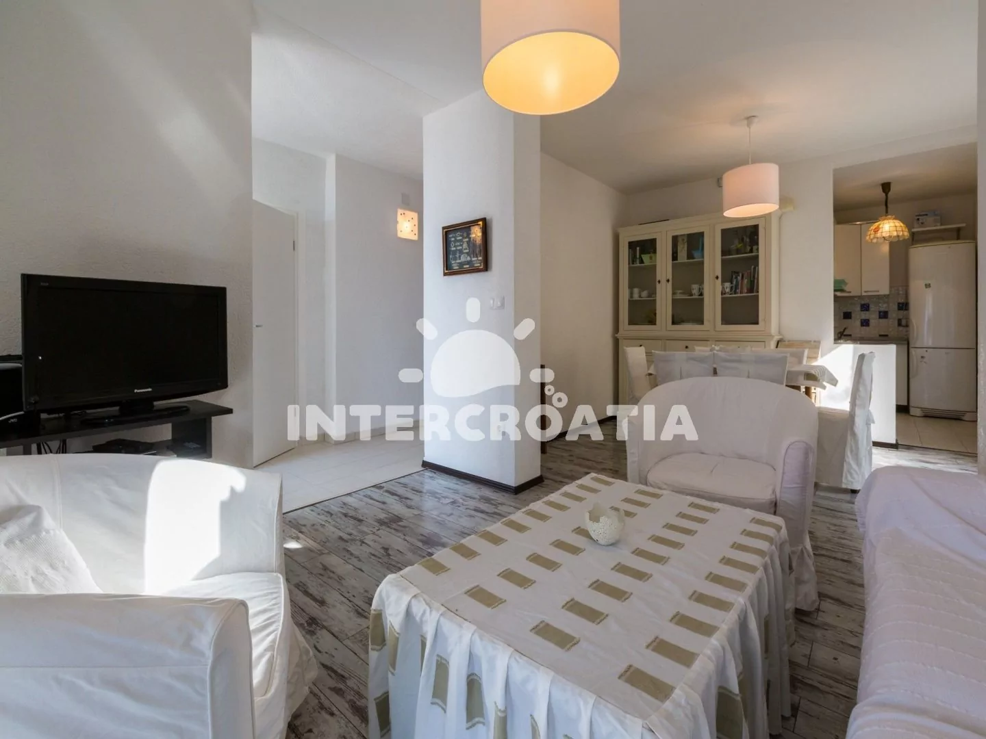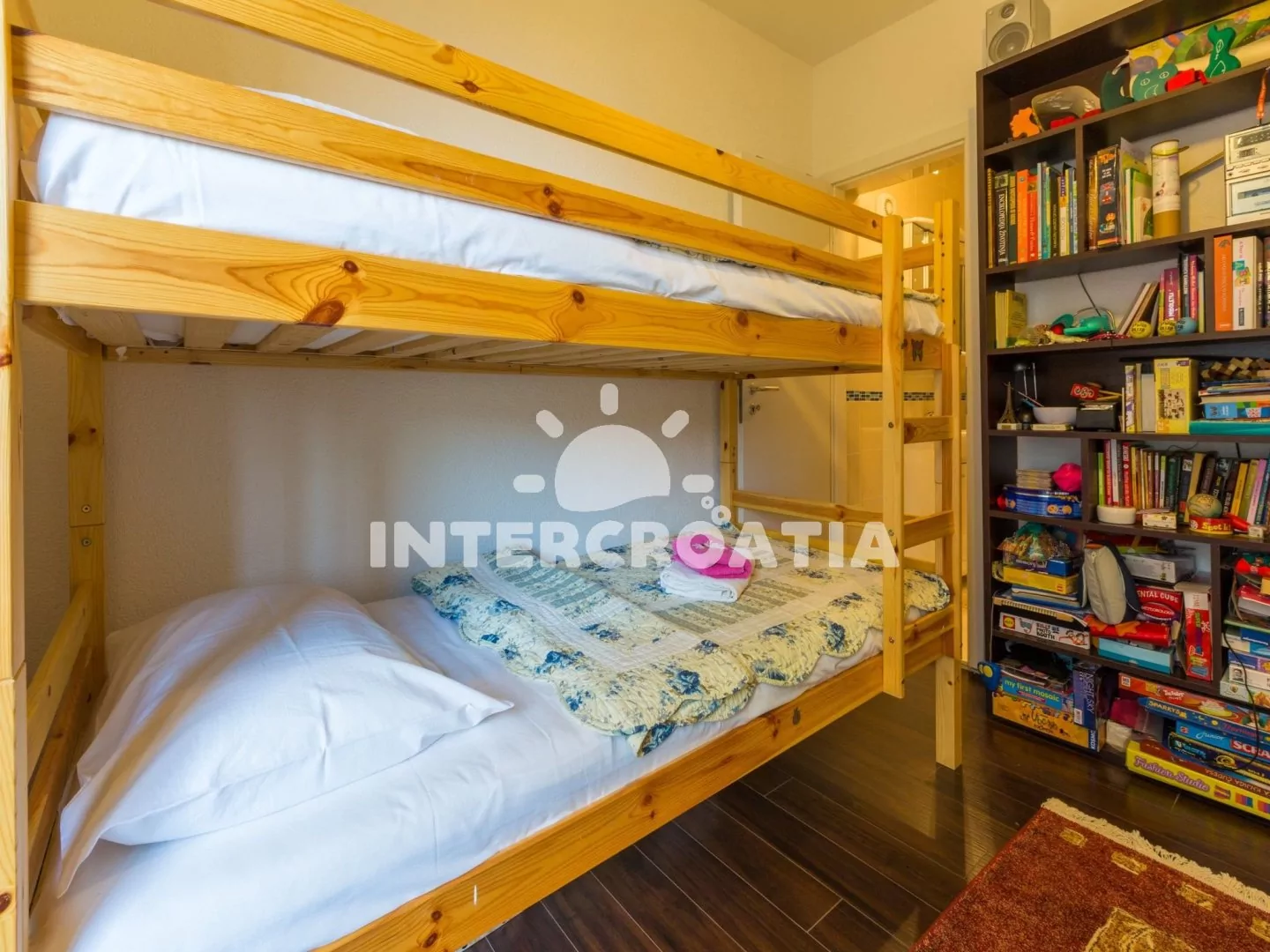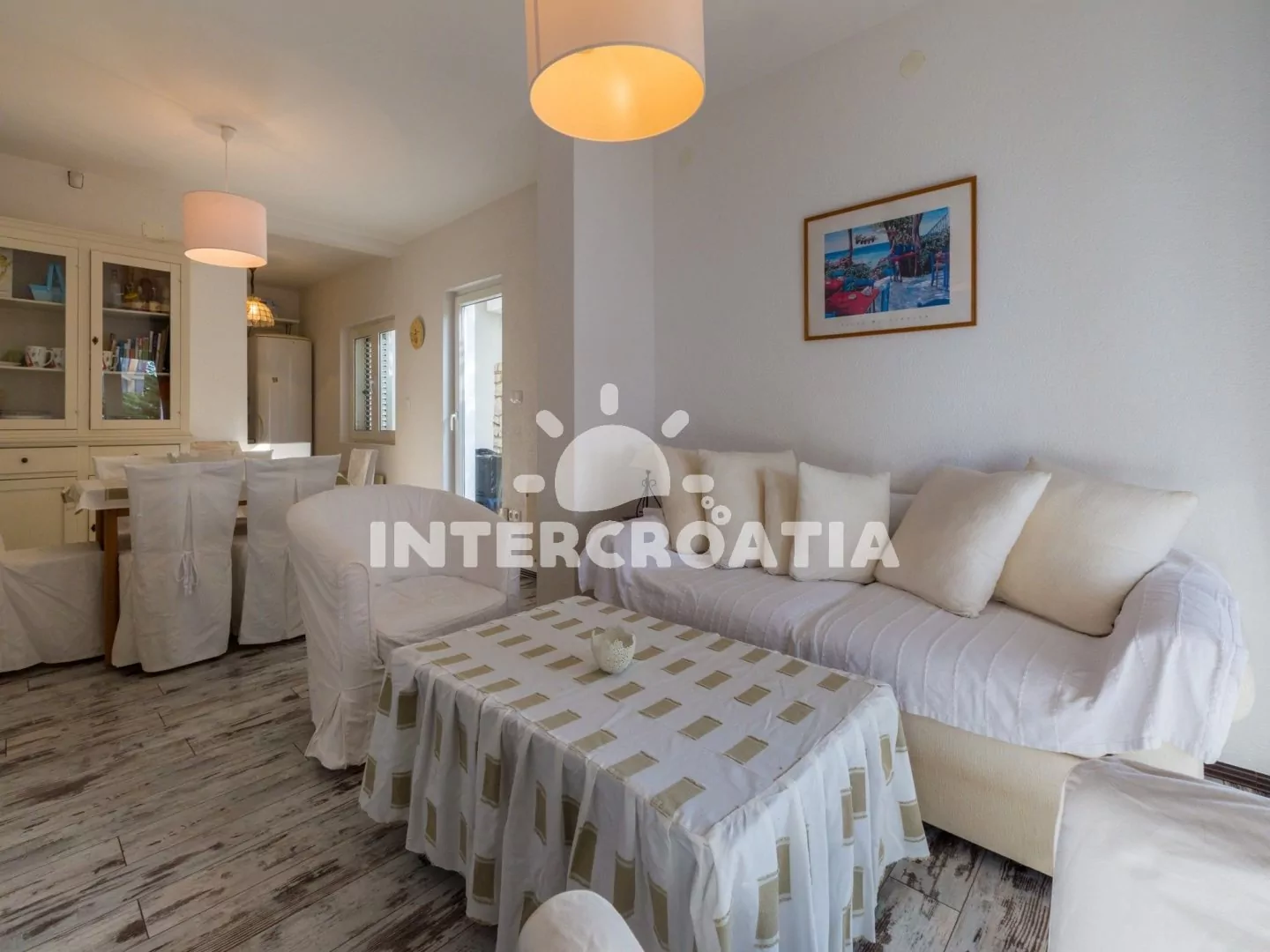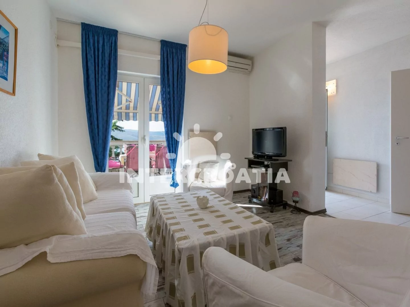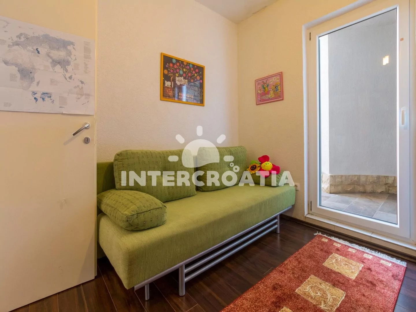 Hezký apartmán (80 m2) v druhém patře vily s vlastní terasou a výhledem na moře je vhodný až pro 6 osob. Obývací pokoj je spojený s kuchyní. Kuchyňská linka je vybavena sporákem, digestoří, troubou, myčkou na nádobí, toustovačem, rychlovarnou konvicí, kávovarem, nádobím a lednicí s mrazákem. Obývací pokoj s jídelním stolem pro 6 osob, sedací soupravou, televizí se satelitním programem, klimatizací a vstupem na terasu. První ložnice s jedním dvoulůžkem a vstupem na terasu. Druhá ložnice s dvoulůžkem. Třetí ložnice s patrovou postelí (lůžka pro 2 osoby) a vstupem na terasu. Dvě koupelny vybaveny vždy se sprchovým koutem, umyvadlem a wc. Hostům je k dispozici parkování u objektu zdarma.