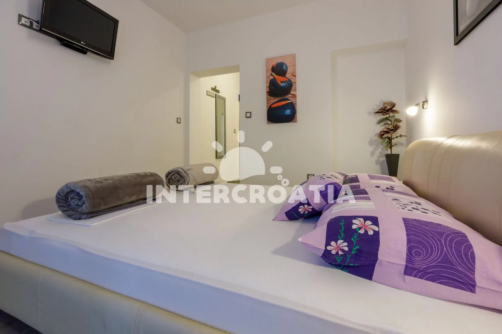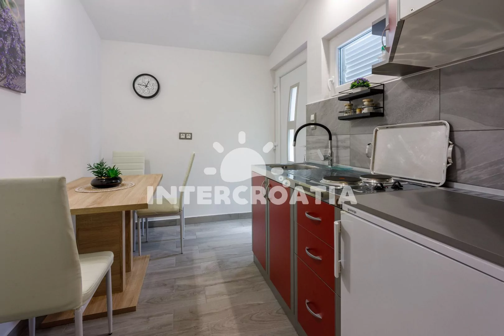 Vkusně zařízený apartmán typu studio (22 m2), s terasou a venkovním posezením. Apartmán se nachází v přízemí domu a je vhodný pro 2 až 3 osoby. Obývací místnost je spojena s kuchyní. Kuchyňská linka je vybavena dvouplotýnkovým vařičem, rychlovarnou konvicí, kávovarem, toustovačem, nádobím a lednicí s mrazákem. Obývací místnost s jídelním stolem pro 3 osoby, pohovkou (rozložitelná na extra lůžko pro 1 osobu), televizí se satelitním programem, jedním dvoulůžkem, klimatizací a vstupem na terasu. Koupelna se sprchovým koutem, umyvadlem a wc. Hostům je k dispozici parkování u objektu zdarma.