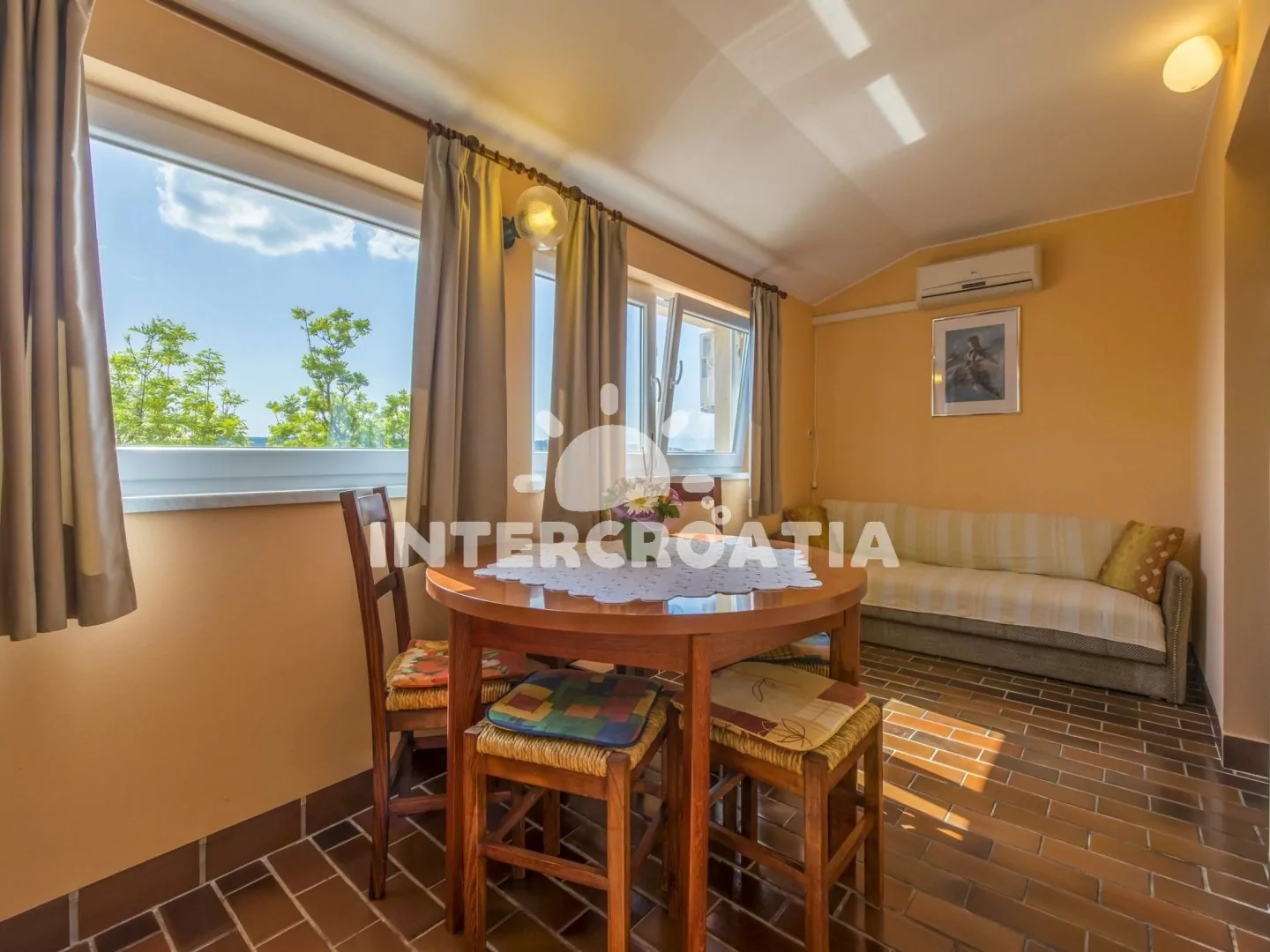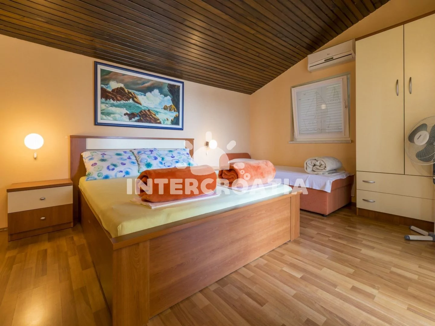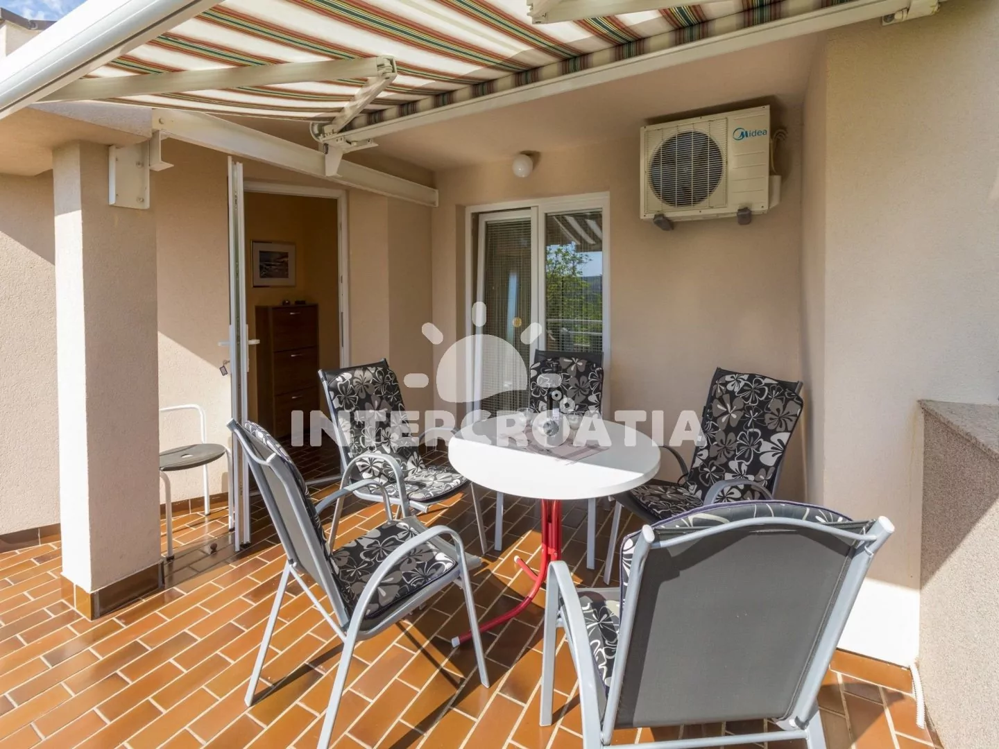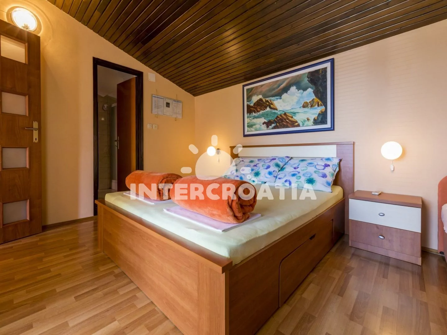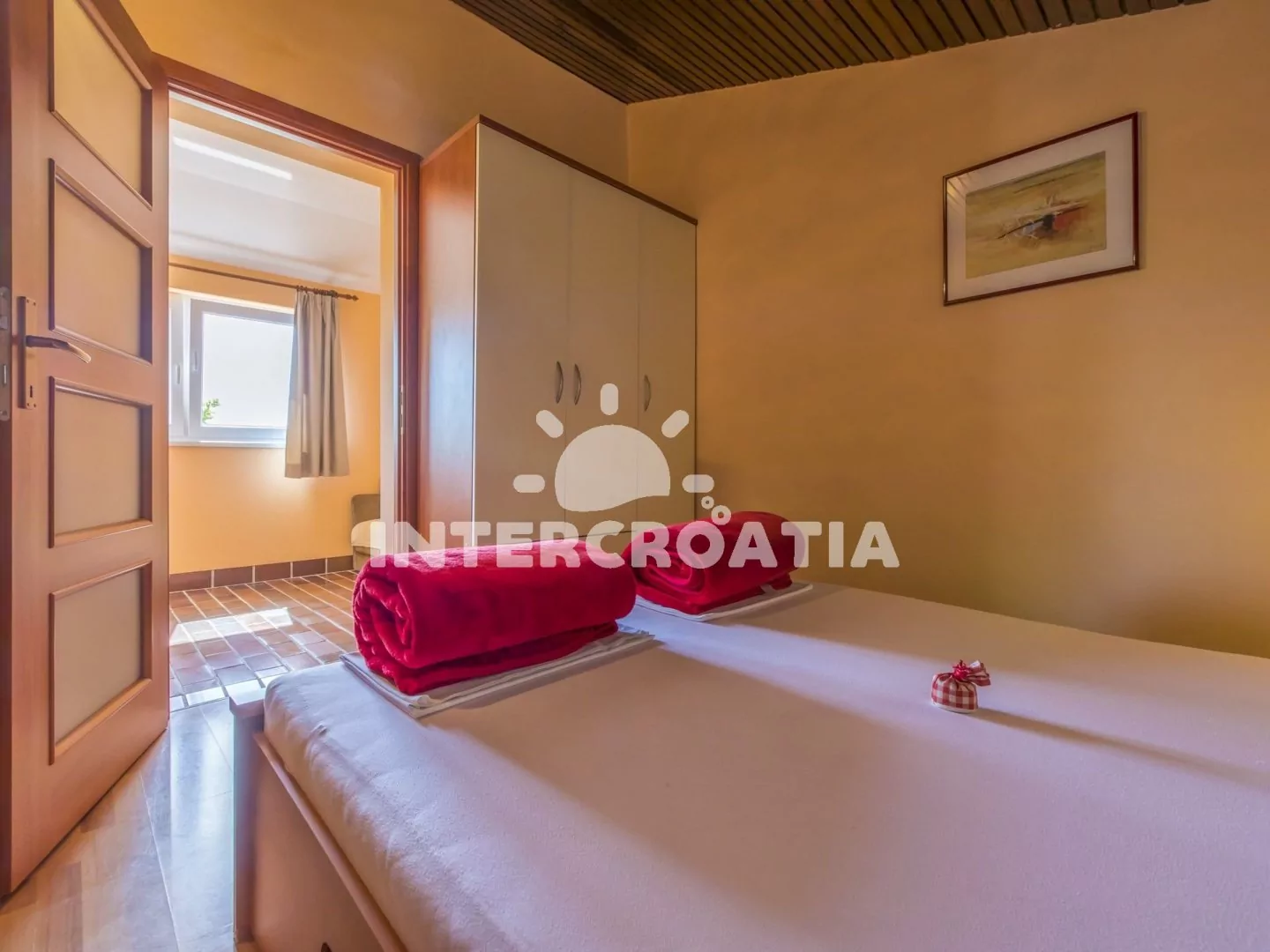 Vkusně zařízený apartmán (60 m2) s terasou, výhledem na moře a venkovním posezením, se nachází v 1. patře domu a je vhodný pro 4 až 5 osob. Obývací pokoj je spojený s kuchyní. Kuchyňská linka je vybavena dvouplotýnkovým vařičem, rychlovarnou konvicí, kávovarem, toustovačem, nádobím a lednicí s mrazákem. Obývací pokoj s jídelním stolem pro 6 osob, pohovkou, televizí se satelitním programem, klimatizací a vstupem na terasu. První ložnice s jedním dvoulůžkem. Druhá ložnice s dvoulůžkem, jednolůžkem, klimatizací a vstupem na terasu. Koupelna se sprchovým koutem, umyvadlem a wc. Hostům je k dispozici parkování u objektu zdarma.