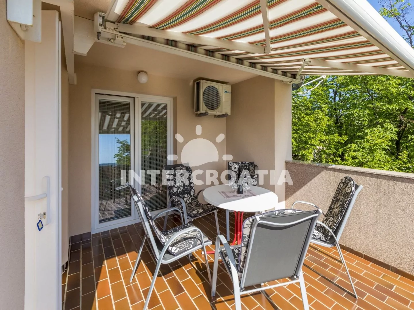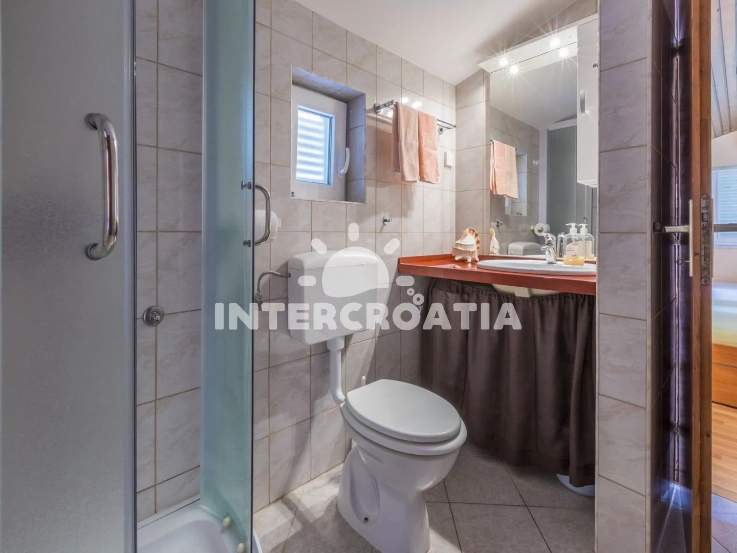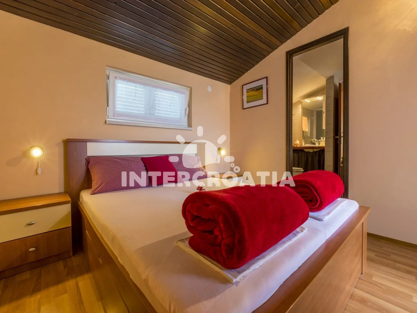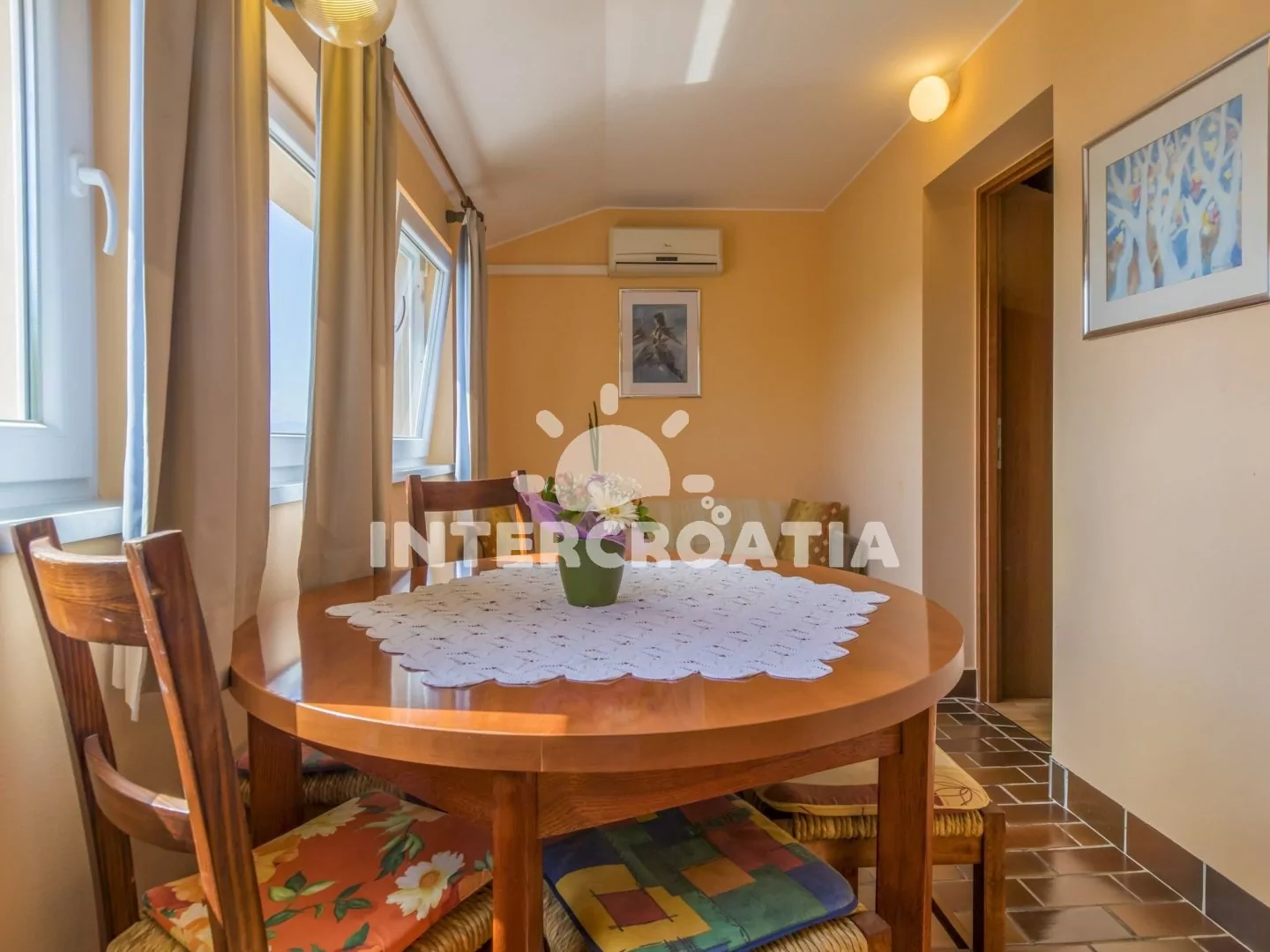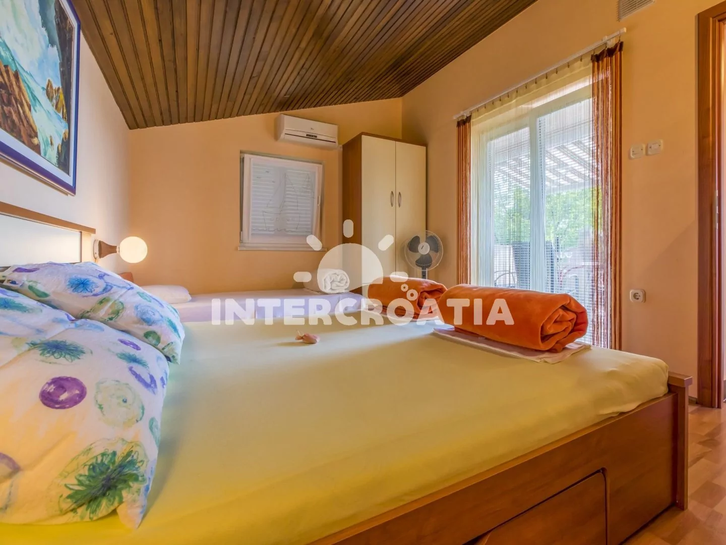 Vkusně zařízený apartmán (60 m2) s terasou, výhledem na moře a venkovním posezením, se nachází v 1. patře domu a je vhodný pro 4 až 5 osob. Obývací pokoj je spojený s kuchyní. Kuchyňská linka je vybavena dvouplotýnkovým vařičem, rychlovarnou konvicí, kávovarem, toustovačem, nádobím a lednicí s mrazákem. Obývací pokoj s jídelním stolem pro 6 osob, pohovkou, televizí se satelitním programem, klimatizací a vstupem na terasu. První ložnice s jedním dvoulůžkem. Druhá ložnice s dvoulůžkem, jednolůžkem, klimatizací a vstupem na terasu. Koupelna se sprchovým koutem, umyvadlem a wc. Hostům je k dispozici parkování u objektu zdarma.