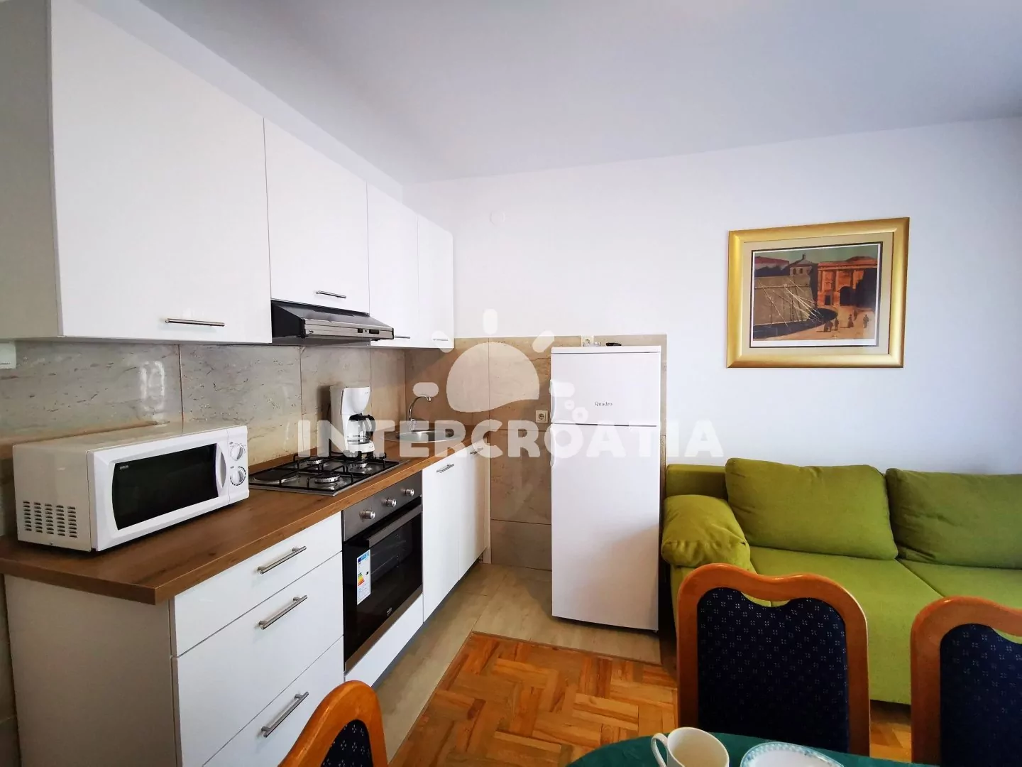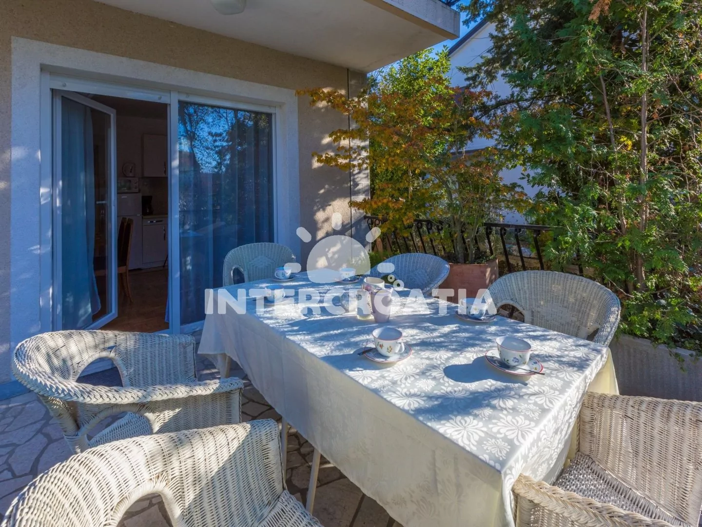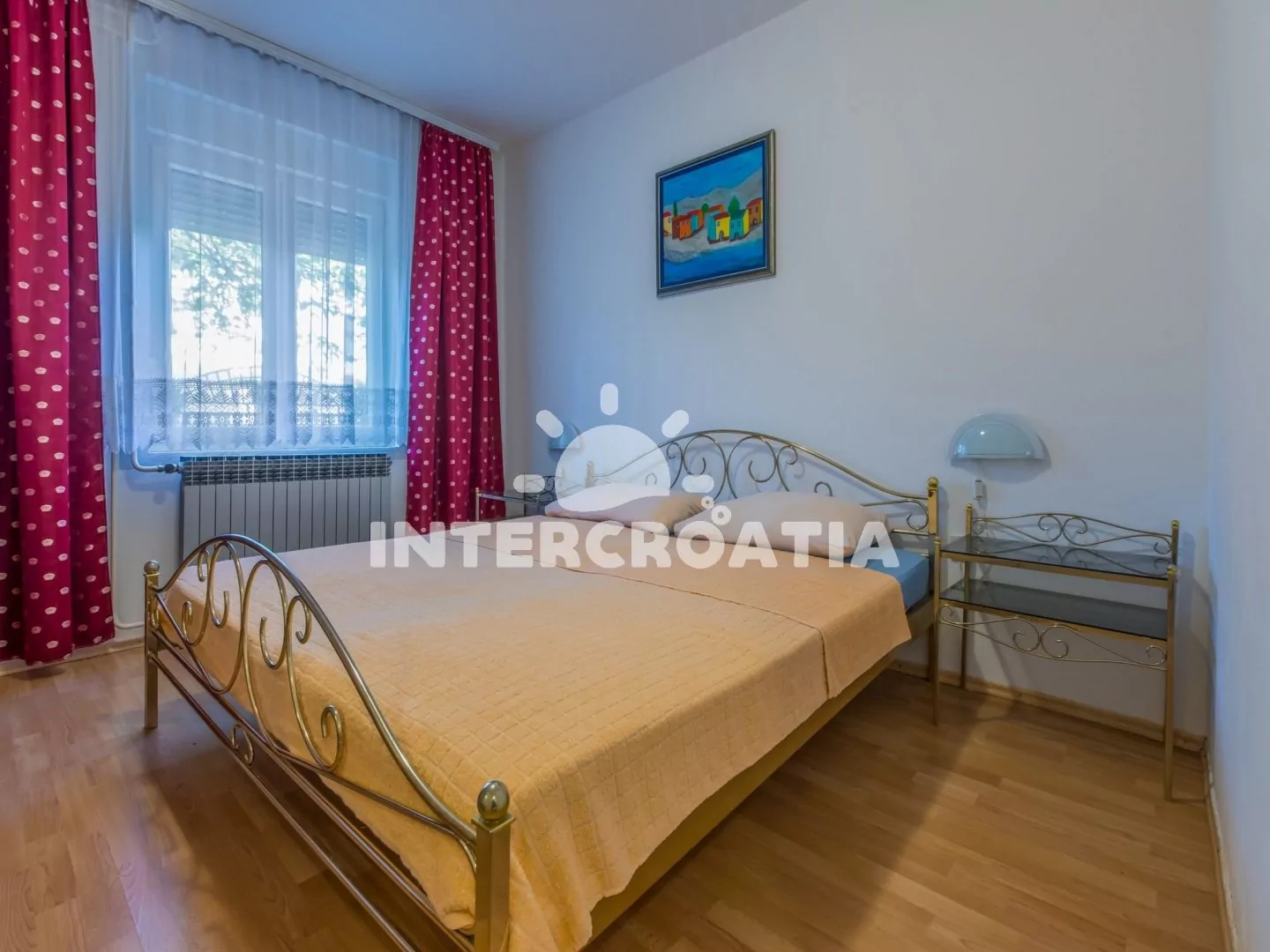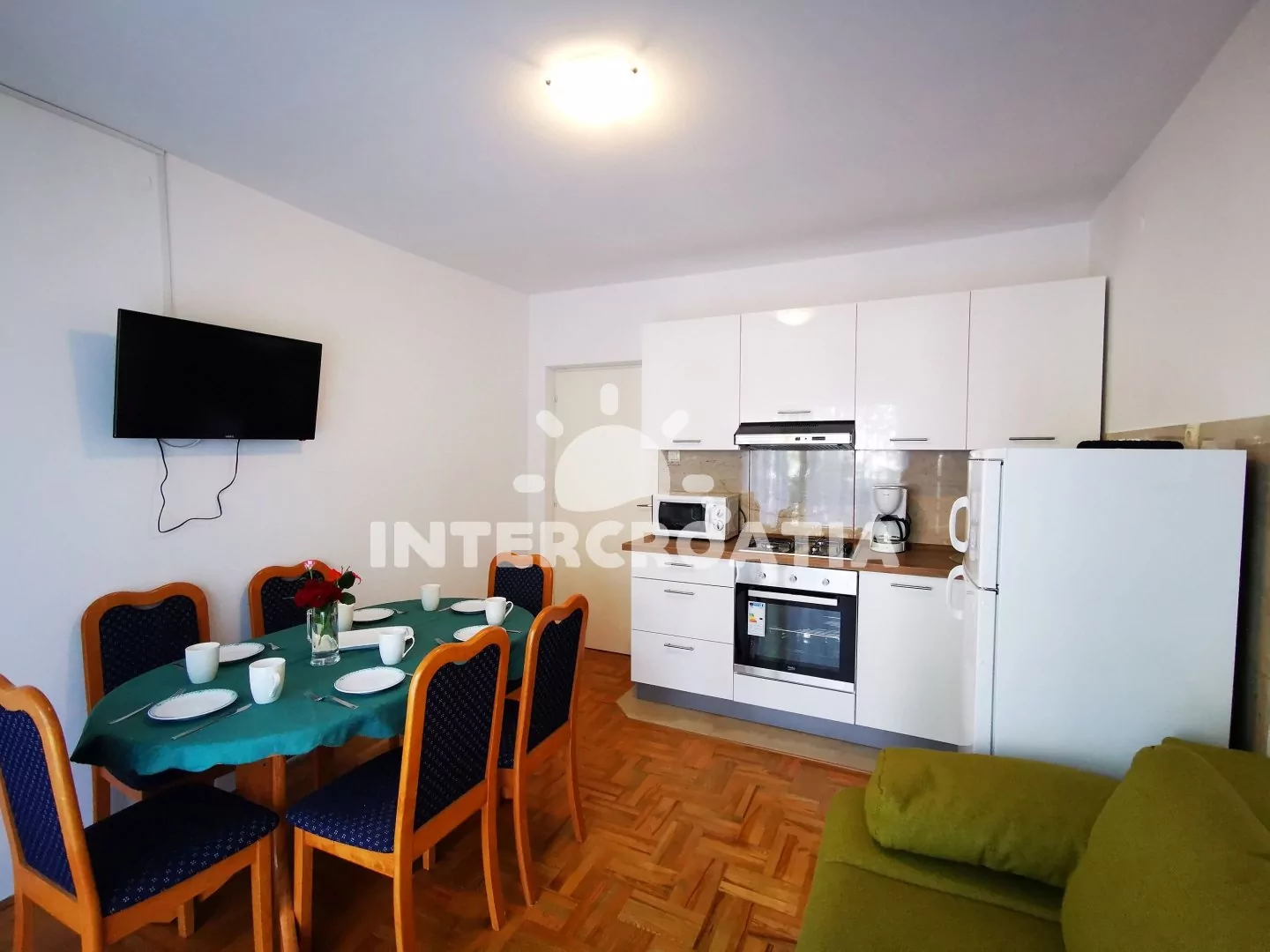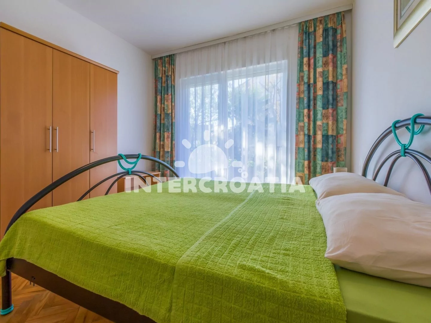 Apartmán (55 m2) s terasou a venkovním posezením se nachází v přízemí domu a je vhodný pro až 6 osob. Obývací pokoj je spojený s kuchyní. Kuchyňská linka je vybavena sporákem s troubou, rychlovarnou konvicí, mikrovlnnou troubou, kávovarem, toustovačem, nádobím a lednicí s mrazákem. Obývací pokoj s jídelním stolem pro 6 osob, pohovkou (rozložitelná na extra lůžko pro 2 osoby), televizí se satelitním programem a vstupem na terasu. Chodba s klimatizací a vstupy do ložnic. První ložnice s dvoulůžkem. Druhá ložnice s dvoulůžkem a vstupem na terasu. Koupelna se sprchovým koutem, umyvadlem, pračkou a wc. Hostům je k dispozici parkování u objektu zdarma.