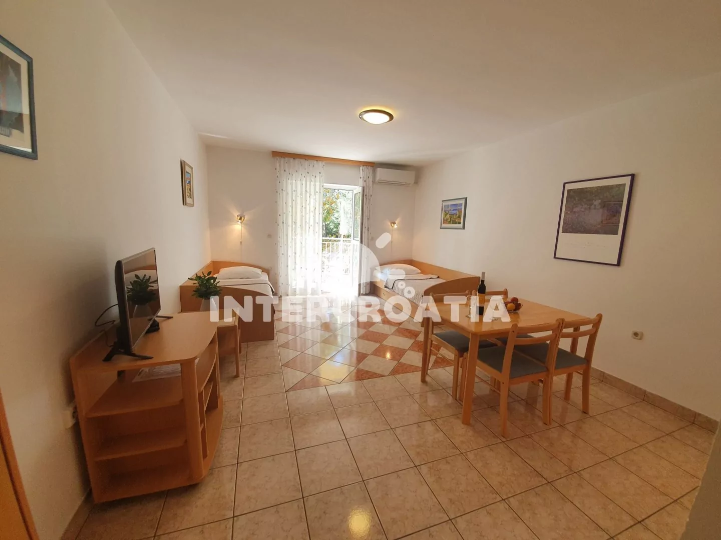 Apartmán (35 m2) typu studio s vlastním balkonem se nachází v 1. patře vily. Obývací místnost je spojena s kuchyní. Kuchyňská linka je vybavena varnou deskou, digestoří, rychlovarnou konvicí, kávovarem, toustovačem, nádobím a lednicí s mrazákem. Obývací místnost s jídelním stolem pro 4 osoby, dvěma jednolůžky, televizí se satelitním programem, klimatizací a vstupem na balkon. Koupelna se sprchovým koutem, umyvadlem, fénem a wc. Hostům je k dispozici parkování u objektu zdarma.