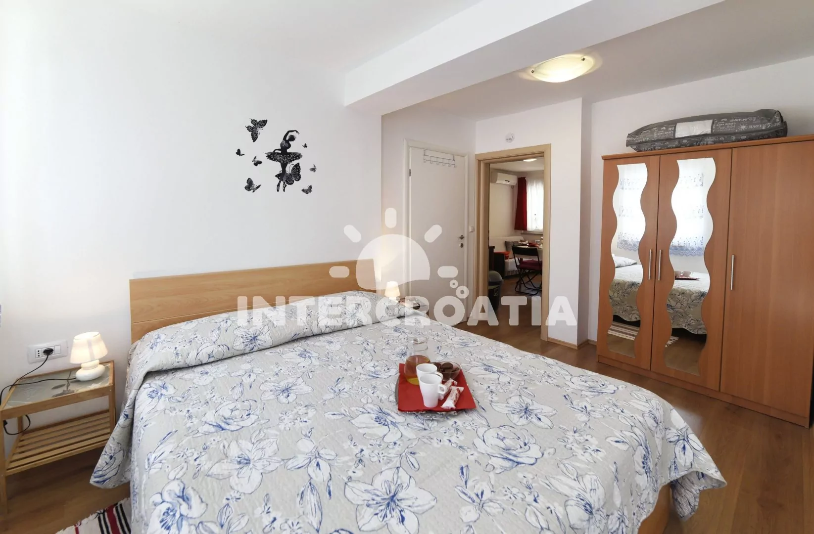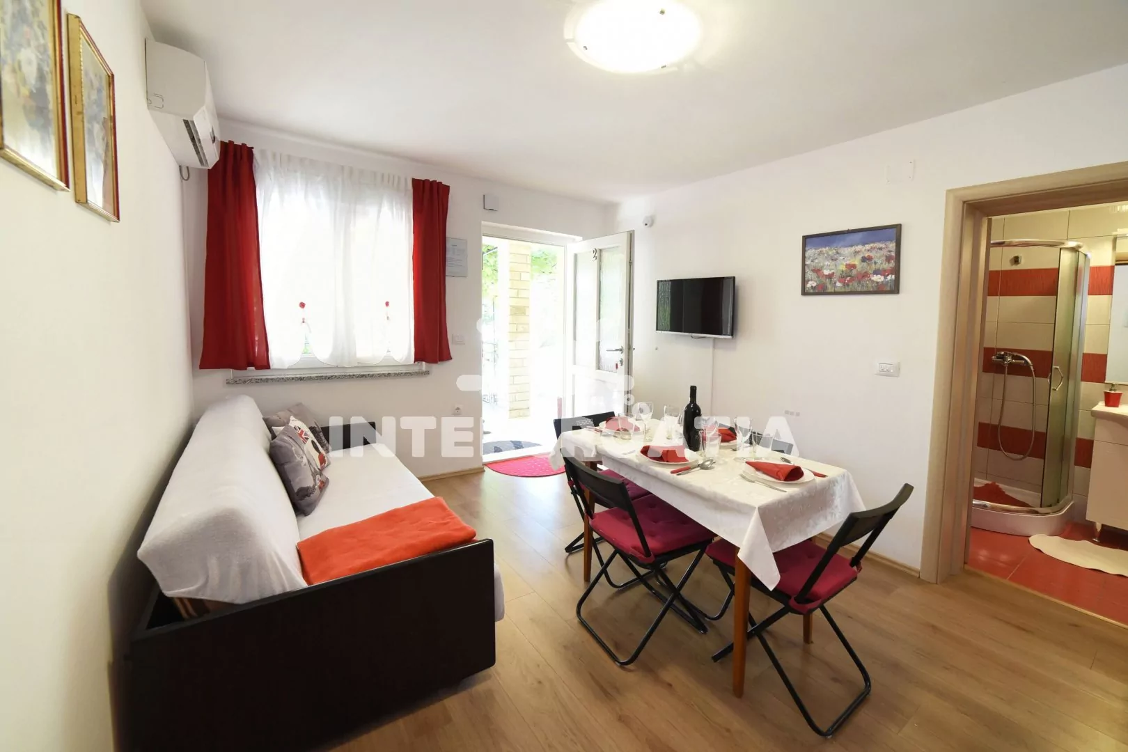 Apartmán (30 m2) s balkonem a venkovním posezením se nachází v přízemí domu. Apartmán má 1 ložnici a je vhodný pro 2 až 4 osoby. Obývací pokoj je spojený s kuchyní. Kuchyňská linka je vybavena dvouplotýnkovým vařičem, mikrovlnnou troubou, rychlovarnou konvicí, nádobím a lednicí s mrazákem. Obývací pokoj s jídelním stolem, pohovkou (rozložitelná na extra lůžko pro 2 osoby), televizí se satelitním programem, klimatizací a vstupem na balkon. Ložnice s jedním dvoulůžkem. Koupelna se sprchovým koutem, umyvadlem, fénem a wc. Dále k dispozici pračka. Hostům je k dispozici parkování u objektu zdarma.