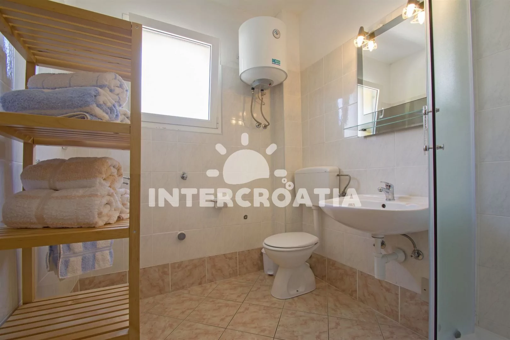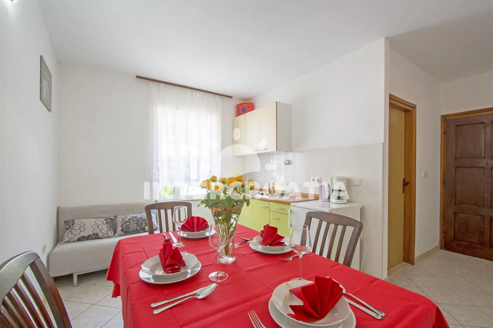 Apartmán (50 m2) s terasou, posezením a výhledem na moře se nachází ve 2. patře domu. Apartmán má 1 ložnici a je vhodný pro 2 až 3 osoby. Obývací pokoj je spojený s kuchyní. Kuchyňská linka je vybavena dvouplotýnkovým vařičem, rychlovarnou konvicí, kávovarem, nádobím a lednicí s mrazákem. Obývací pokoj s jídelním stolem, pohovkou (rozložitelná na extra lůžko pro 1 osobu), televizí se satelitním programem, klimatizací a vstupem na terasu. Ložnice s jedním dvoulůžkem. Koupelna se sprchovým koutem, umyvadlem a wc. Hostům je k dispozici parkování u objektu zdarma.