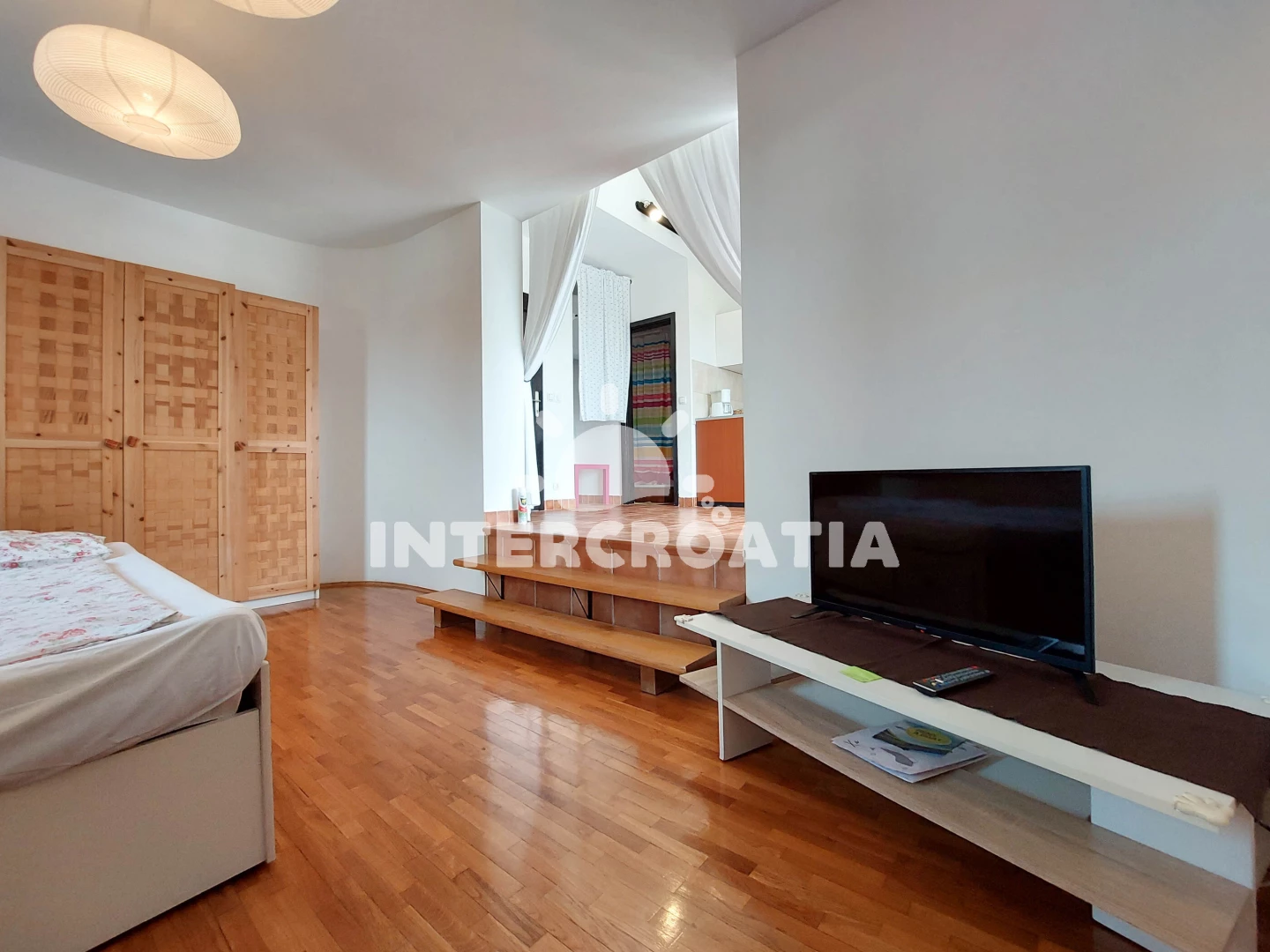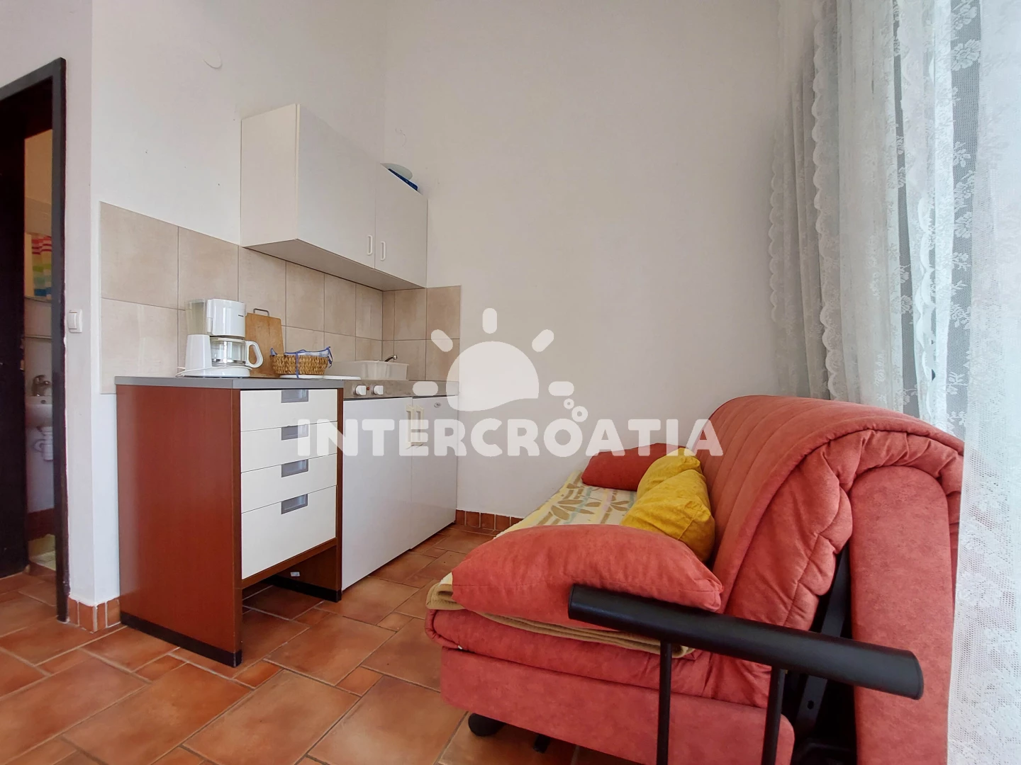 Apartmán (37 m2) typu studio s balkonem a venkovním posezením se nachází v 1. patře domu. Obývací místnost je spojena s kuchyní. Kuchyňská linka je vybavena dvouplotýnkovým vařičem, kávovarem, nádobím a lednicí s mrazákem. Obývací místnost s pohovkou, rozložitelným dvoulůžkem, přistýlkou pro 1 osobu, televizí se satelitním programem a vstupem na balkon. Koupelna se sprchovým koutem, umyvadlem a wc. Hostům je k dispozici parkování u objektu zdarma.