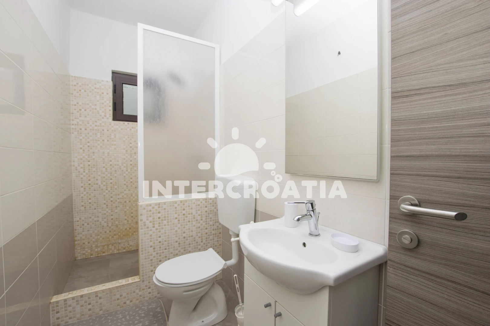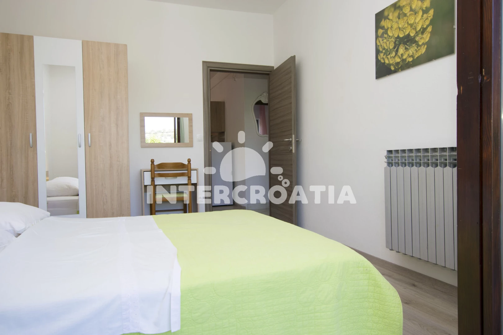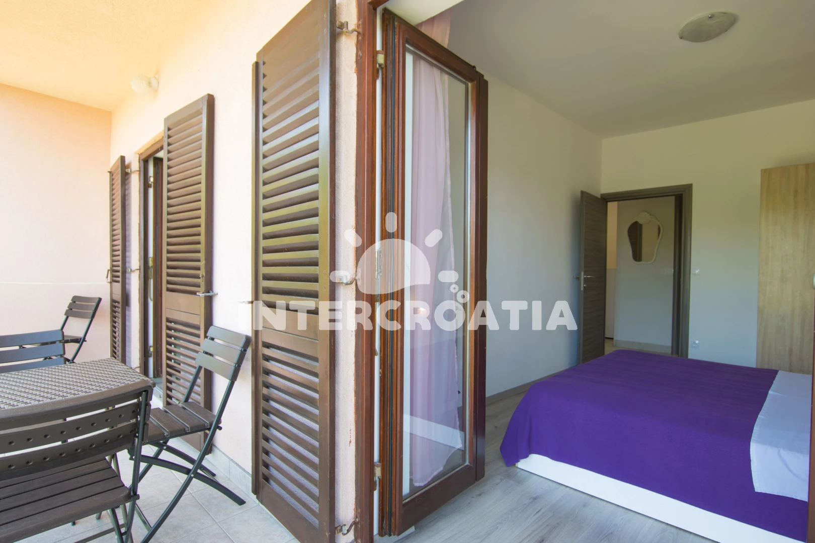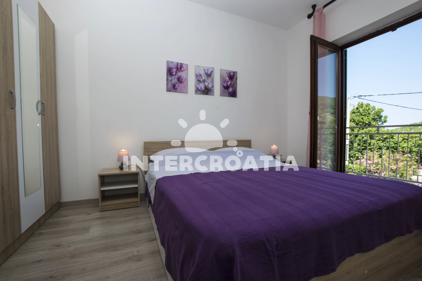 Apartmán (56 m2) s terasou, s balkonem, a výhledem na moře. Nachází se v 1. patře objektu. Apartmán má 2 ložnice a je vhodný pro až 5 osob. Kuchyňská linka je vybavena varnou deskou, troubou, toustovačem, kávovarem, rychlovarnou konvicí, nádobím, lednicí, mrazákem. V obývací místnosti je rozložitelná pohovka (extra lůžko pro 1 osobu). K dispozici televize se satelitním programem. První ložnice s dvoulůžkem. Druhá ložnice s dvoulůžkem, 2 jednolůžky. Koupelna se sprchovým koutem, umyvadlem, fénem a WC.