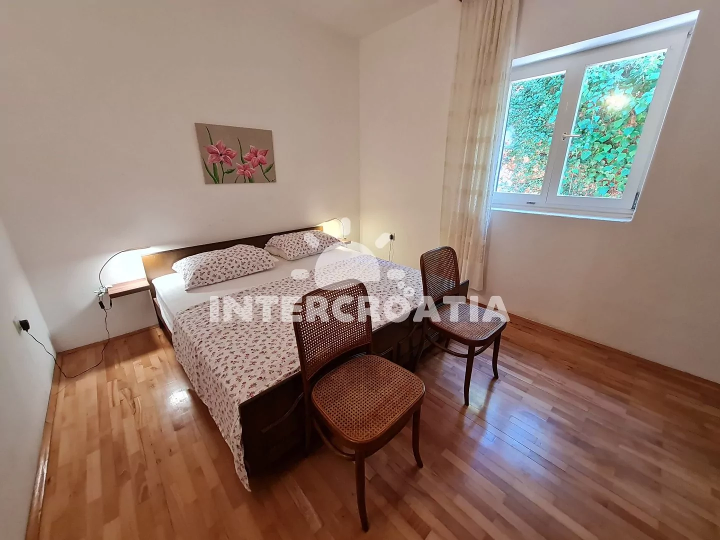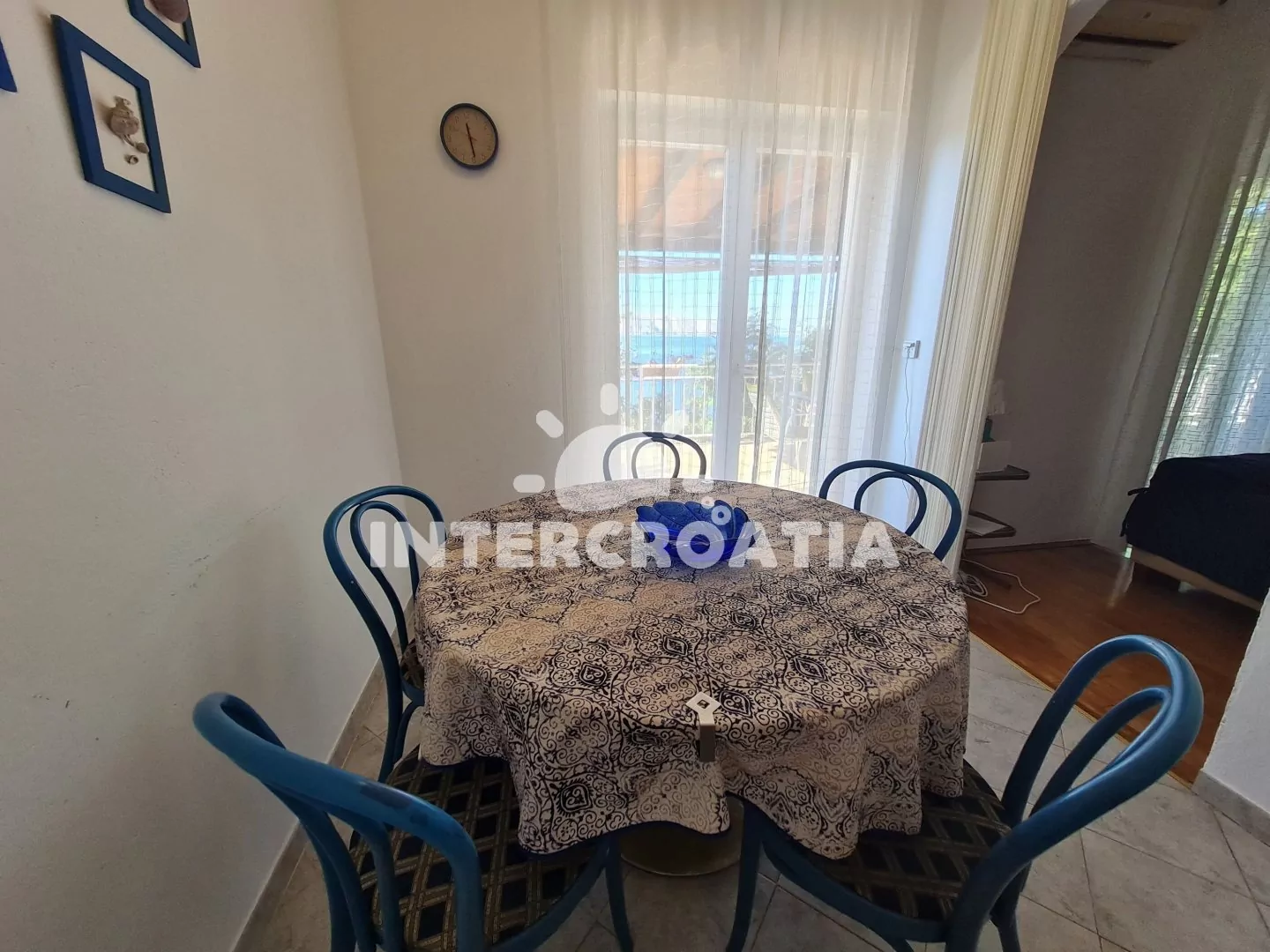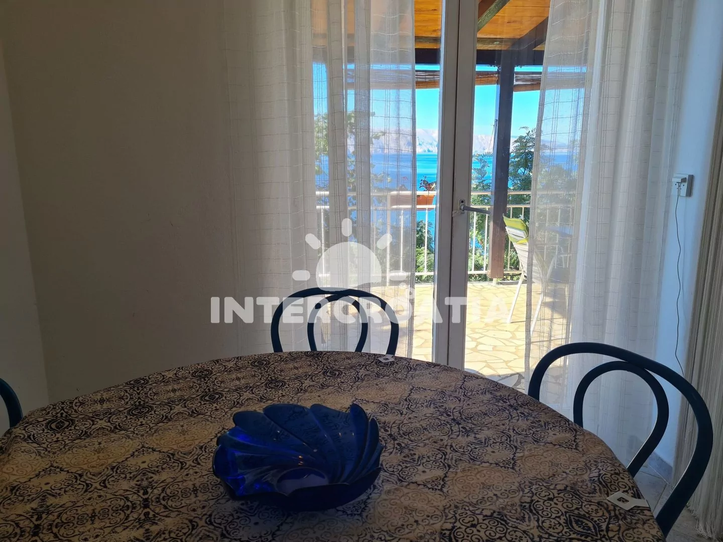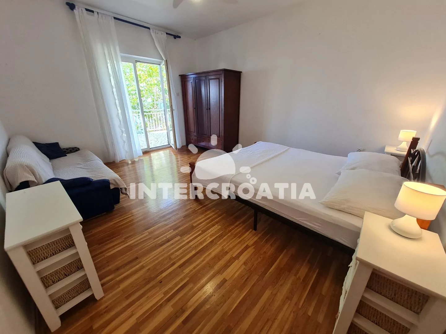 Apartmán (100 m2) s terasou, venkovním posezením a výhledem na moře se nachází v 1. patře domu. Apartmán má 3 ložnice a je vhodný pro až 6 osob. Kuchyň s jídelním stolem pro 5 osob, vstupem na terasu, kuchyňskou linkou se sporákem, troubou, rychlovarnou konvicí, kávovarem, nádobím a lednicí s mrazákem. Obývací pokoj s rohovou pohovkou, televizí se satelitním programem, klimatizací a vstupem na terasu. Koupelna s vanou, sprchovou zástěnou, umyvadlem, bidetem a wc. Hostům je k dispozici parkování u objektu zdarma.