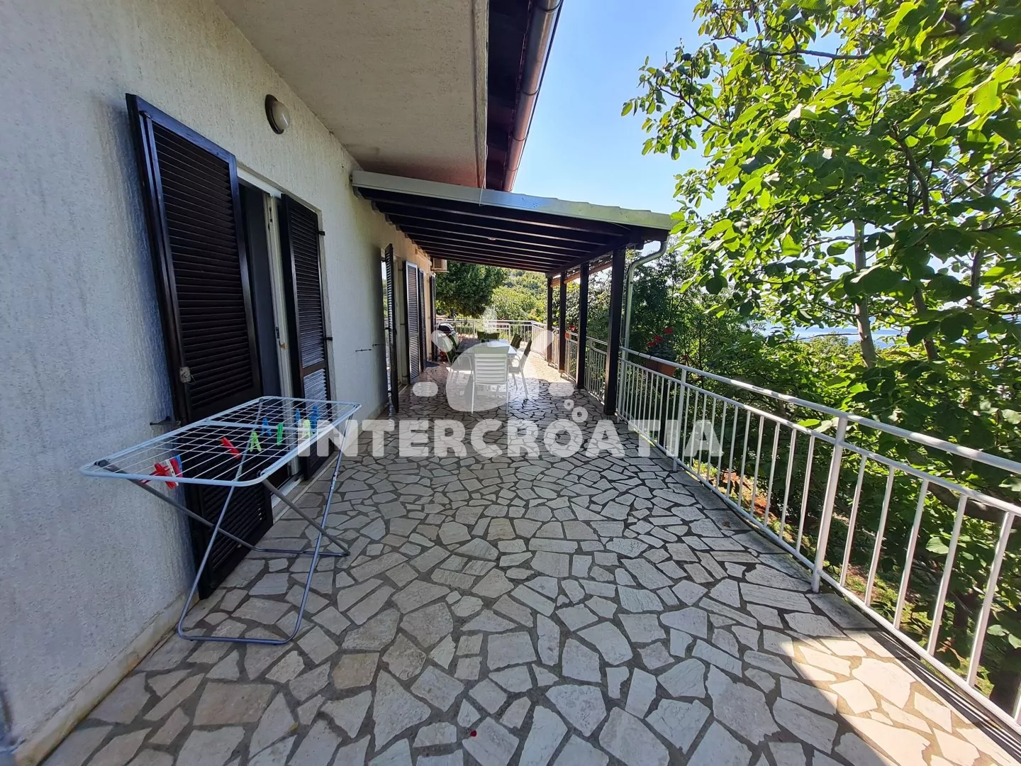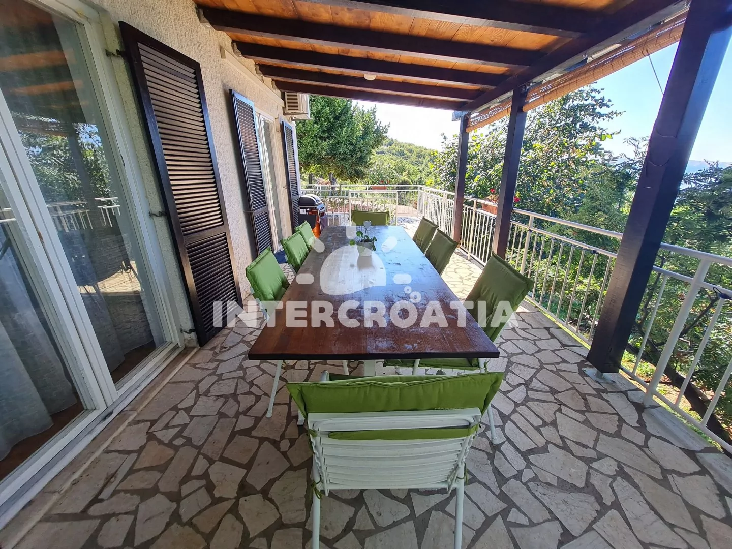 Apartmán (100 m2) s terasou, venkovním posezením a výhledem na moře se nachází v 1. patře domu. Apartmán má 3 ložnice a je vhodný pro až 6 osob. Kuchyň s jídelním stolem pro 5 osob, vstupem na terasu…