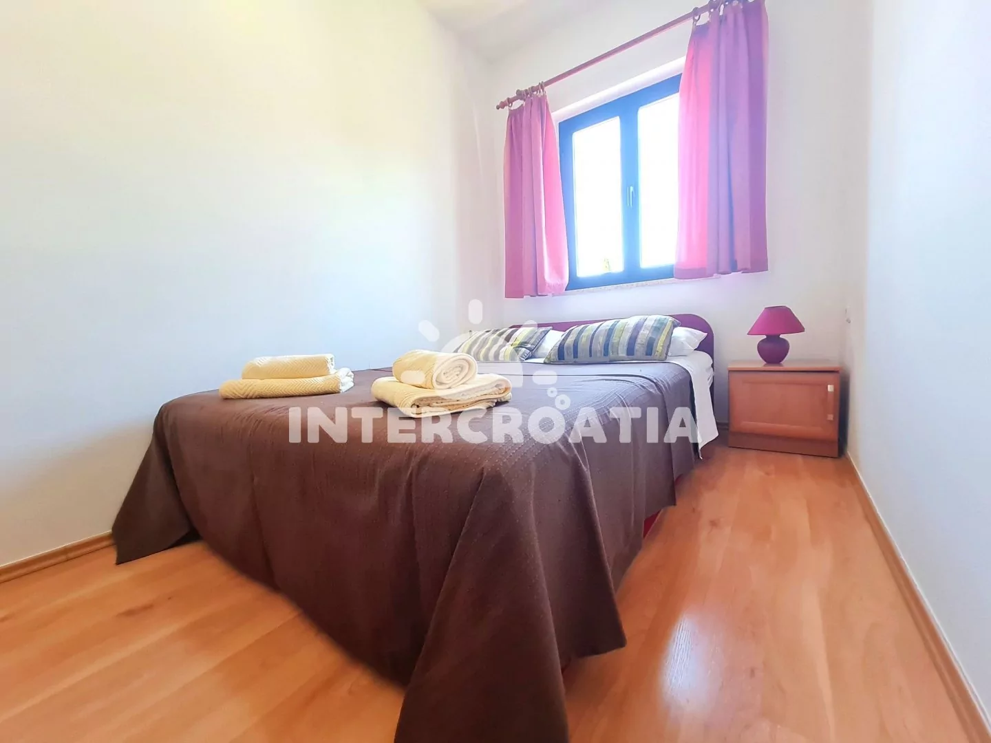 Apartmán (44 m2) s balkonem, venkovním posezením a bočním výhledem na moře se nachází v 1. patře domu. Apartmán má 2 ložnice a je vhodný pro 4 až 6 osob. Obývací pokoj je spojený s kuchyní. Kuchyňská linka je vybavena varnou deskou, digestoří, mikrovlnnou troubou, rychlovarnou konvicí, kávovarem, toustovačem, nádobím a lednicí s mrazákem. Obývací pokoj s pohovkou (rozložitelná na extra lůžko pro 2 osoby), televizí, klimatizací a vstupem na balkon. První ložnice s dvoulůžkem a vstupem na balkon. Druhá ložnice s jedním dvoulůžkem. Koupelna s vanou, umyvadlem, pračkou a wc. Hostům je k dispozici parkování u objektu zdarma.