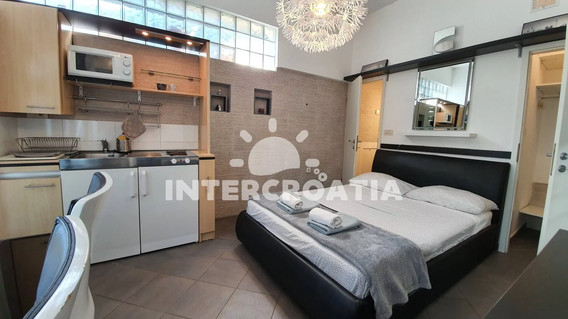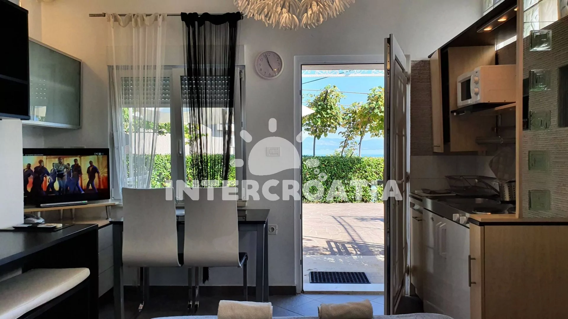 Apartmán (18 m2) typu studio s terasou a výhledem na moře se nachází v přízemí vily a je vhodný pro 2 osoby. Obývací místnost je spojena s kuchyní. Kuchyňská linka je vybavena dvouplotýnkovým vařičem…