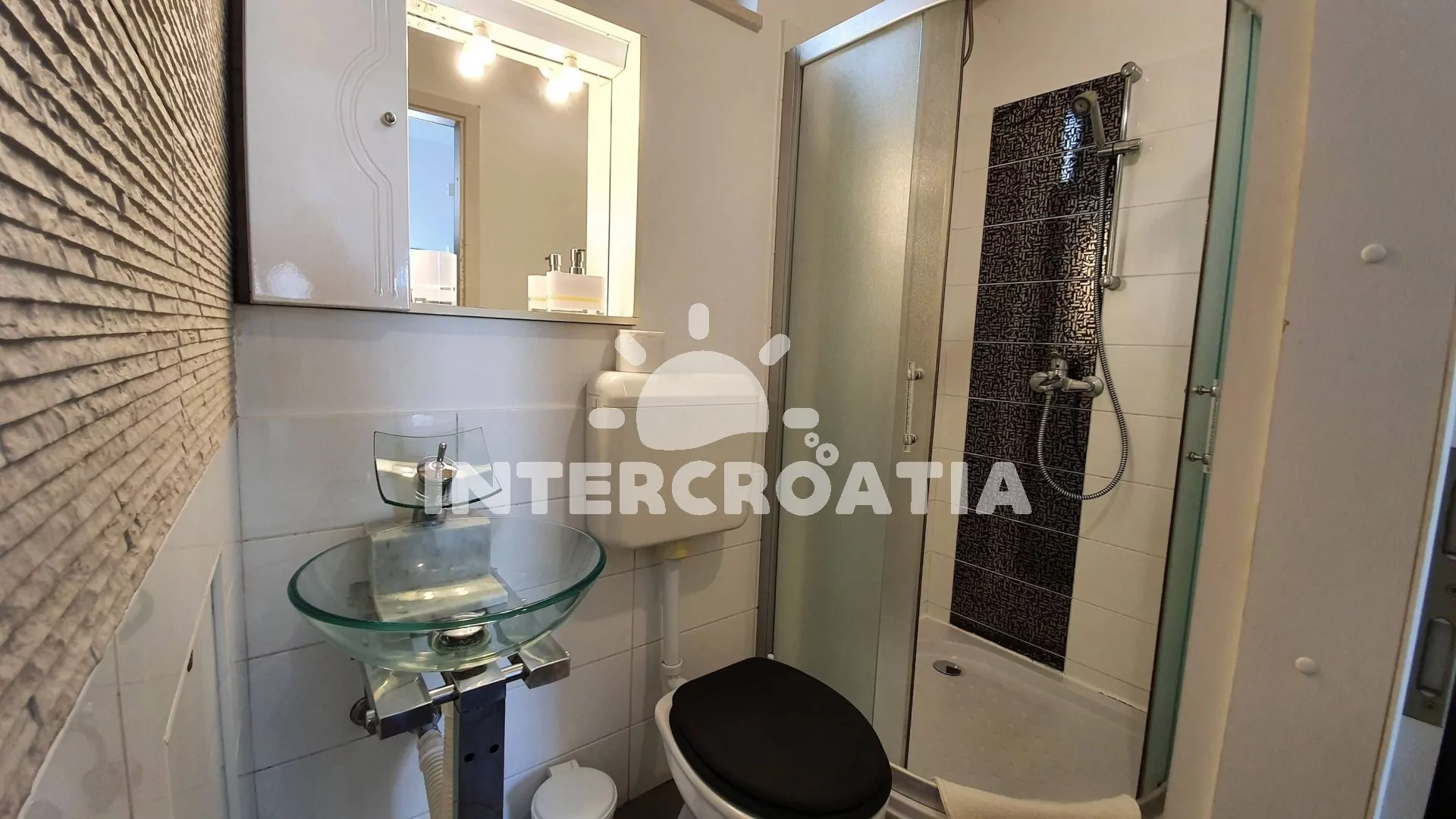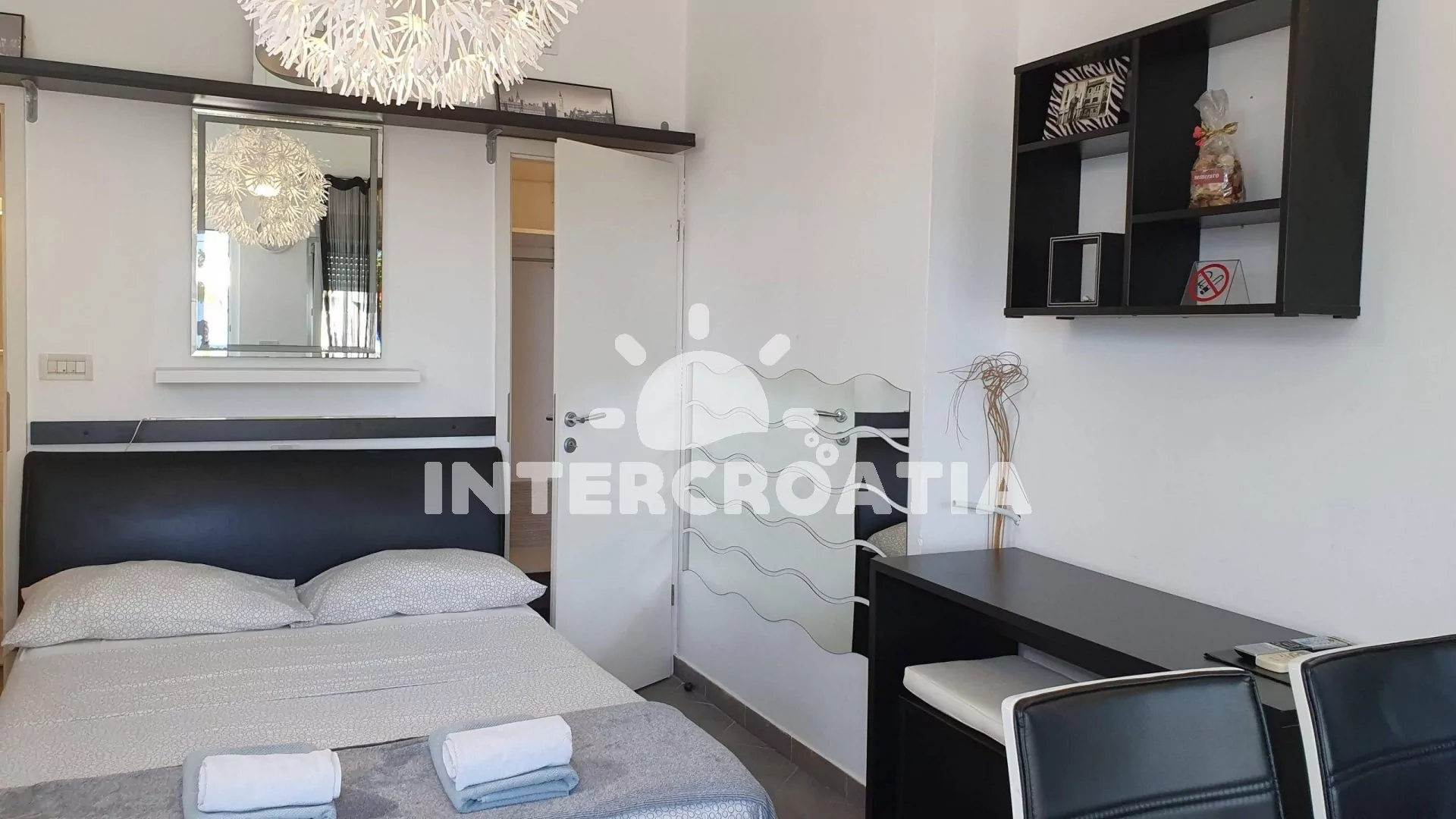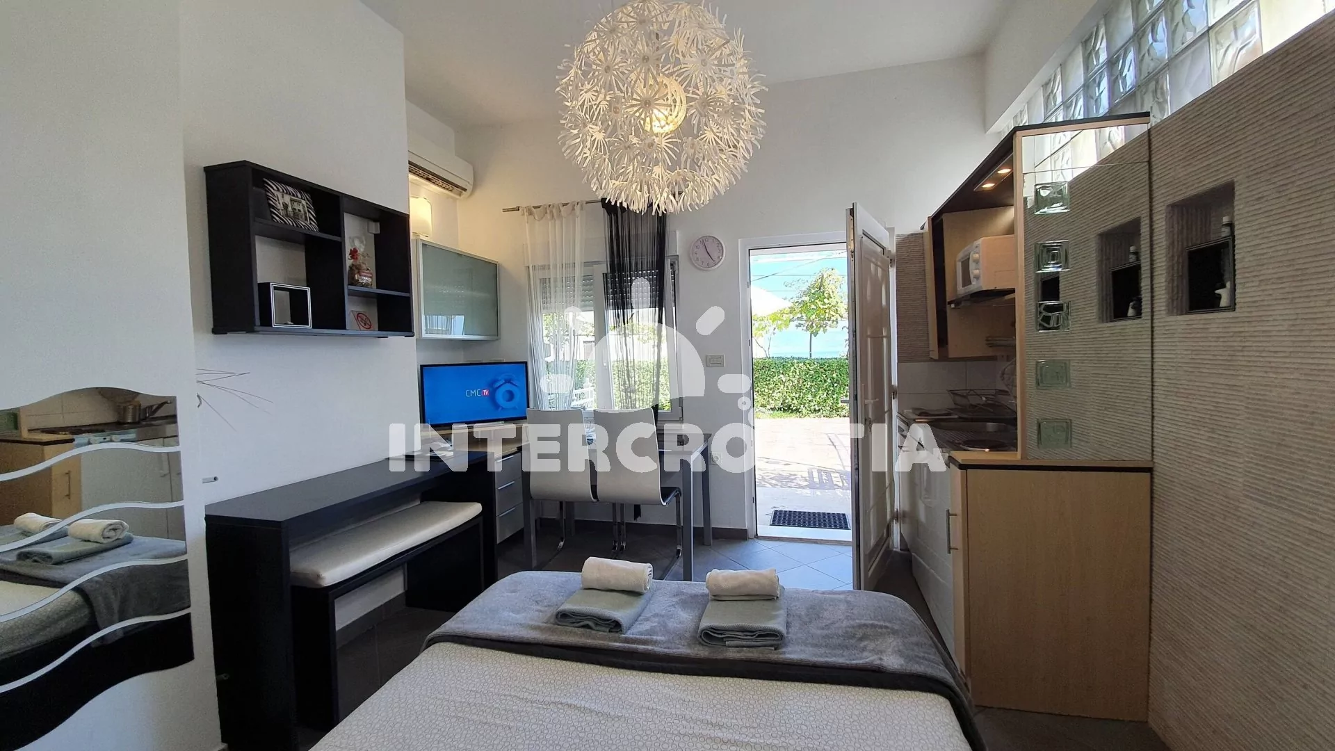 Apartmán (18 m2) typu studio s terasou a výhledem na moře se nachází v přízemí vily a je vhodný pro 2 osoby. Obývací místnost je spojena s kuchyní. Kuchyňská linka je vybavena dvouplotýnkovým vařičem, rychlovarnou konvicí a kávovarem (na vyžádání), nádobím, lednicí s mrazákem a mikrovlnnou troubou. Obývací místnost s jídelním stolem, televizí se satelitním programem, dvoulůžkem, klimatizací a vstupem na terasu. Koupelna se sprchovým koutem, umyvadlem, fénem (na vyžádání u majitele) a wc. Hostům je k dispozici parkování u objektu zdarma.