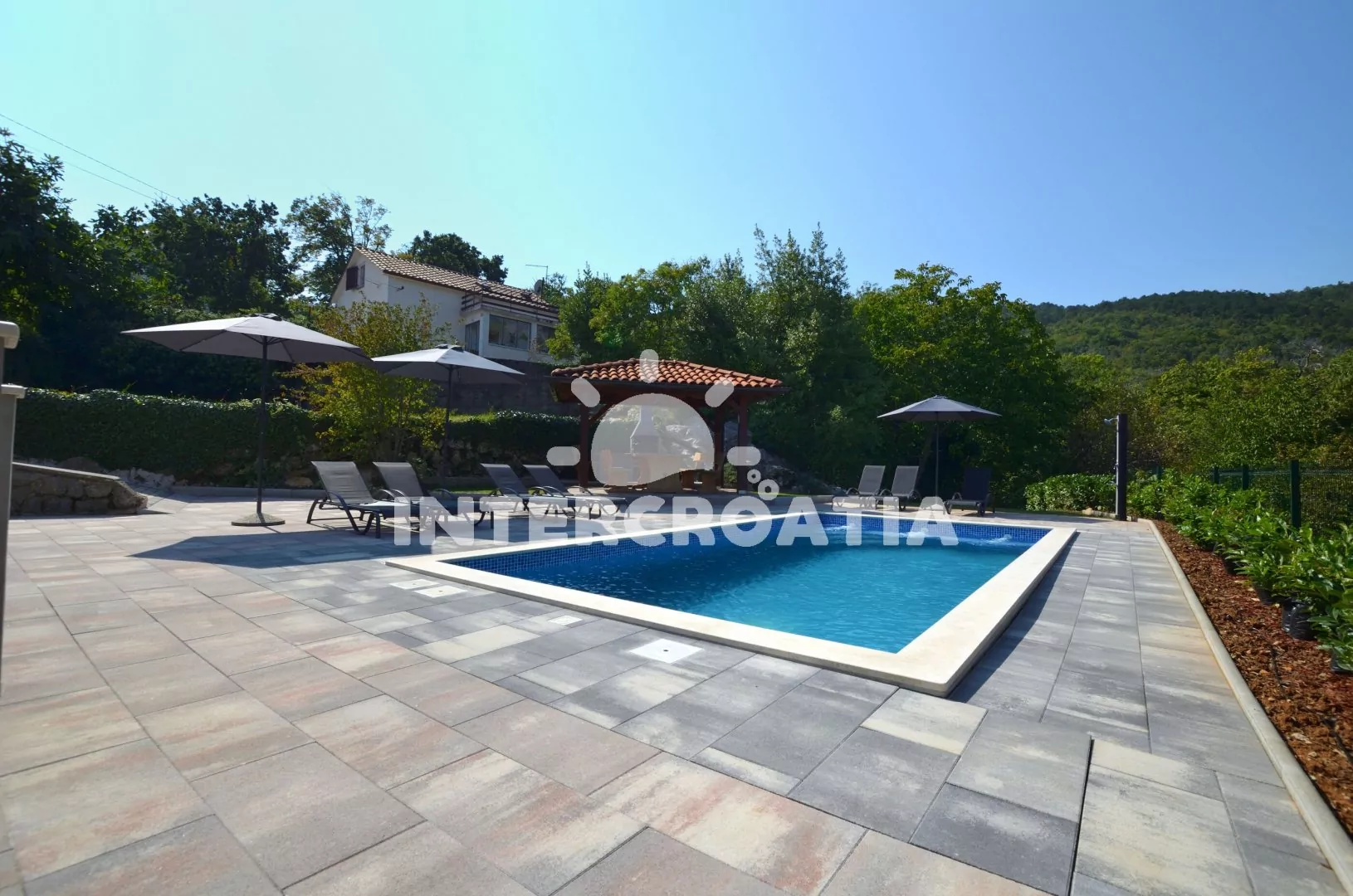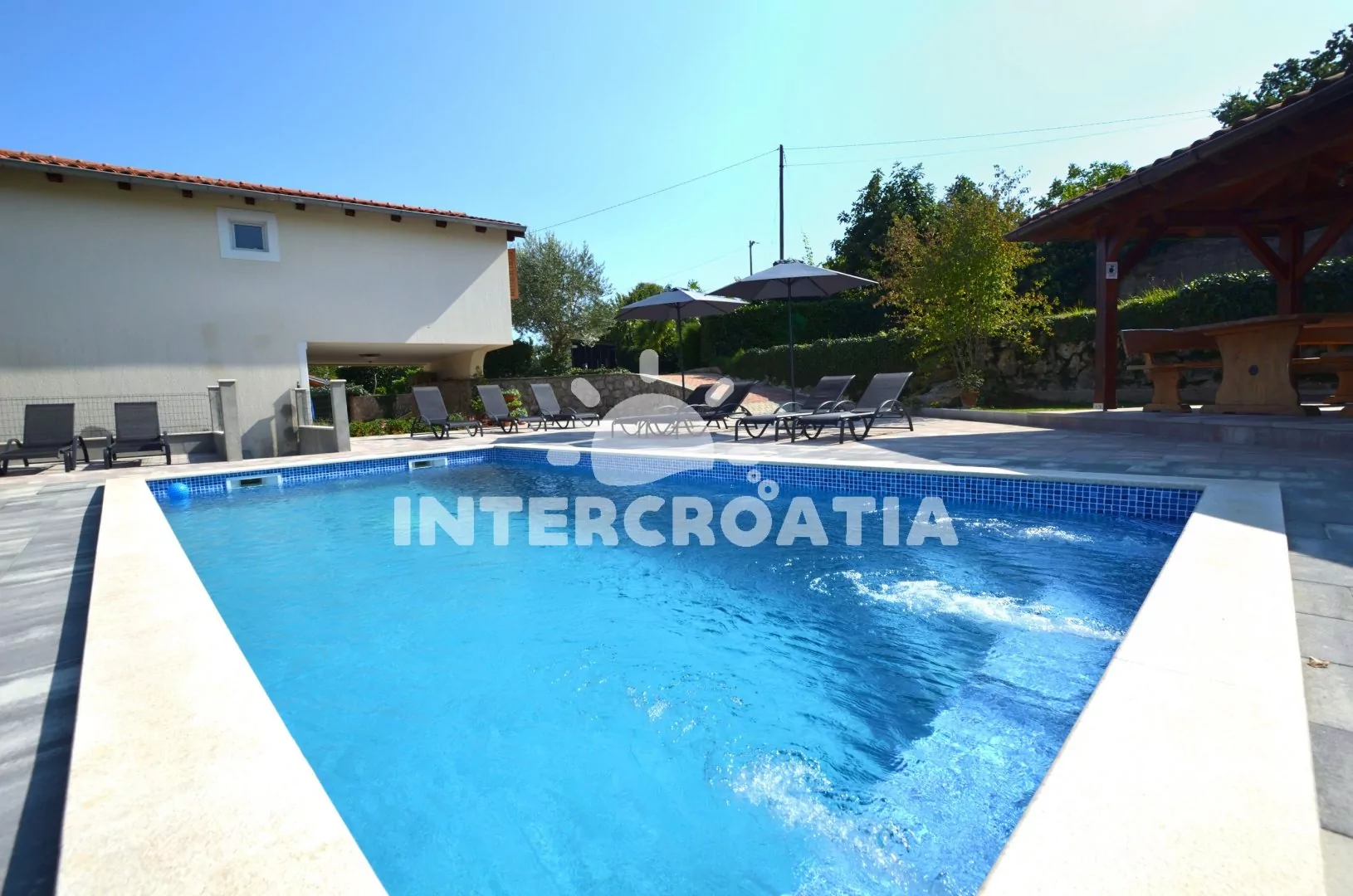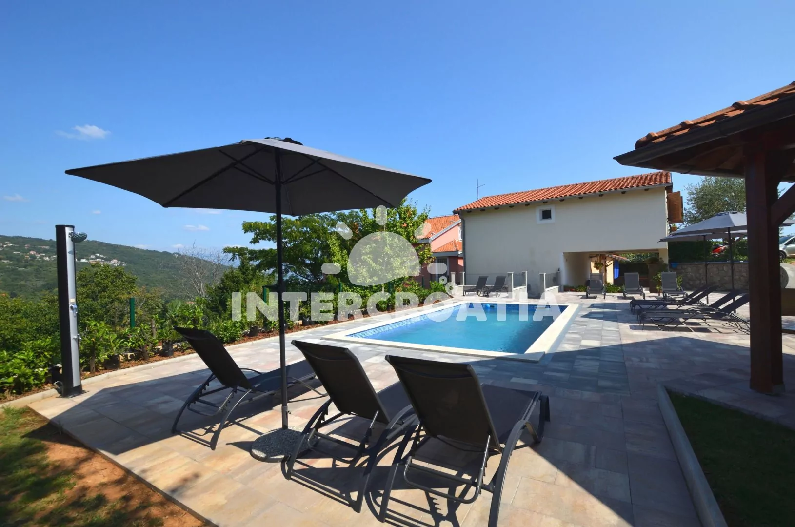 Vila s bazénem umístěná v klidném prostředí místní krajiny se nachází 3 km od moře a pláže. U vily společná pergola, terasa s posezením a grilem. U bazénu lehátka se slunečníky, zahradní sprcha a hezký výhled do krajiny. K dispozici je ubytování ve 2 klimatizovaných apartmánech s lodžiemi a venkovním posezením. Kolem vily oplocená zahrada, ovocný sad a vydlážděný vjezd s parkovacími místy pro automobily.