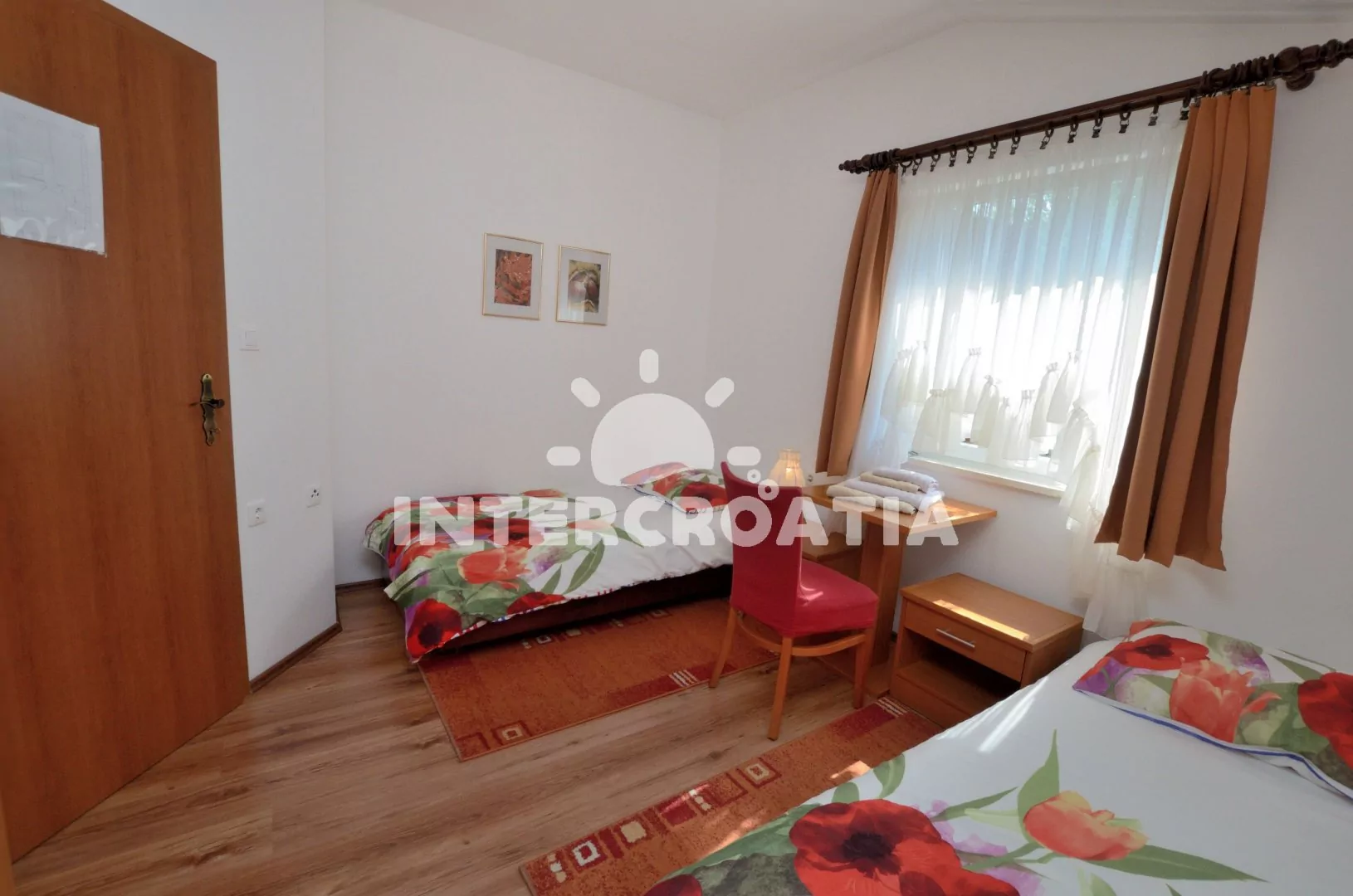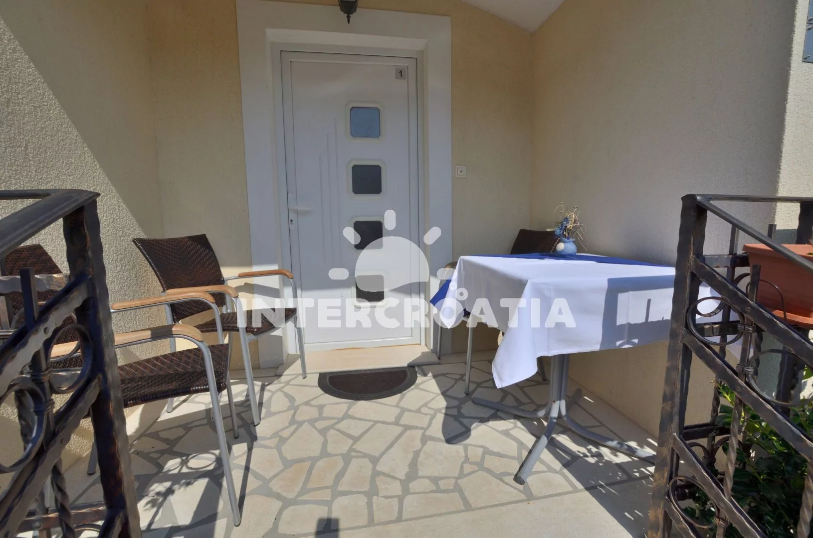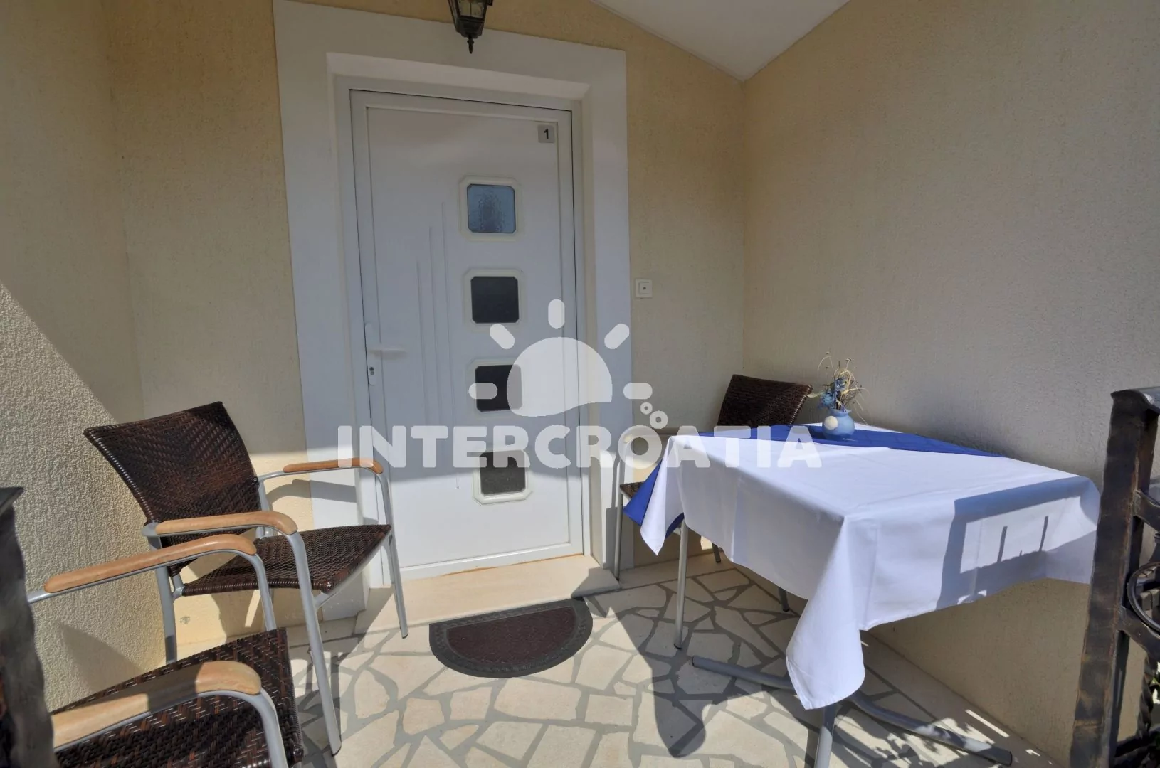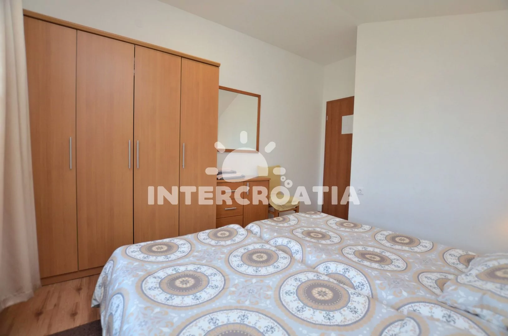 Apartmán (60 m2) s terasou, částečným výhledem na moře a dvora se nachází v přízemí vily. Apartmán má 2 ložnice a je vhodný pro 4 až 6 osob. Obývací pokoj je spojený s kuchyní. Kuchyňská linka je vybavena varnou deskou, digestoří, vestavěnou troubou, rychlovarnou konvicí, kávovarem, toustovačem, nádobím a lednicí s mrazákem. Obývací pokoj s jídelním stolem pro 4 osoby, pohovkou (rozložitelná na extra lůžko pro 2 osoby), televizí se satelitním programem a klimatizací. První ložnice s jedním dvoulůžkem. Druhá ložnice s dvěma jednolůžky. Koupelna se sprchovým koutem, umyvadlem, fénem, pračkou a wc. Hostům je k dispozici parkování u objektu zdarma.