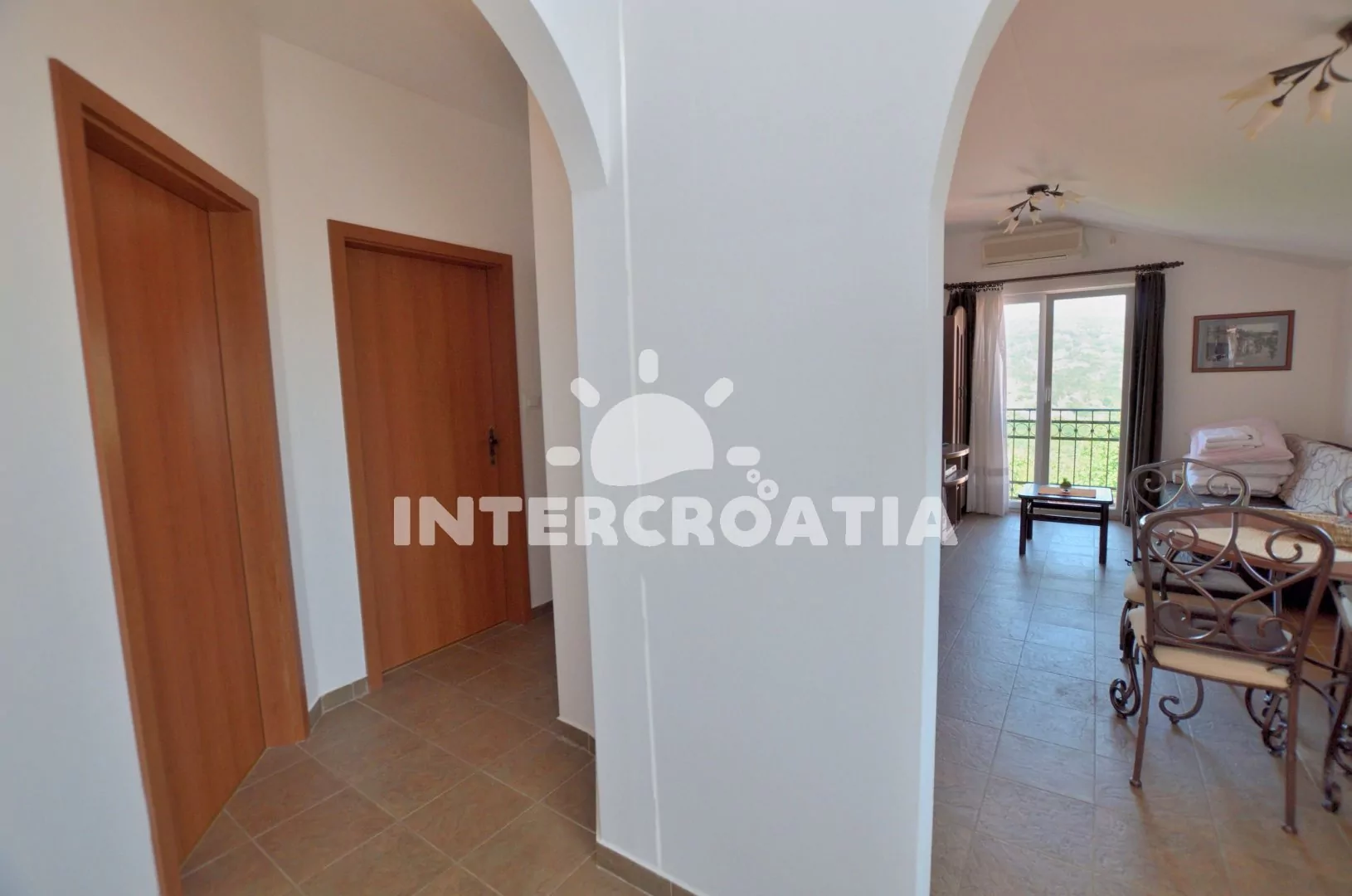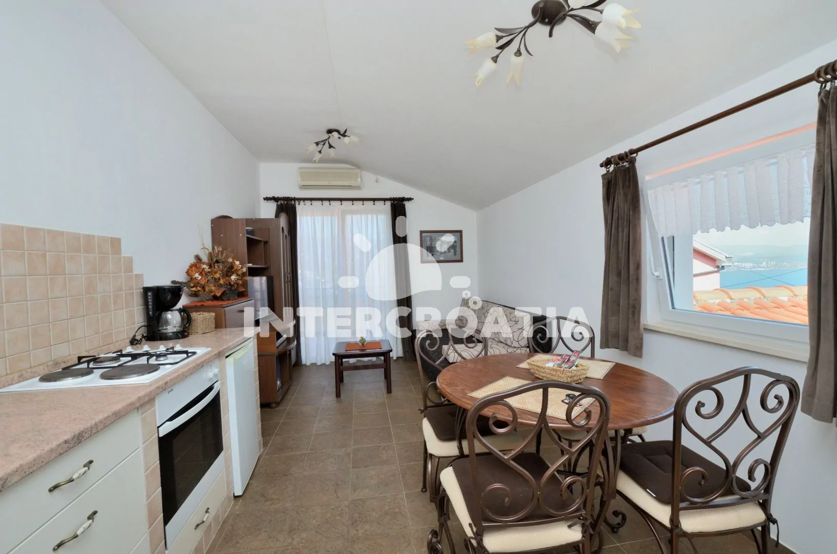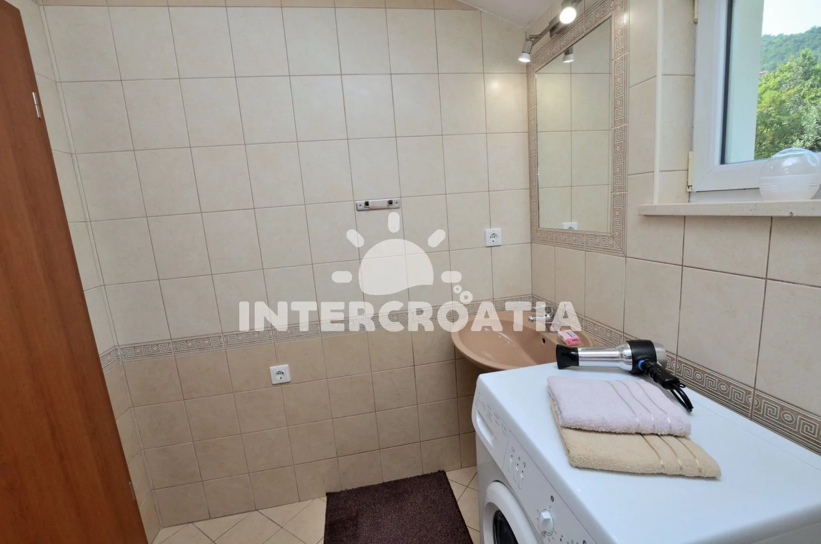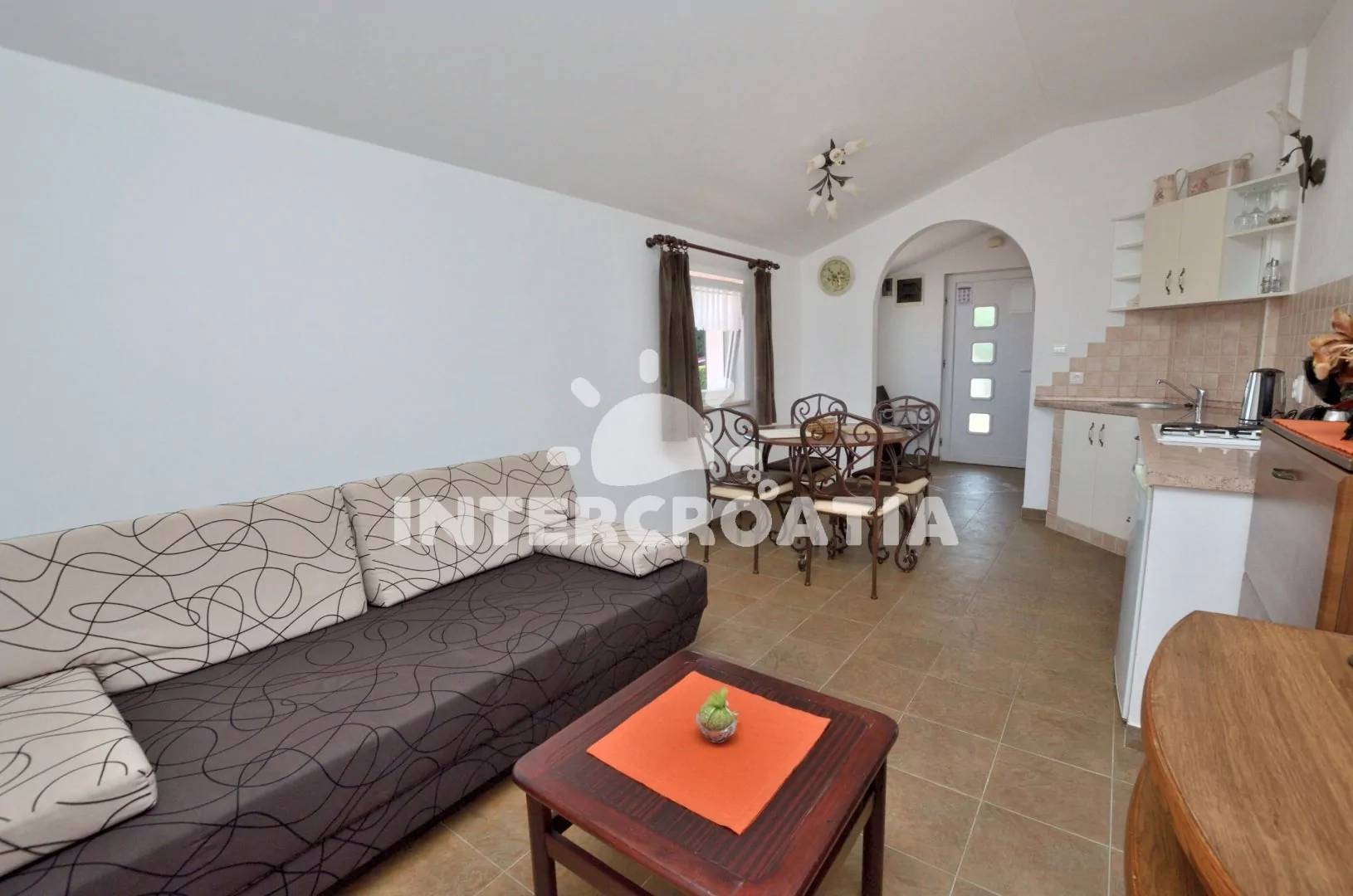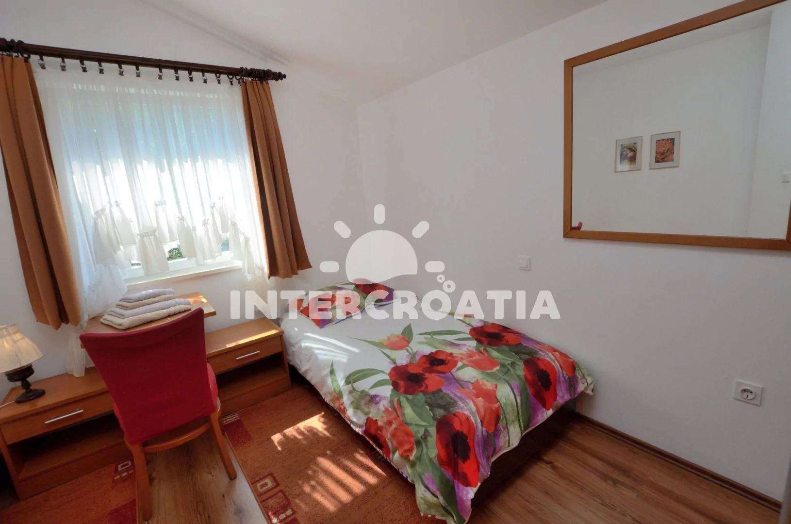 Apartmán (60 m2) s terasou, částečným výhledem na moře a dvora se nachází v přízemí vily. Apartmán má 2 ložnice a je vhodný pro 4 až 6 osob. Obývací pokoj je spojený s kuchyní. Kuchyňská linka je vybavena varnou deskou, digestoří, vestavěnou troubou, rychlovarnou konvicí, kávovarem, toustovačem, nádobím a lednicí s mrazákem. Obývací pokoj s jídelním stolem pro 4 osoby, pohovkou (rozložitelná na extra lůžko pro 2 osoby), televizí se satelitním programem a klimatizací. První ložnice s jedním dvoulůžkem. Druhá ložnice s dvěma jednolůžky. Koupelna se sprchovým koutem, umyvadlem, fénem, pračkou a wc. Hostům je k dispozici parkování u objektu zdarma.