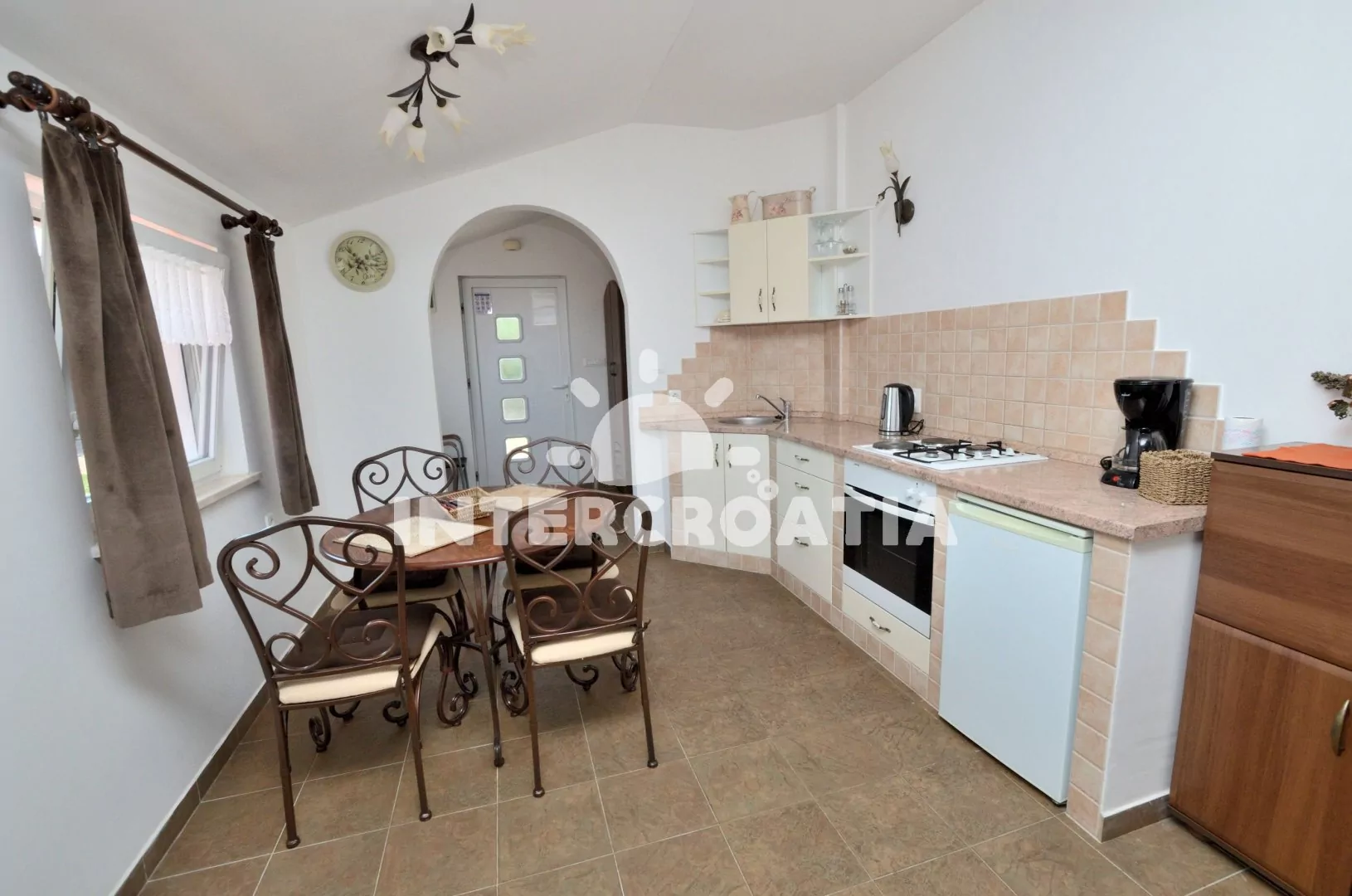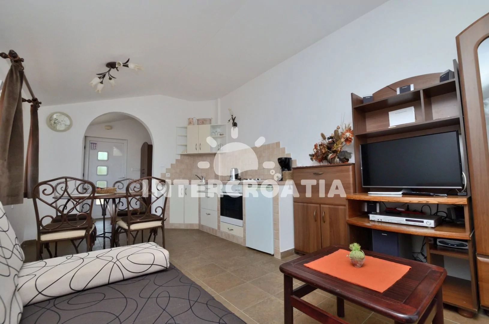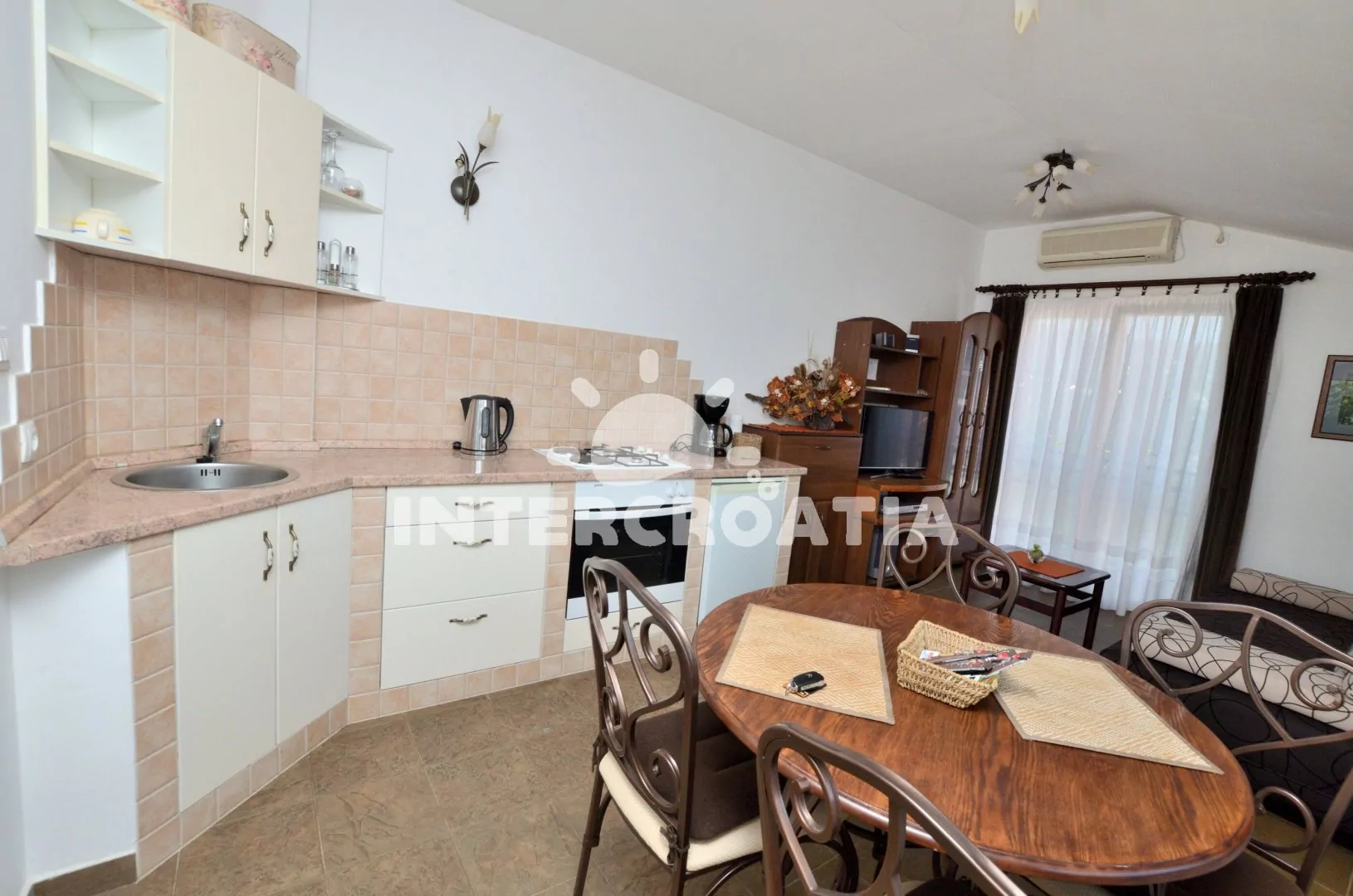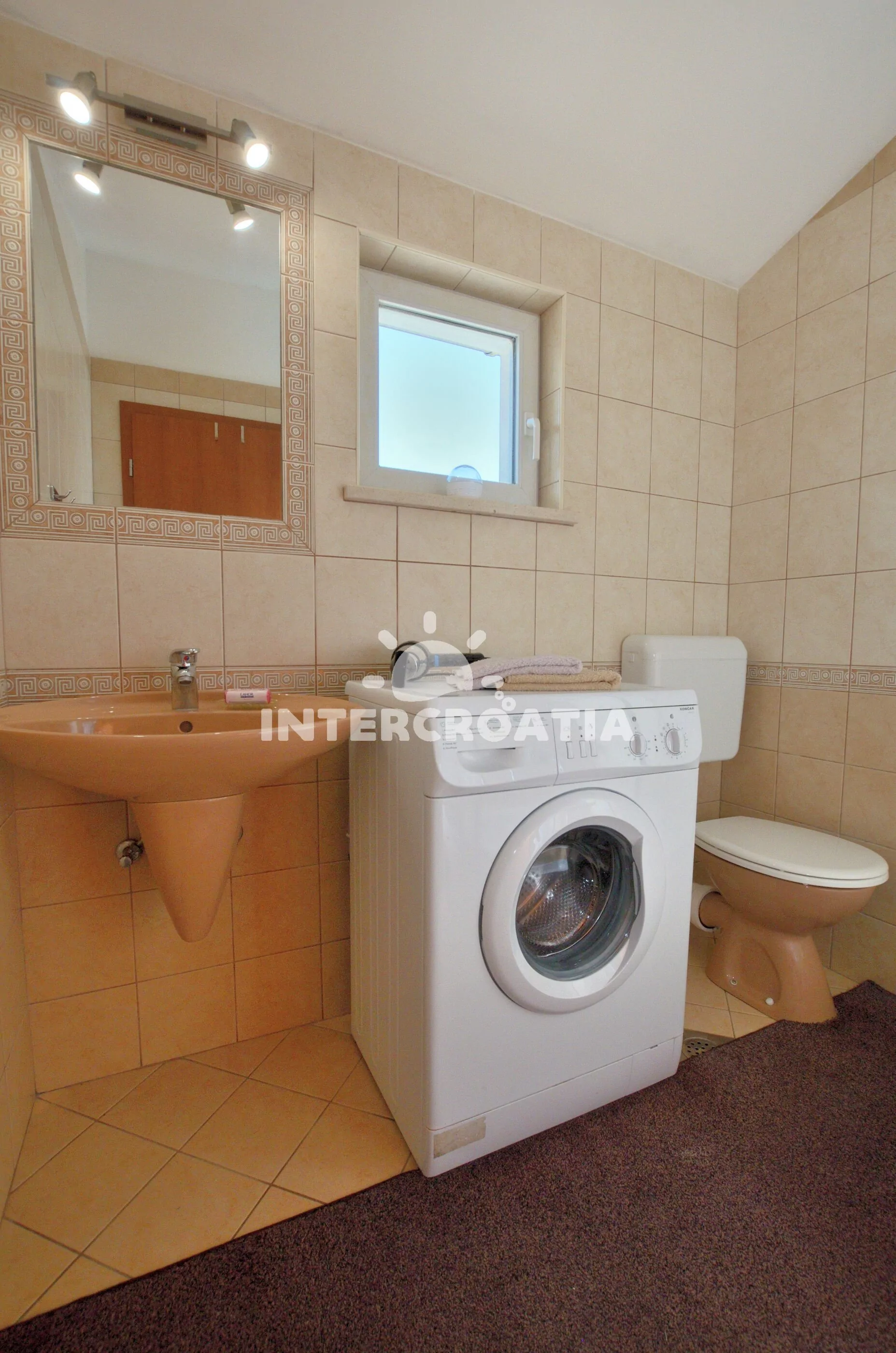 Apartmán (60 m2) s terasou, částečným výhledem na moře a dvora se nachází v přízemí vily. Apartmán má 2 ložnice a je vhodný pro 4 až 6 osob. Obývací pokoj je spojený s kuchyní. Kuchyňská linka je vybavena varnou deskou, digestoří, vestavěnou troubou, rychlovarnou konvicí, kávovarem, toustovačem, nádobím a lednicí s mrazákem. Obývací pokoj s jídelním stolem pro 4 osoby, pohovkou (rozložitelná na extra lůžko pro 2 osoby), televizí se satelitním programem a klimatizací. První ložnice s jedním dvoulůžkem. Druhá ložnice s dvěma jednolůžky. Koupelna se sprchovým koutem, umyvadlem, fénem, pračkou a wc. Hostům je k dispozici parkování u objektu zdarma.