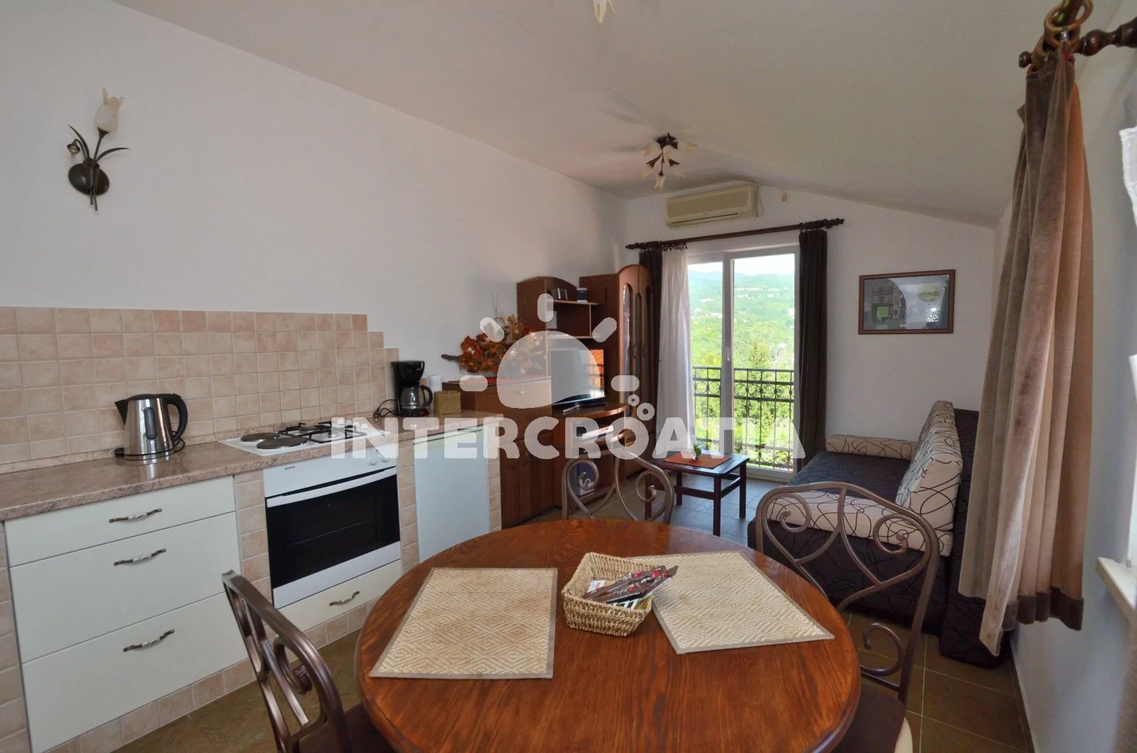Lovran se nachází v Istrii, 5 km od města Opatija. Apartmánová vila má překrásný výhled na moře a krajinu. Vzdálenost k moři a oblázkové pláži je 3 km.
