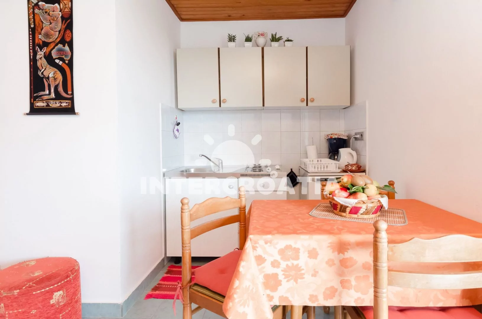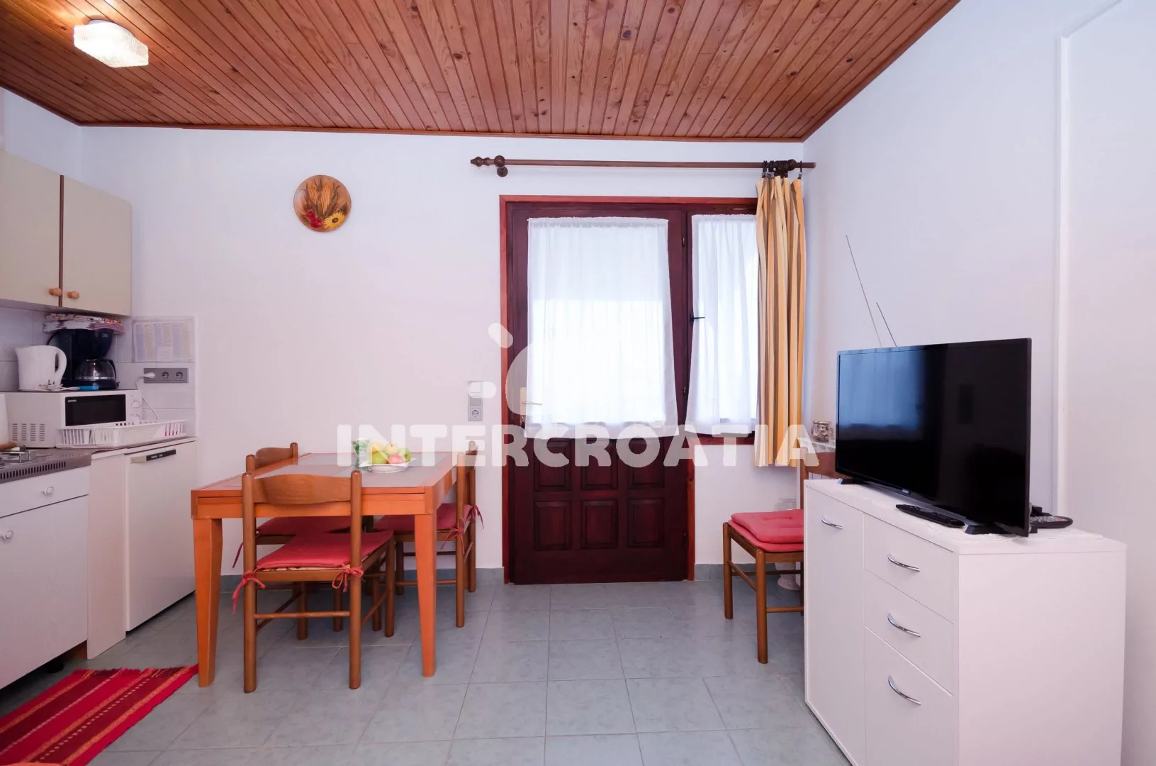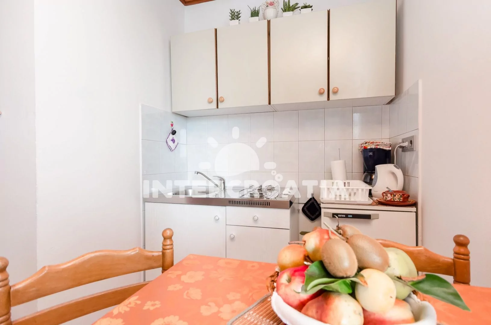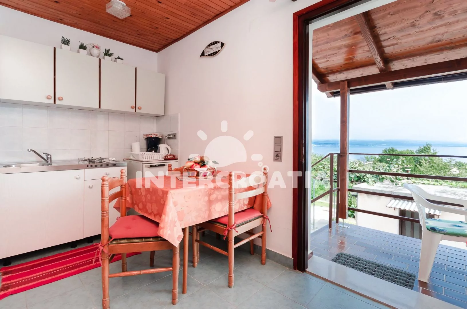 Apartmán (20 m2) s terasou, posezením a výhledem na moře se nachází v 1. patře domu. Apartmán má 1 ložnici a je vhodný pro 2 až 3 osoby. Obývací pokoj je spojený s kuchyní. Kuchyňská linka je vybavena dvouplotýnkovým vařičem, rychlovarnou konvicí, kávovarem, nádobím a lednicí s mrazákem. Obývací pokoj s jídelním stolem, pohovkou (rozložitelná na extra lůžko pro 1 osobu), televizí, klimatizací a vstupem na terasu. Ložnice s dvoulůžkem. Koupelna se sprchovým koutem, umyvadlem, fénem a wc. Hostům je k dispozici parkování u objektu zdarma.