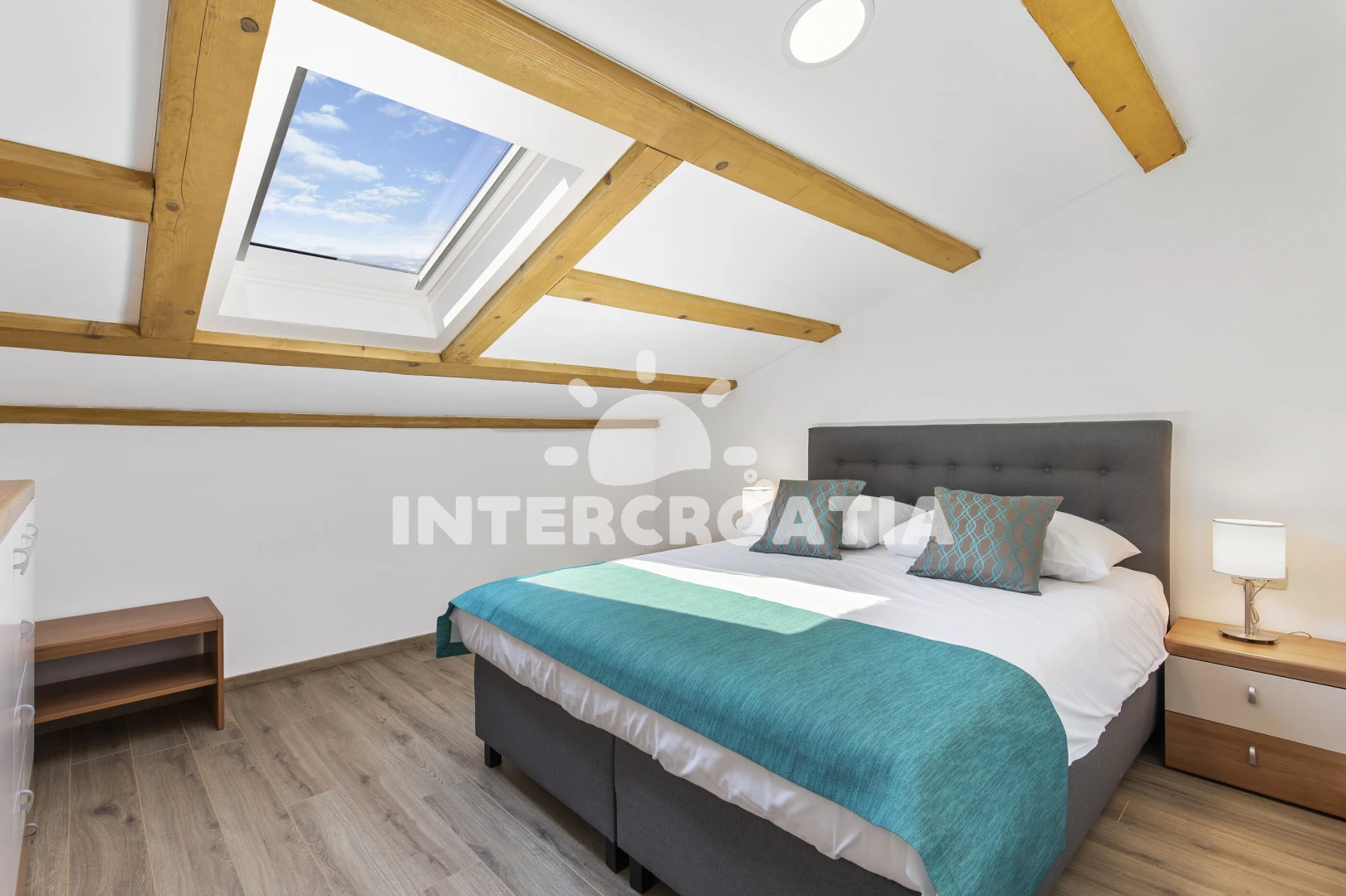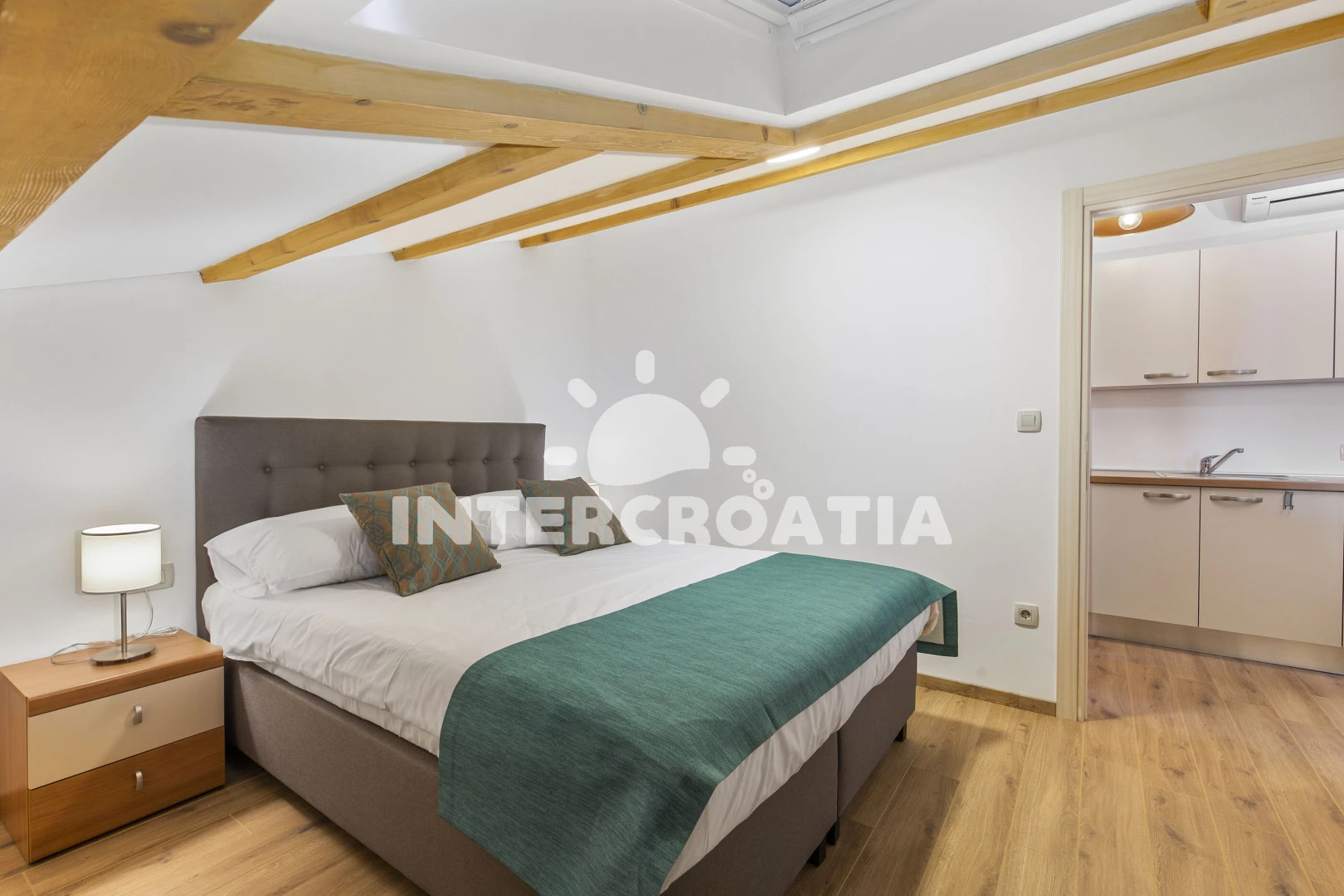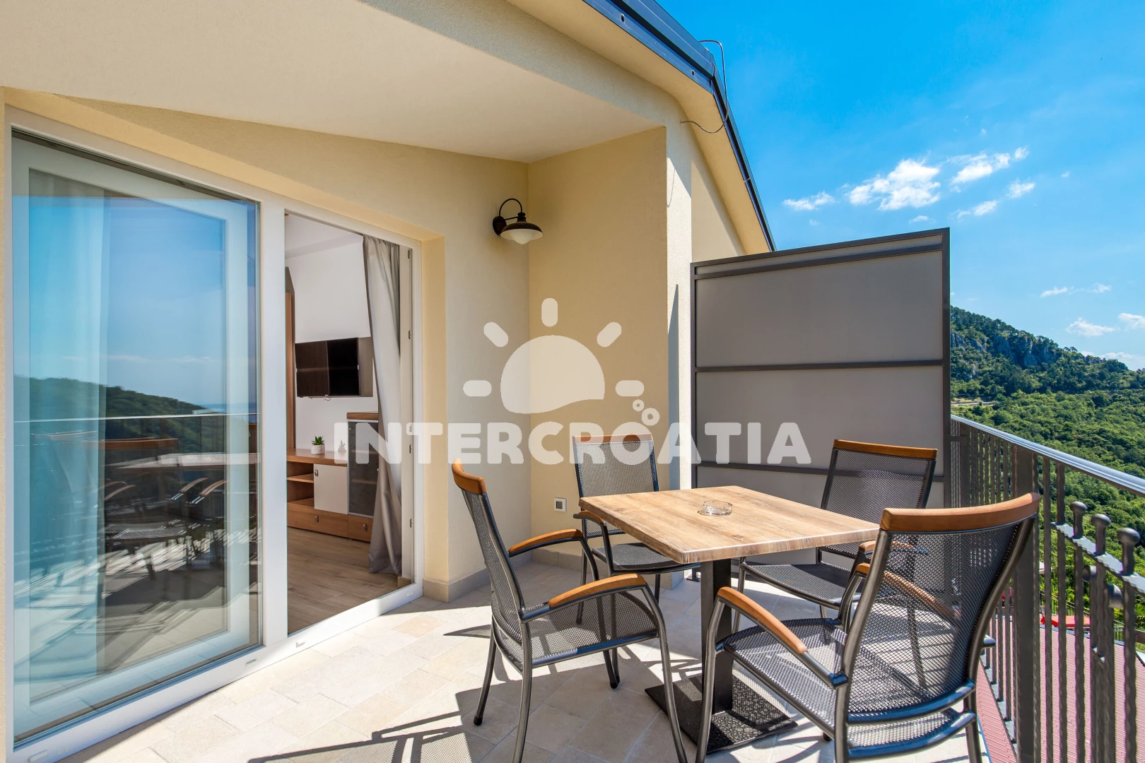 Apartmán (43 m2) s balkonem, a výhledem na moře. Nachází se v podkroví objektu. Apartmán má 1 ložnici a je vhodný pro až 4 osoby. Kuchyňská linka je vybavena varnou deskou, kávovarem, mikrovlnnou troubou, nádobím, lednicí, mrazákem. V obývací místnosti je rozložitelná pohovka (extra lůžko pro 2 osoby). K dispozici televize. Ložnice s dvoulůžkem. Koupelna se sprchovým koutem, umyvadlem, WC.