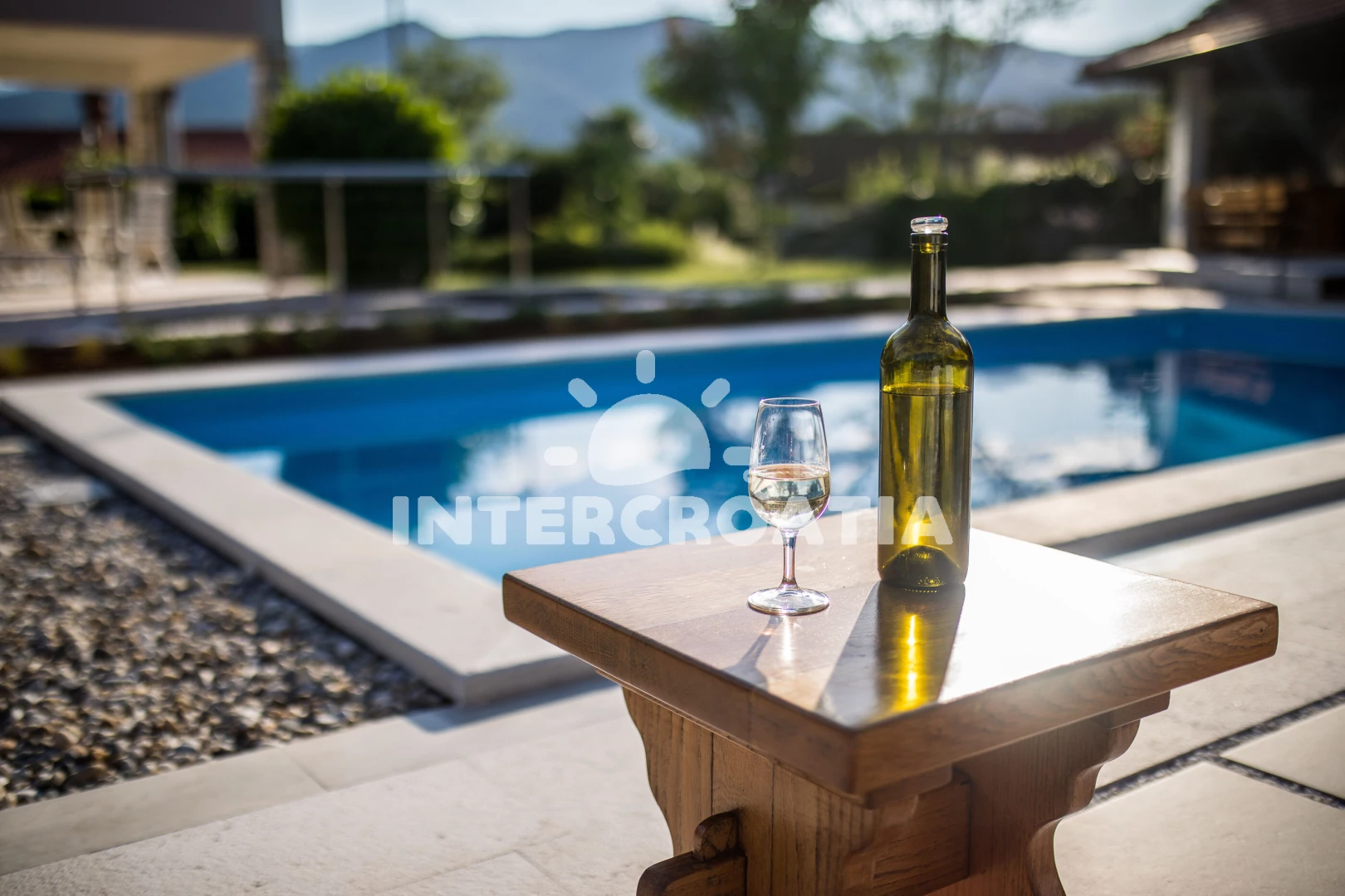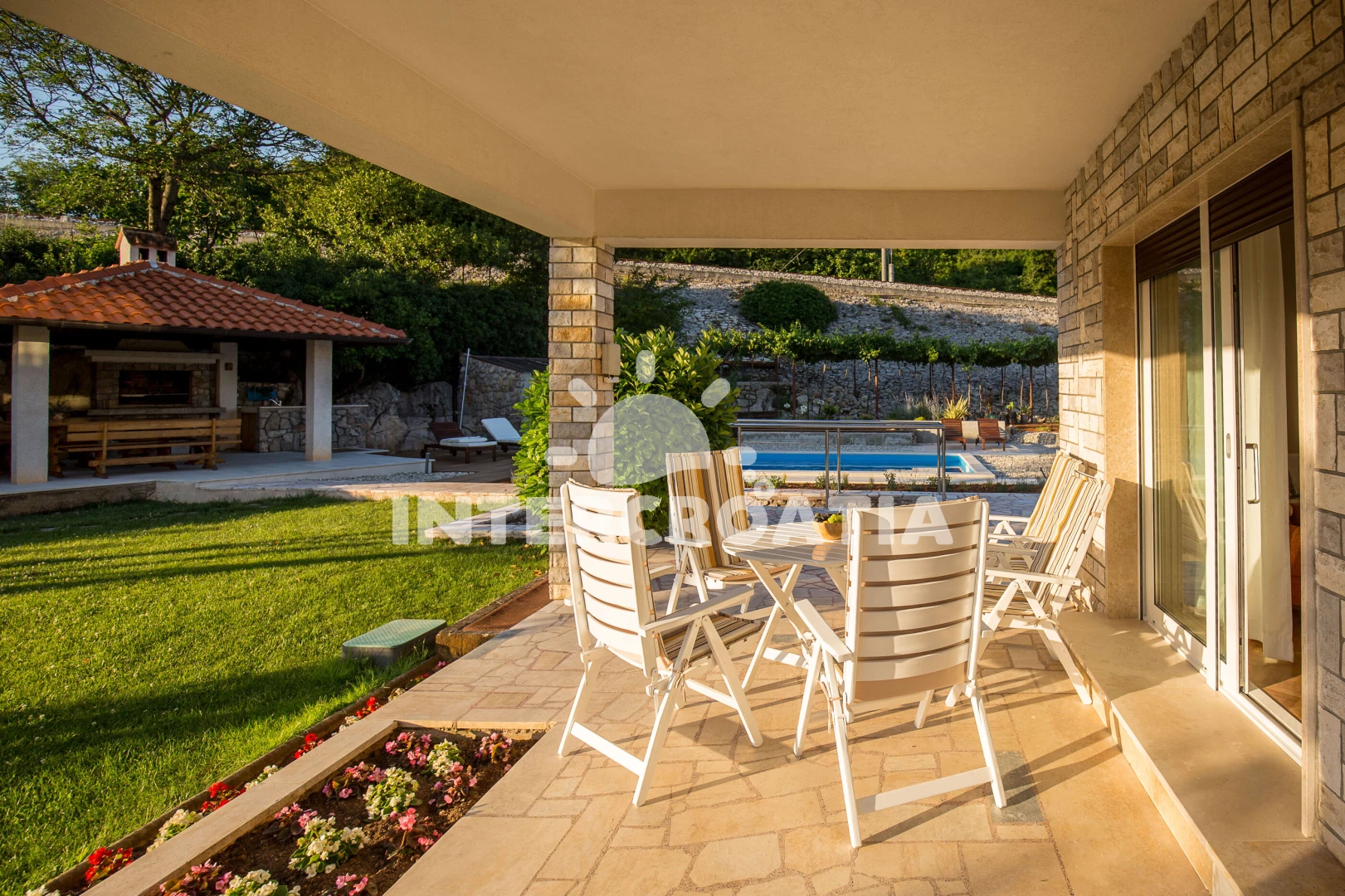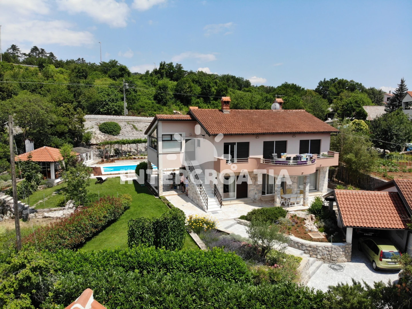 Apartmán se nachází 2000 m od moře a pláže. Pláž je oblázková a betonové desky. Apartmán disponuje bazénem s lehátky pro ubytované hosty. U objektu je k dispozici společná zahrada s posezením a grilem. Parkování je před domem.