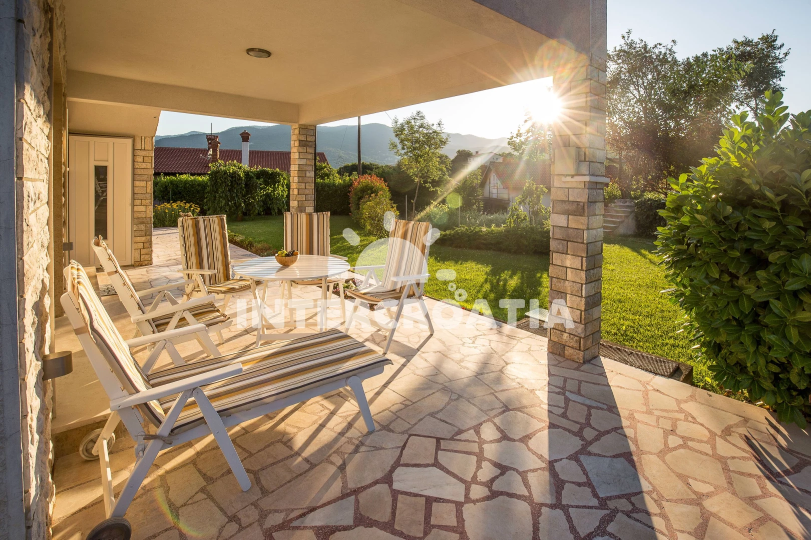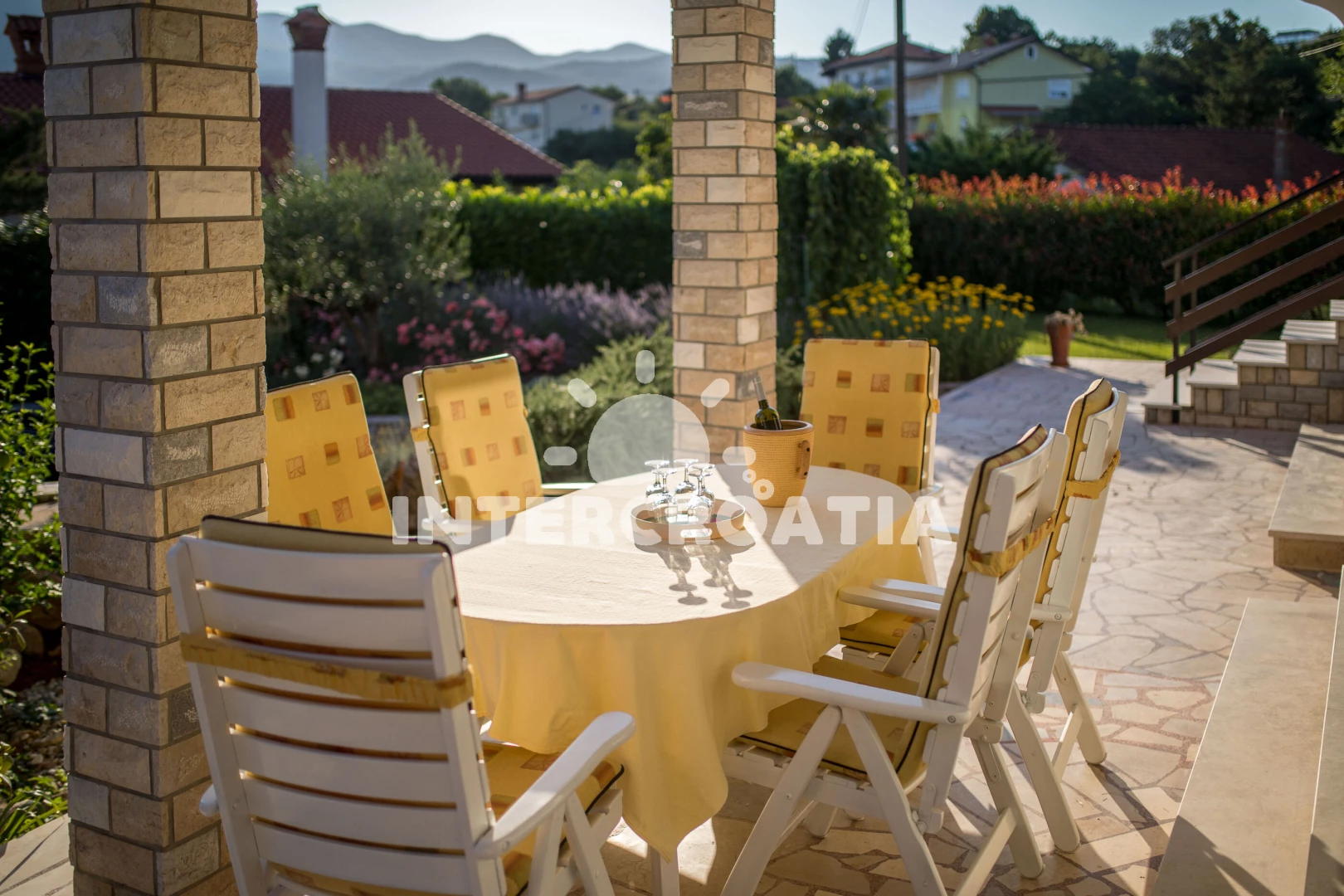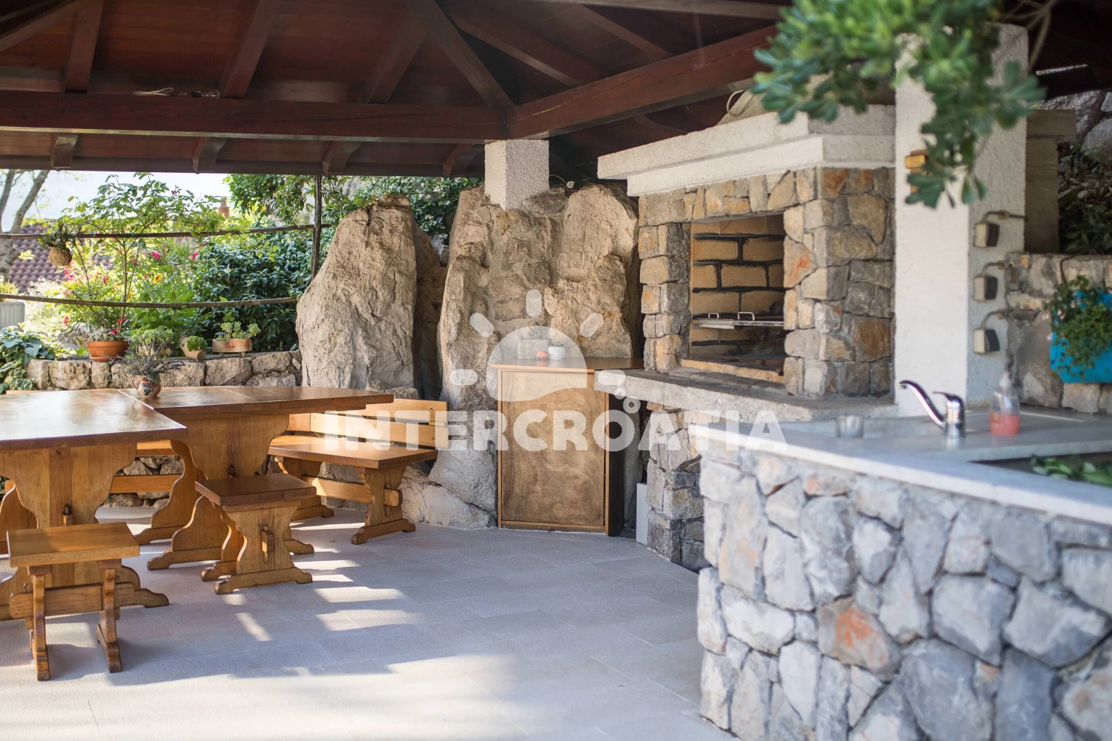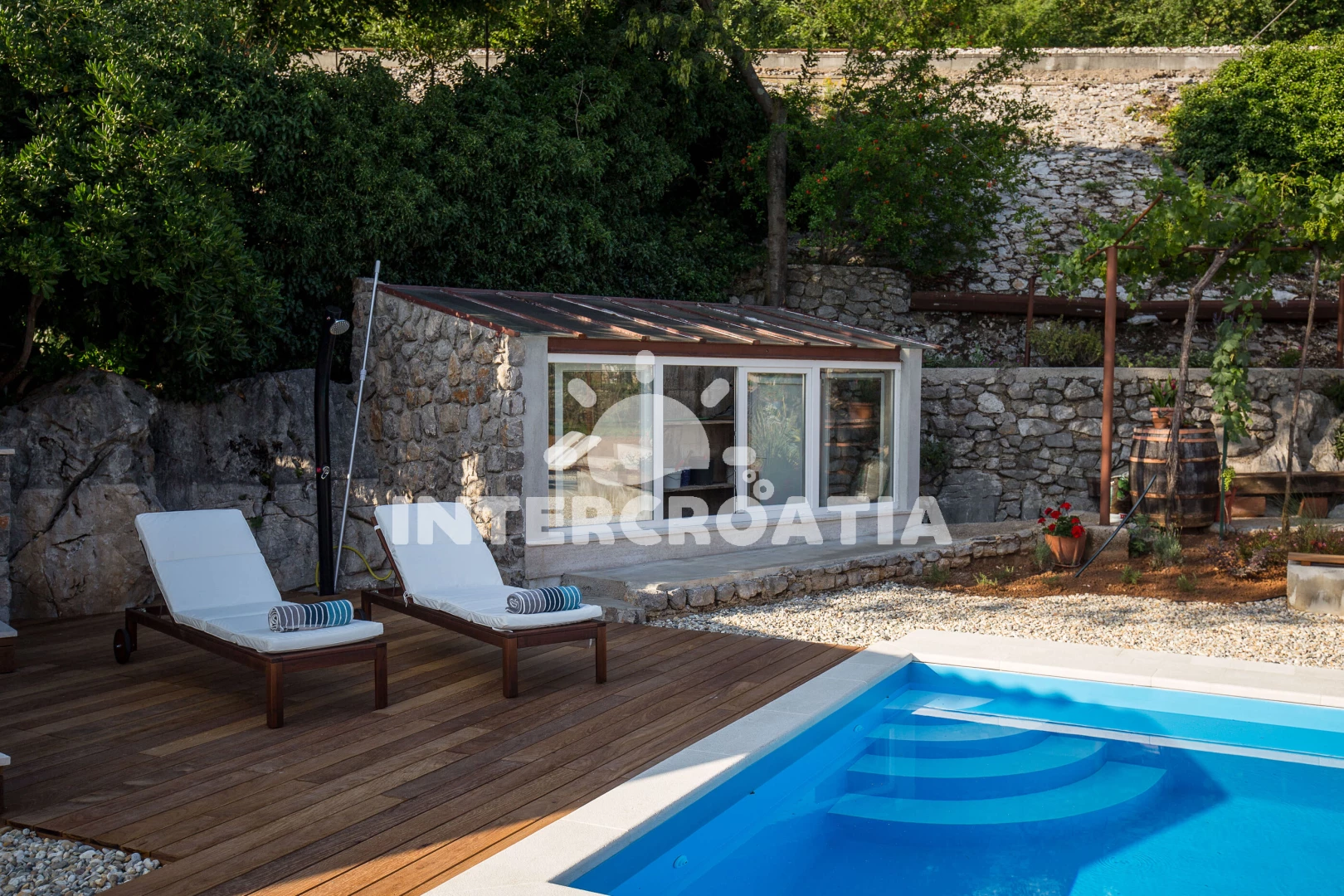 Apartmán se nachází 2000 m od moře a pláže. Pláž je oblázková a betonové desky. Apartmán disponuje bazénem s lehátky pro ubytované hosty. U objektu je k dispozici společná zahrada s posezením a grilem. Parkování je před domem.