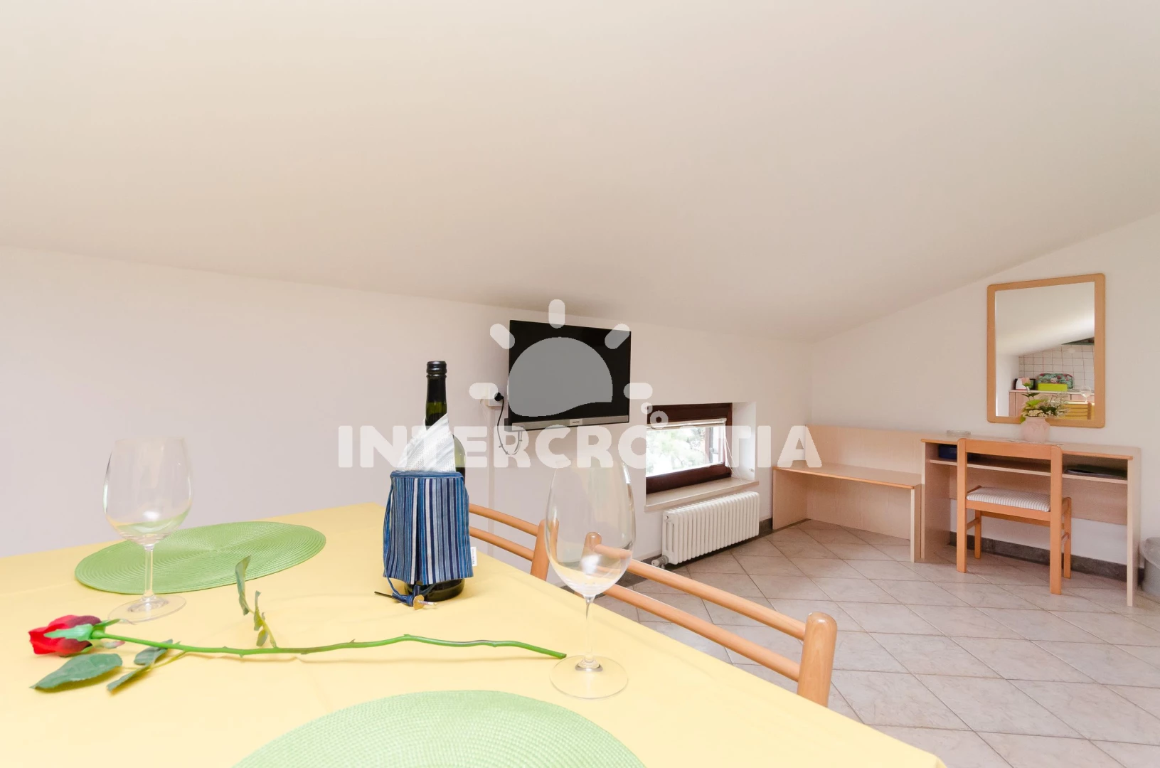 Apartmán (35 m2) typu studio s výhledem na moře. Nachází se ve 2. patře objektu. Kuchyňská linka je vybavena varnou deskou, kávovarem, toustovačem, mikrovlnnou troubou, rychlovarnou konvicí, nádobím, lednicí, mrazákem. K dispozici dvoulůžko, televize se satelitním programem, žehlička. Koupelna se sprchovým koutem, umyvadlem, fénem a WC.