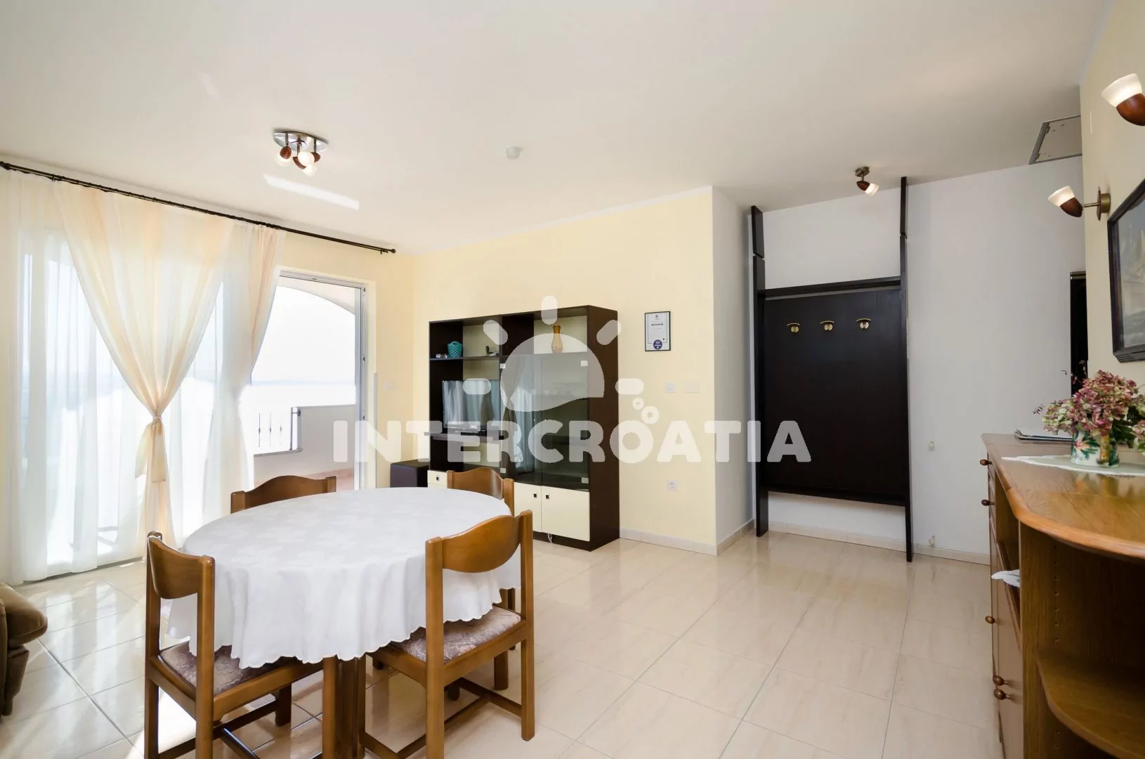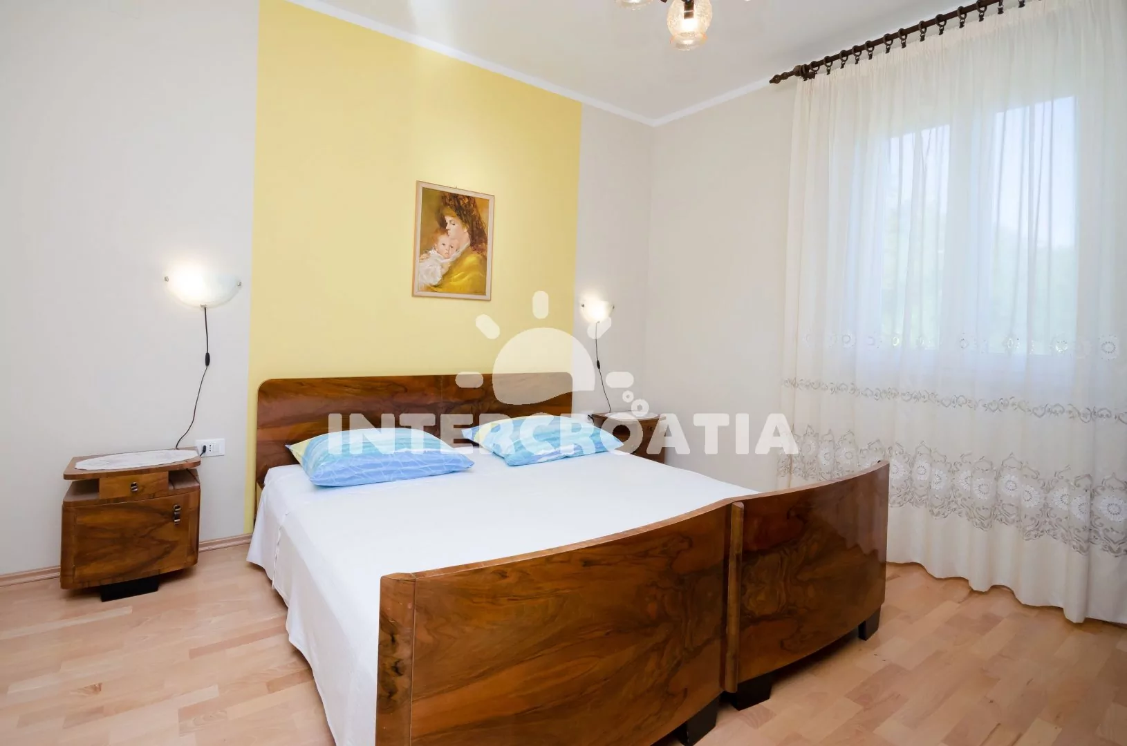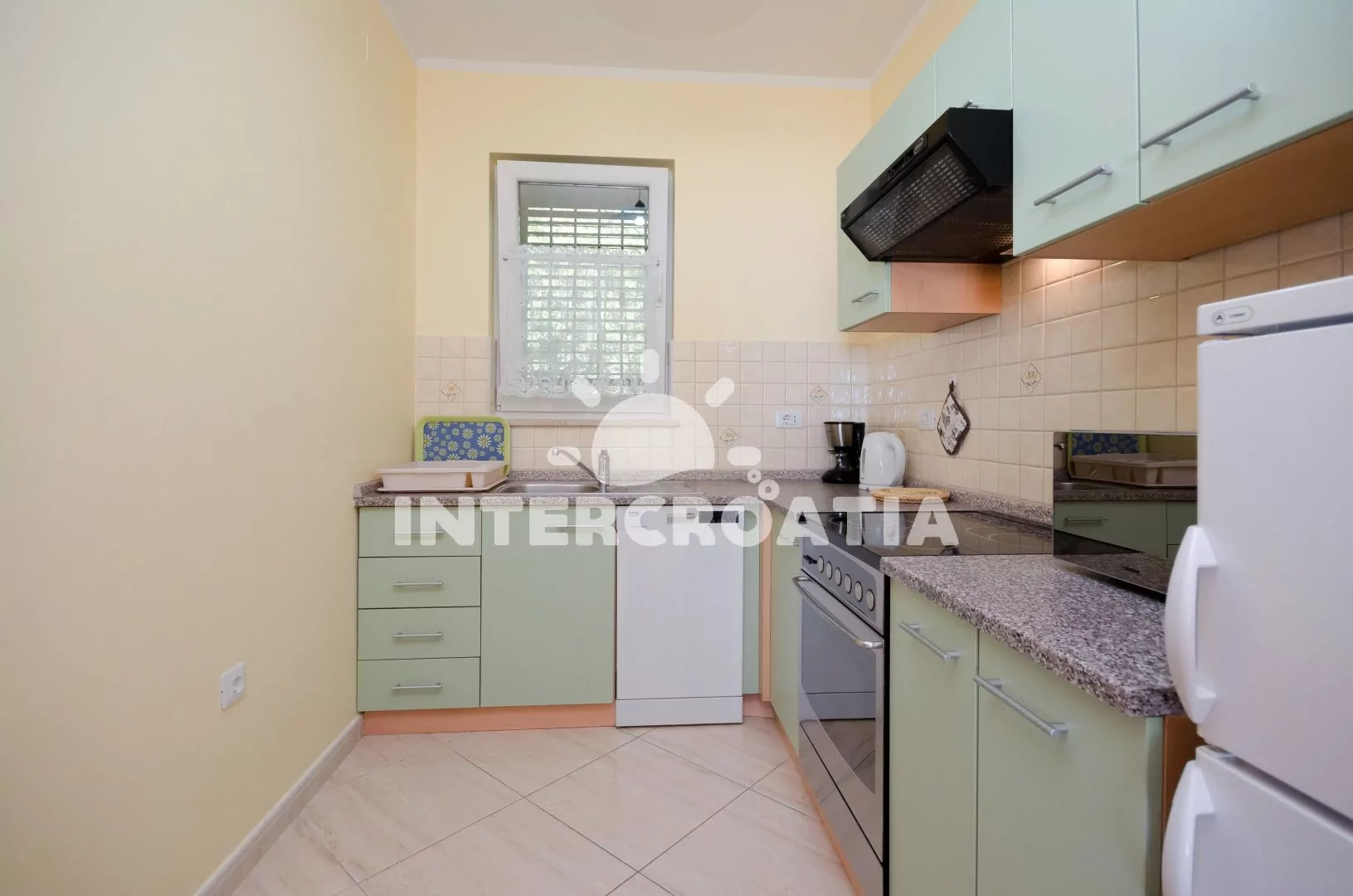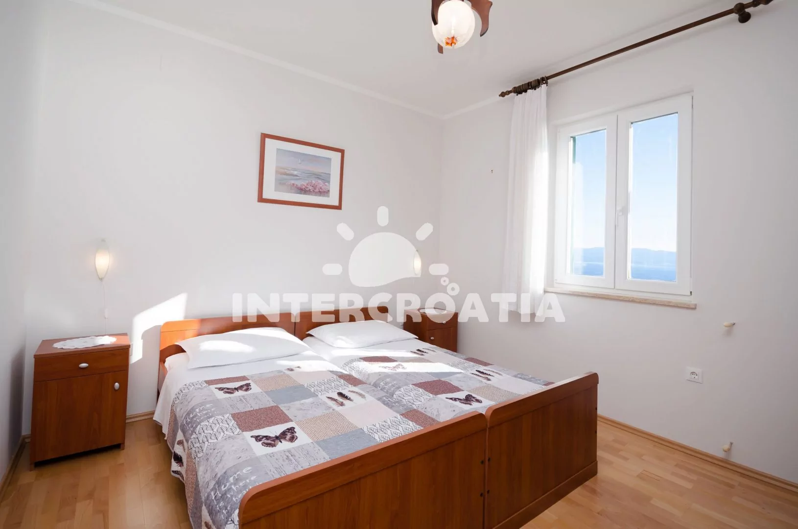 Prostorný apartmán pro 4 osoby v prvním patře domu s výhledem na moře. Kuchyň je vybavena pracovní deskou, nádobím, sklokeramickou varnou deskou, digestoří, vestavěnou troubou, kávovarem, myčkou na nádobí, mikrovlnnou troubou, rychlovarnou konvicí, toustovačem a lednicí s mrazákem. Obývací pokoj s jídelním stolem, televizí se satelitním programem, pohovkou a vstupem na zastřešenou terasu. První i druhá ložnice je vybavena jedním manželským dvoulůžkem. Koupelna se sprchovým koutem, umyvadlem, pračkou, bidetem a wc. K dispozici: WiFi, klimatizace, radio, lodžie s posezením, dětská postýlka (pouze po předcházející dohodě s agenturou), žehlička a fén (služba na požádání).