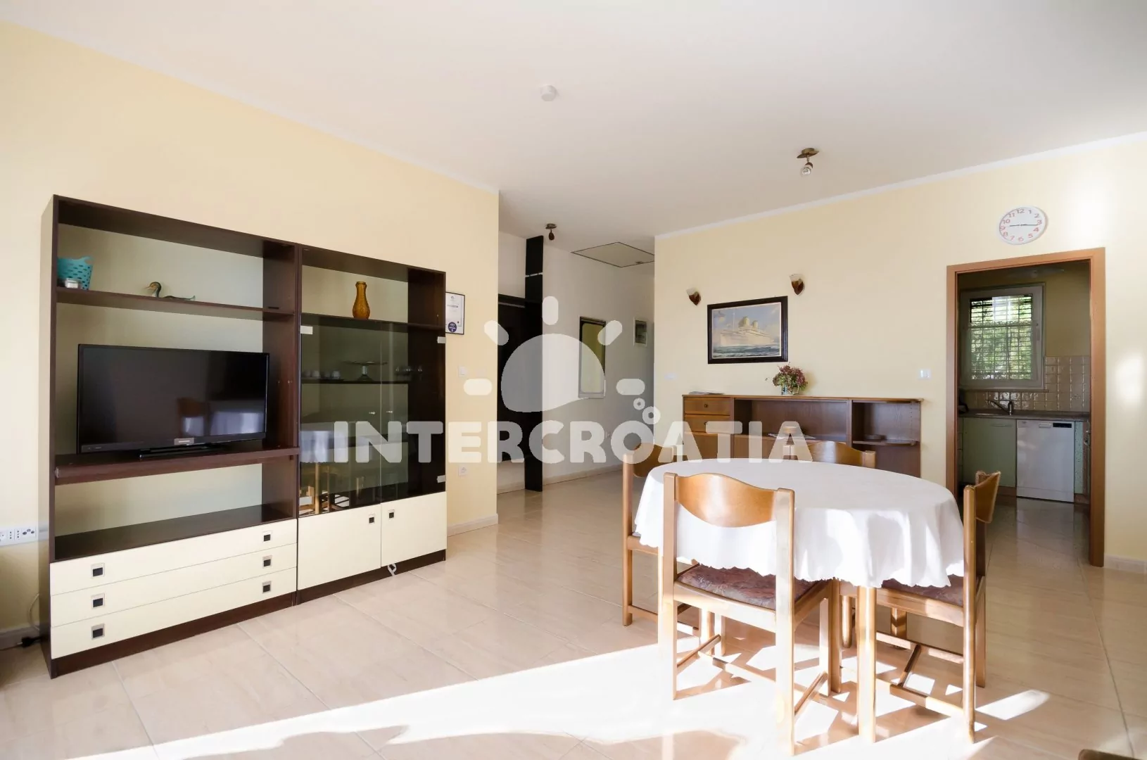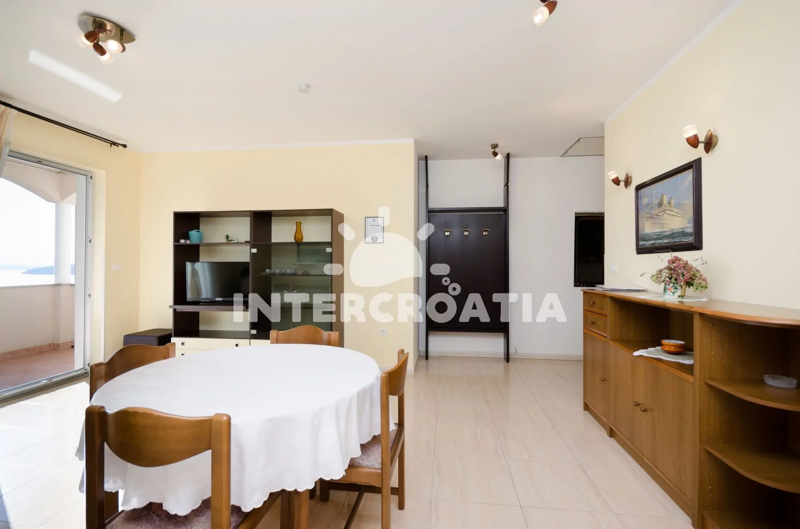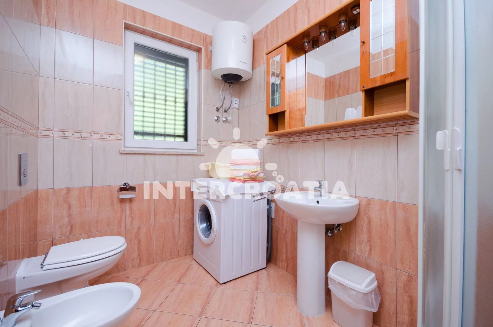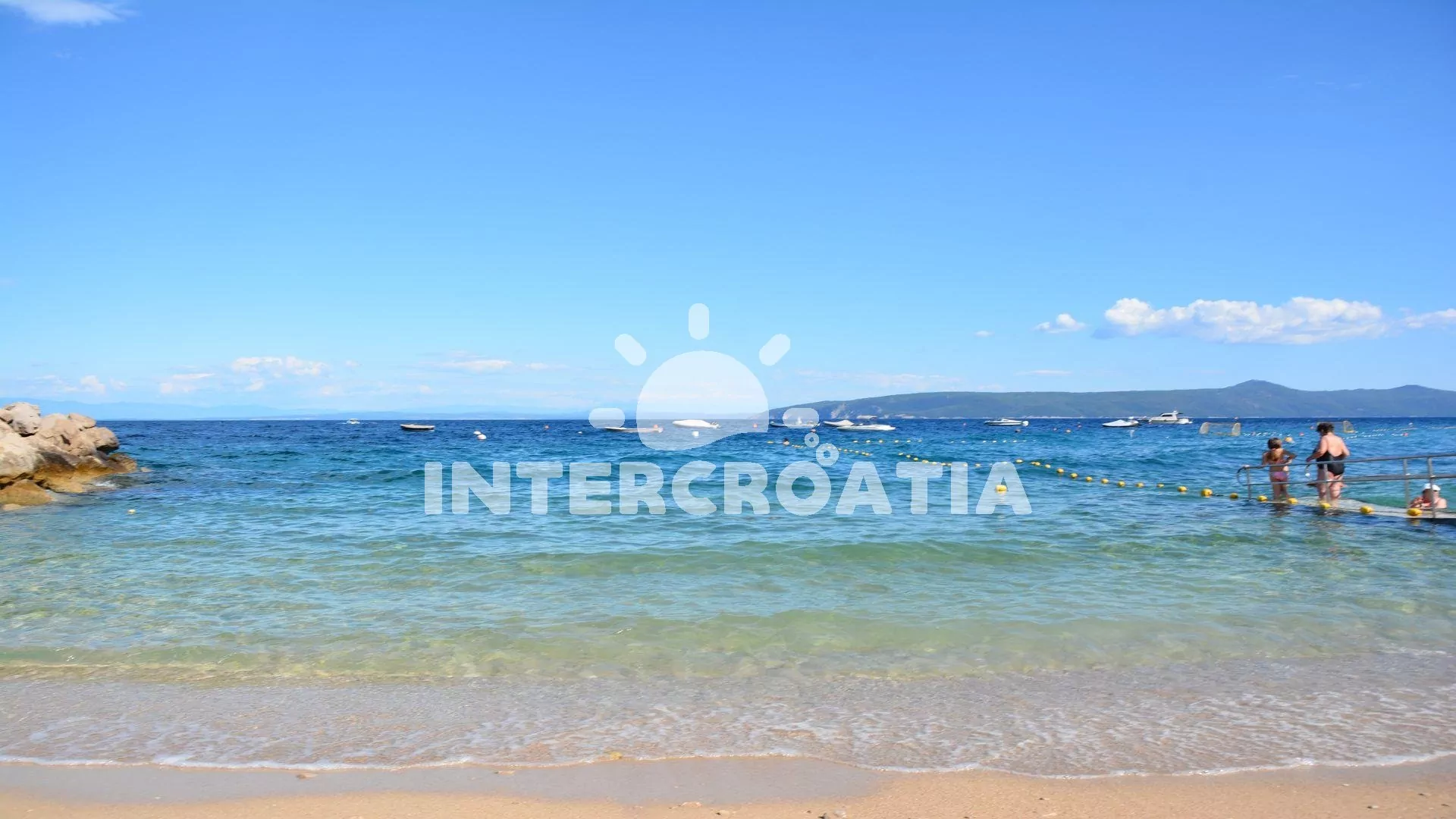 Prostorný apartmán pro 4 osoby v prvním patře domu s výhledem na moře. Kuchyň je vybavena pracovní deskou, nádobím, sklokeramickou varnou deskou, digestoří, vestavěnou troubou, kávovarem, myčkou na nádobí, mikrovlnnou troubou, rychlovarnou konvicí, toustovačem a lednicí s mrazákem. Obývací pokoj s jídelním stolem, televizí se satelitním programem, pohovkou a vstupem na zastřešenou terasu. První i druhá ložnice je vybavena jedním manželským dvoulůžkem. Koupelna se sprchovým koutem, umyvadlem, pračkou, bidetem a wc. K dispozici: WiFi, klimatizace, radio, lodžie s posezením, dětská postýlka (pouze po předcházející dohodě s agenturou), žehlička a fén (služba na požádání).