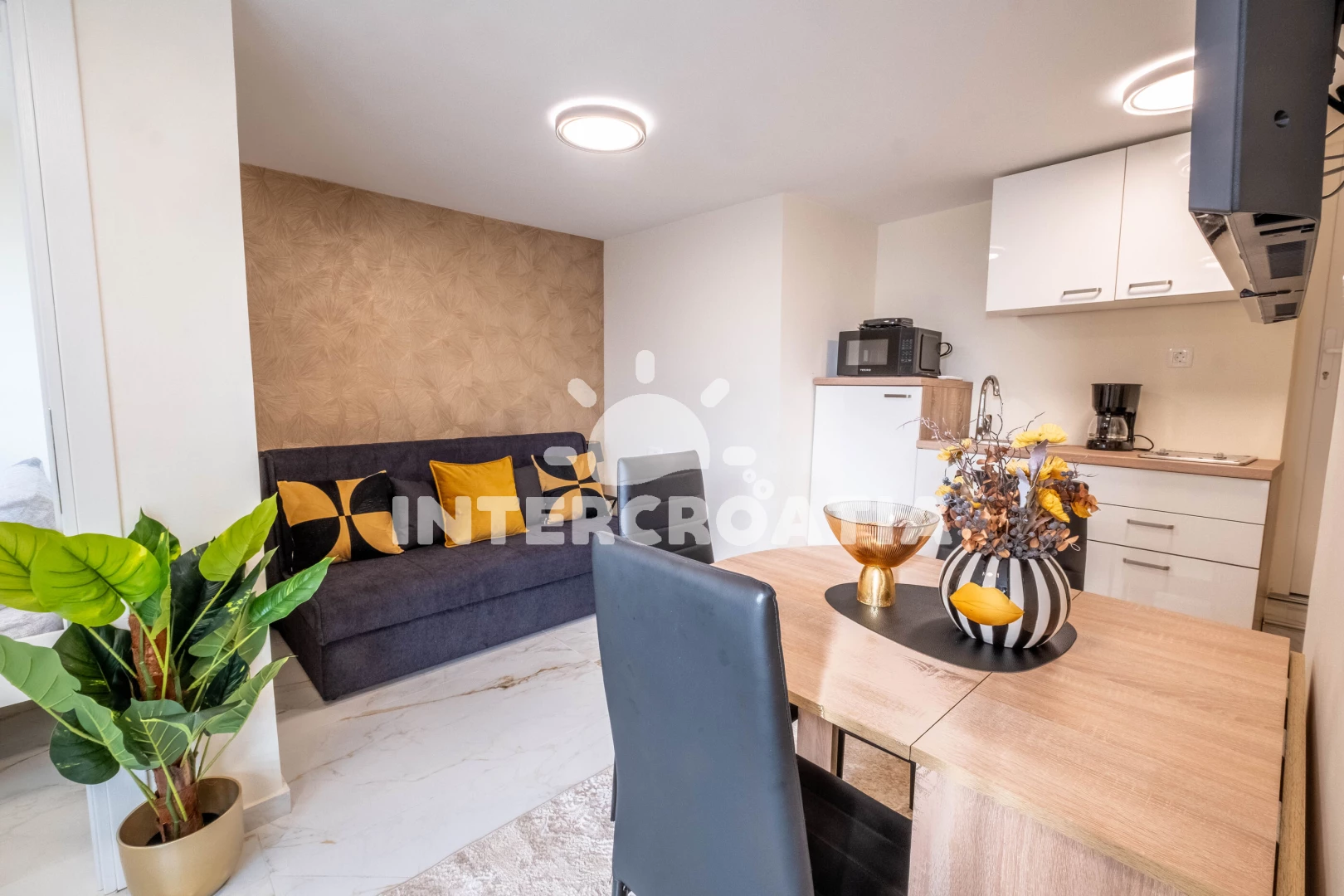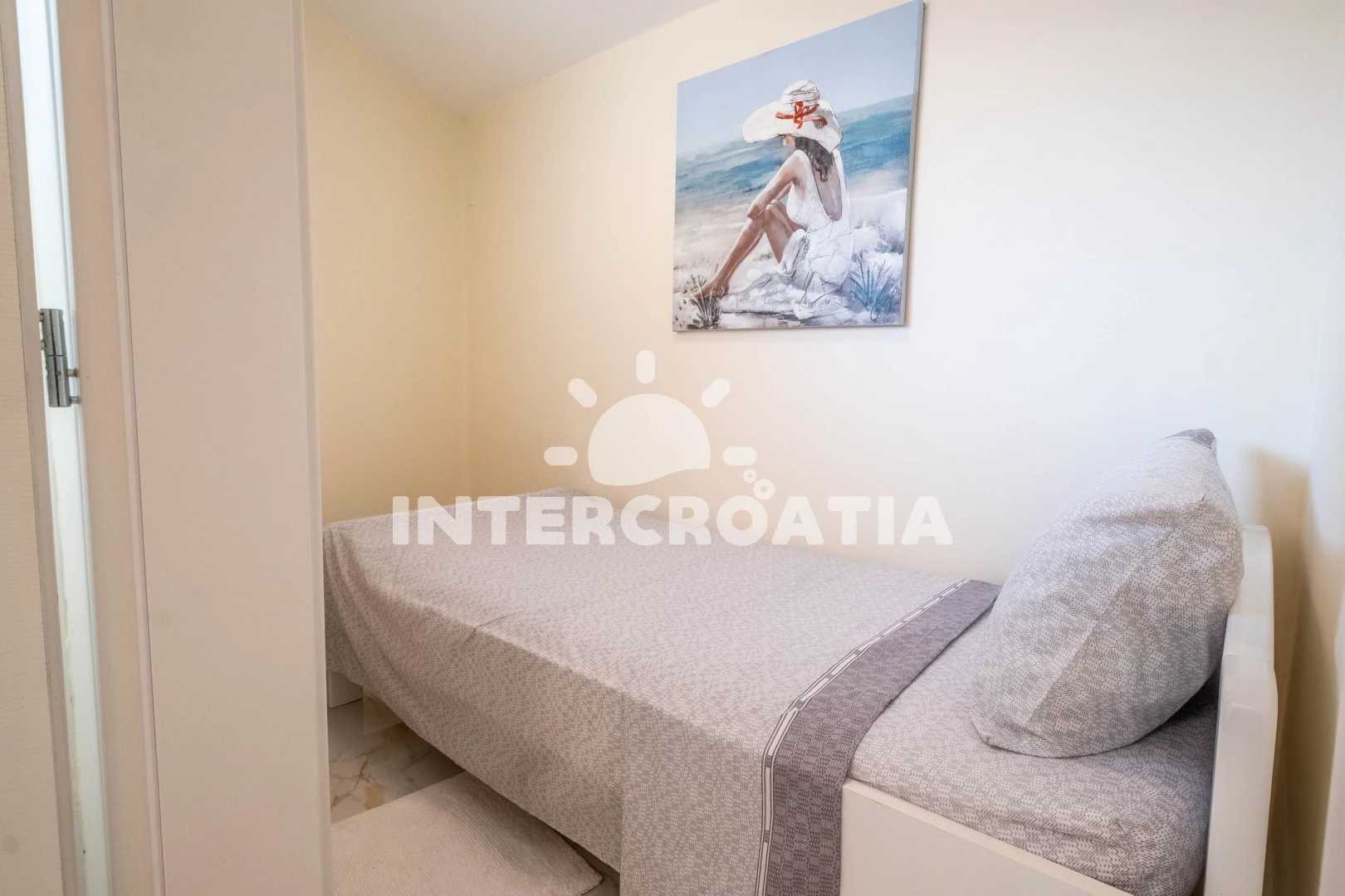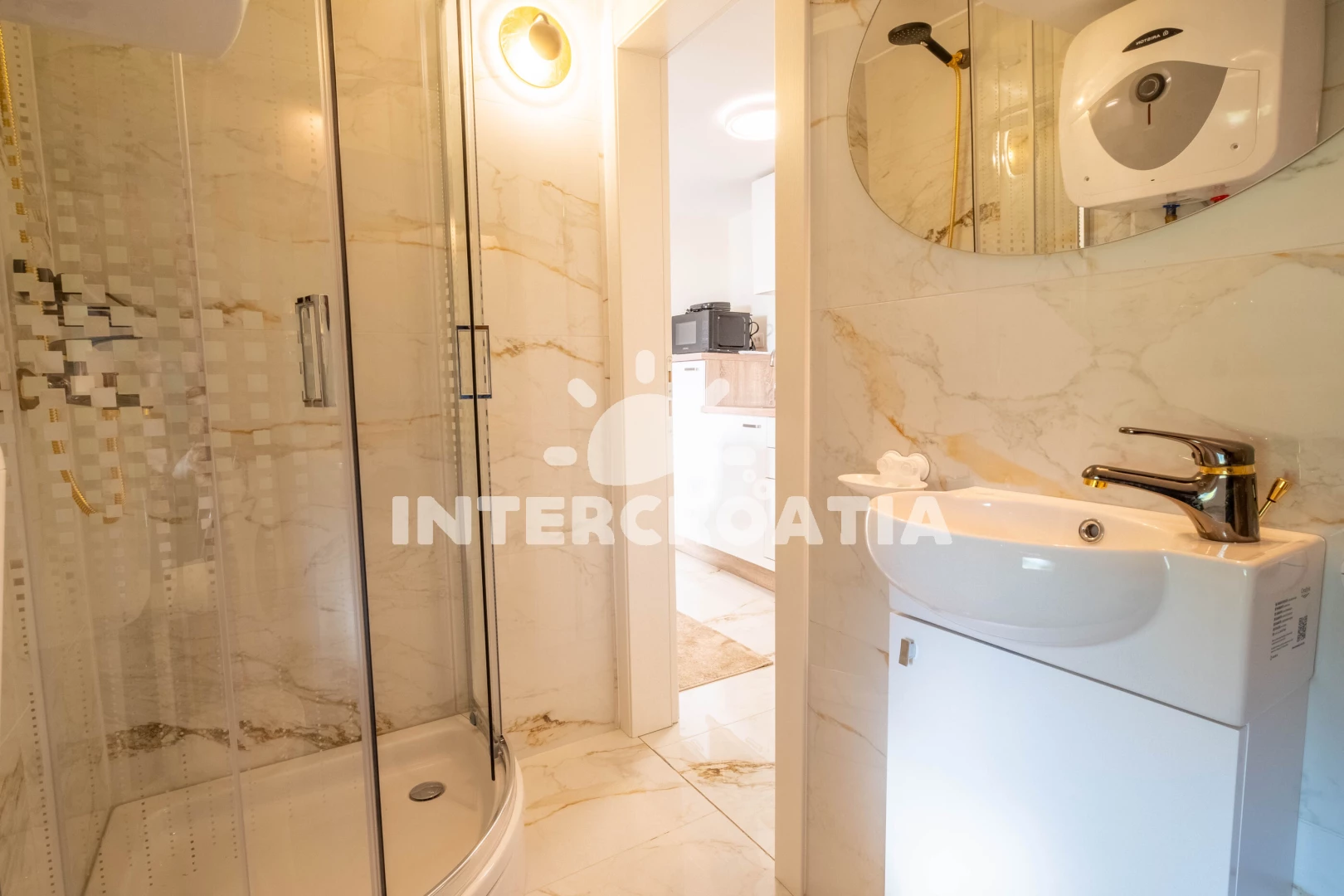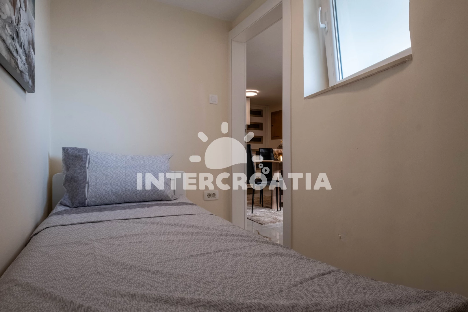 Vzdálenosti: Moře 800 m, pláž 800 m (písčitá, skalnatá, oblázková, větší kamení a betonové desky), centrum 150 m, supermarket 150 m, směnárna 150 m, banka 150 m, bar 150 m, restaurace 150 m, lékárna 200 m, veřejná doprava 350 m, čerpací stanice 350 m, pošta 350 m, marina 600 m, ambulance 800 m, letiště (Rijeka) 35 km,