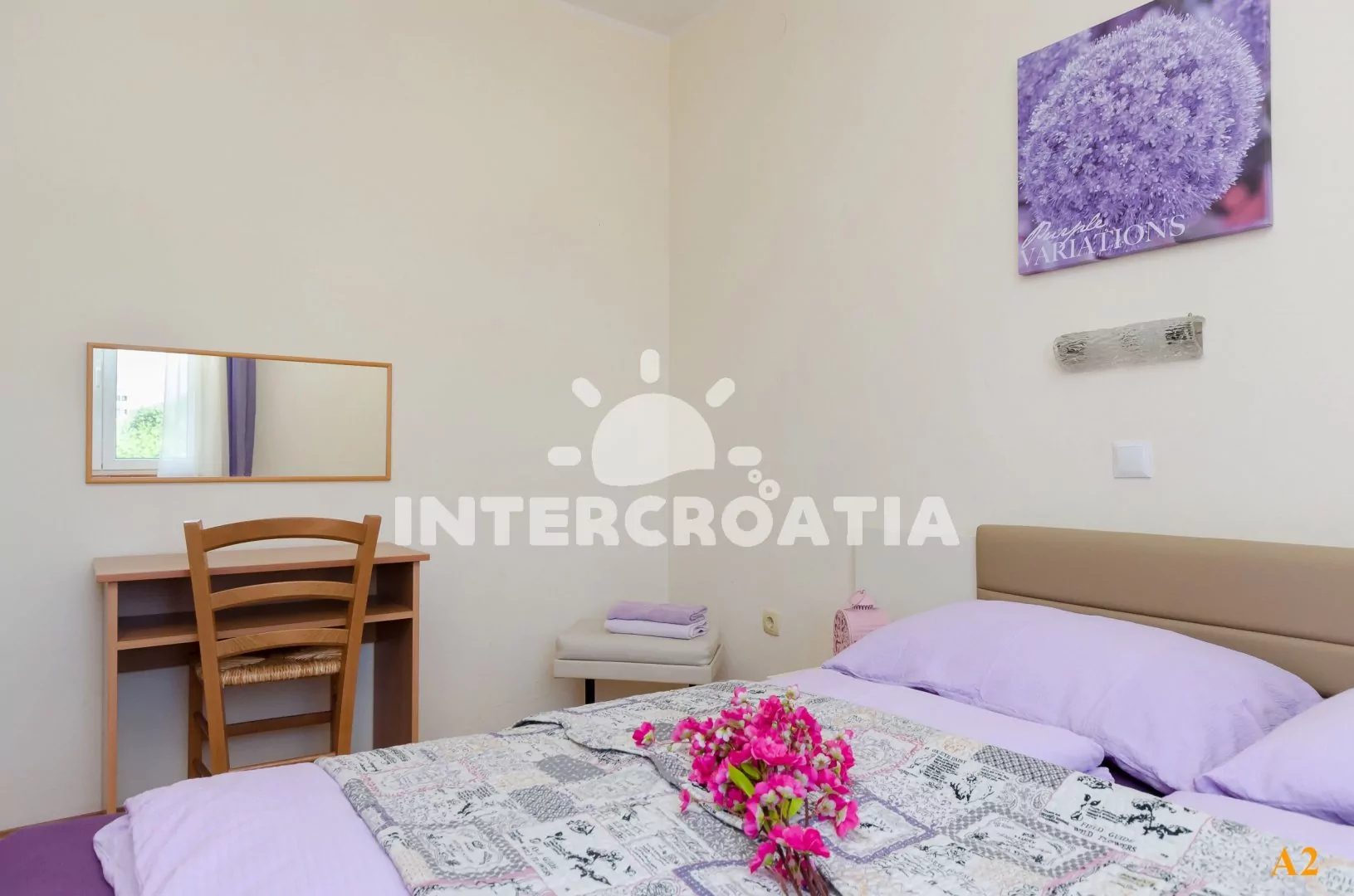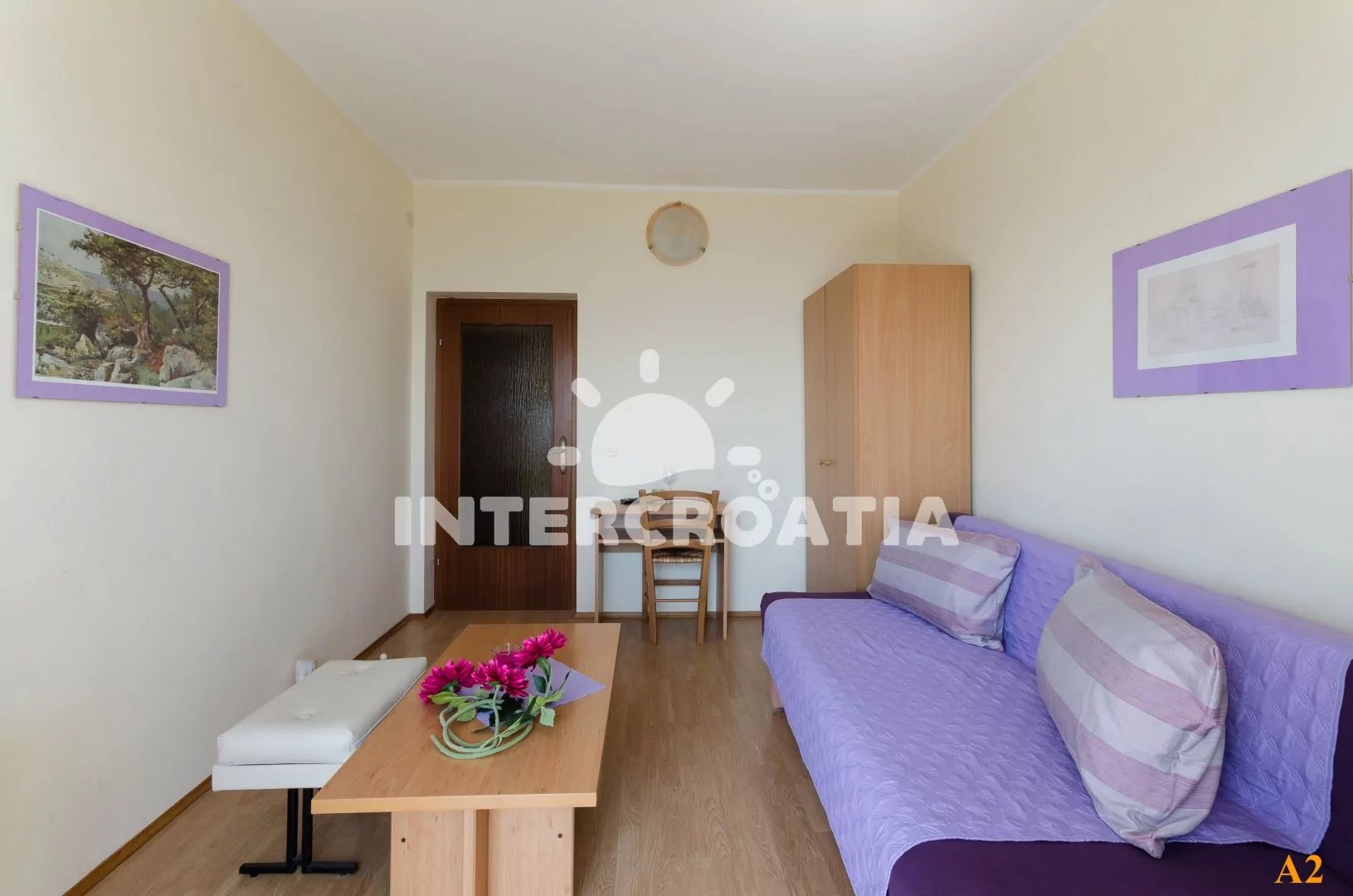 Apartmán s výhledem na moře pro 2 až 4 osoby se nachází v přízemí domu. Obývací pokoj oddělený od kuchyně. Kuchyňská linka s dvouplotýnkovým sporákem, digestoří, rychlovarnou konvicí, kávovarem, nádobím a lednicí s mrazákem. Obývací pokoj s jídelním stolem, rozložitelnou pohovkou (extra lůžko pro 2 osoby), televizí se satelitním programem, klimatizací a vstupem na balkon. Ložnice s jedním dvoulůžkem. Koupelna se sprchovým koutem, umyvadlem a wc. Hostům je k dispozici parkování u objektu zdarma.