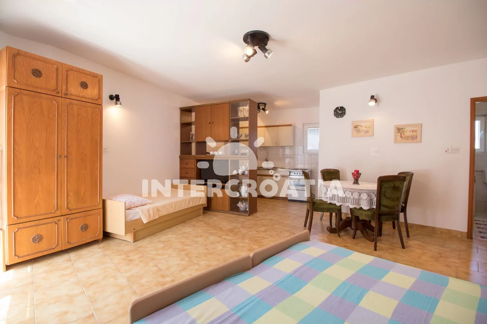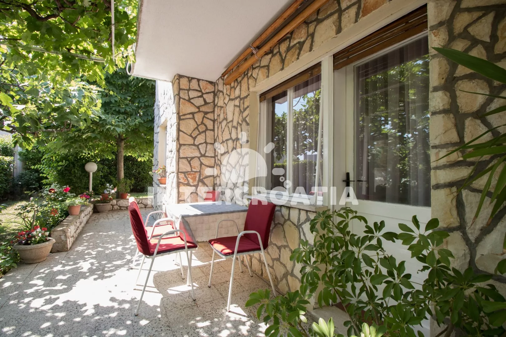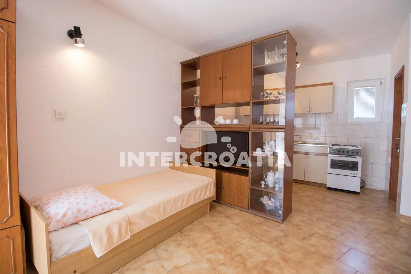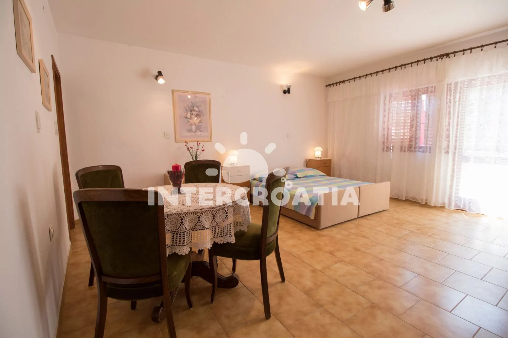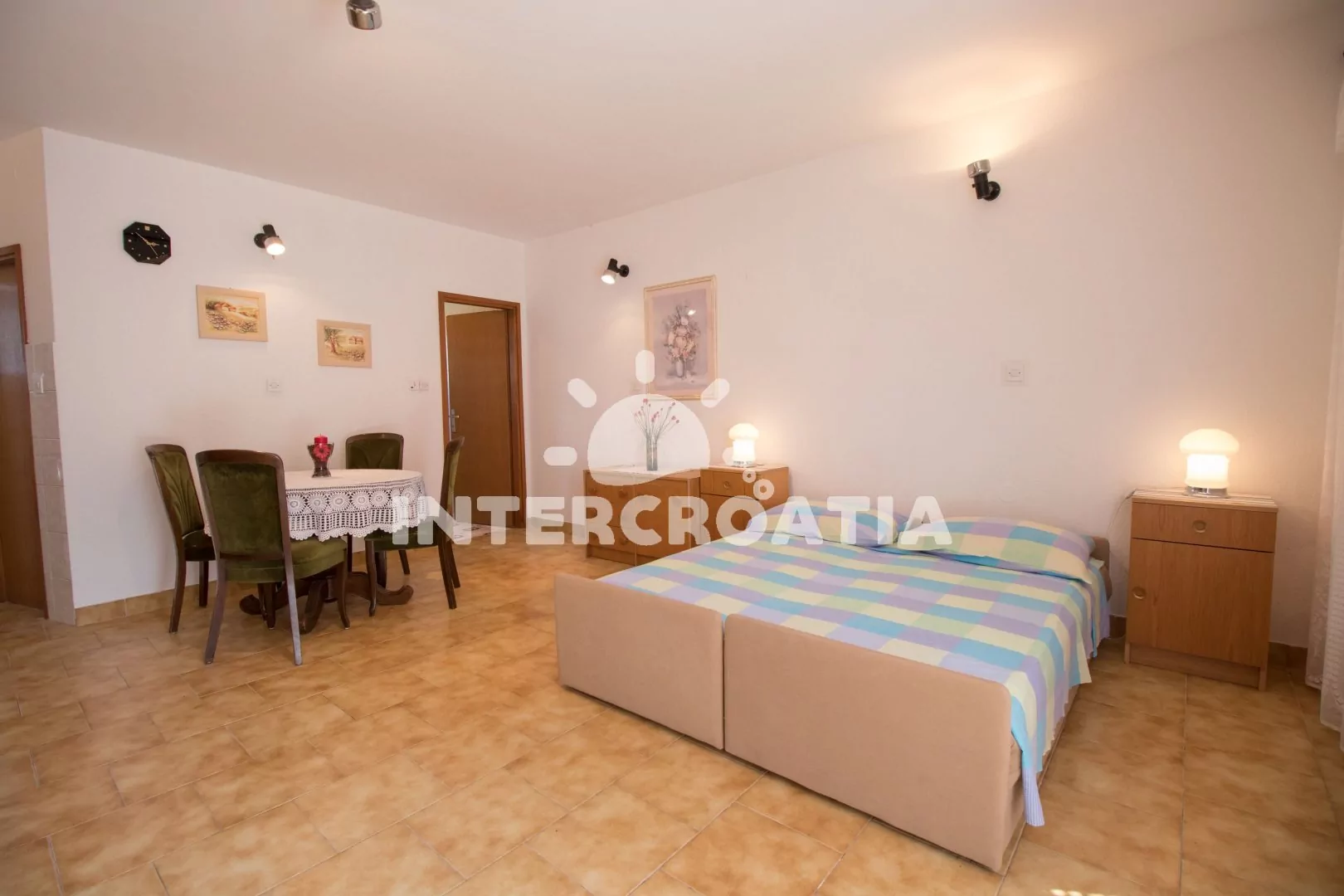 Apartmán typu studio s terasou, nachází se v přízemí domu a je vhodný pro 3 osoby. Kuchyňský kout je vybavený sporákem, troubou, kávovarem, mikrovlnnou troubou, rychlovarnou konvicí, nádobím a lednicí s mrazákem. Obývací část s jídelním stolem pro 4 osoby, televizí se satelitním programem, jedním dvoulůžkem, jedním jednolůžkem, klimatizací a vstupem na terasu. Koupelna se sprchovým koutem, umyvadlem, pračkou a wc. Hostům je k dispozici parkování u objektu zdarma.